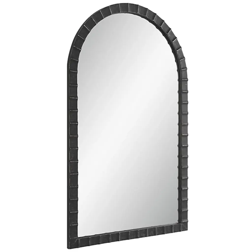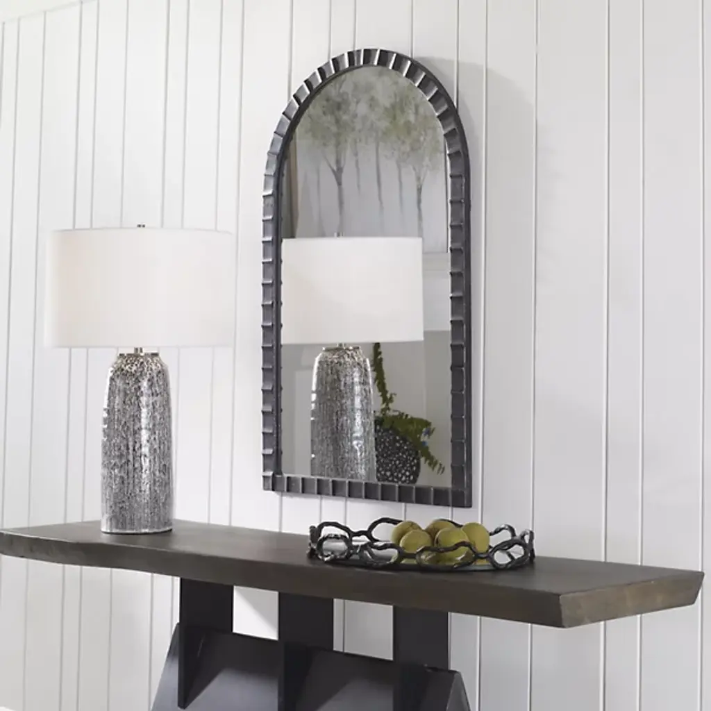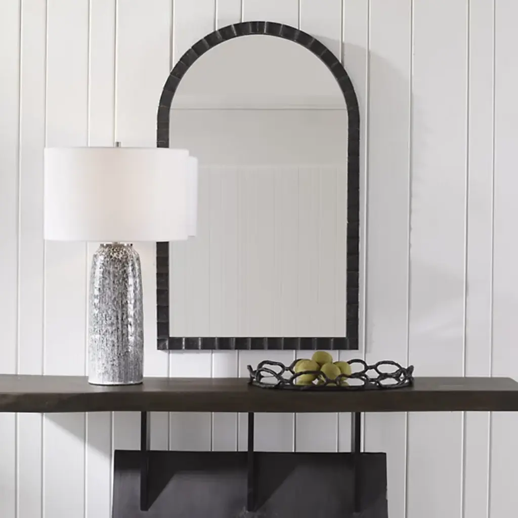 The Dandridge Arch Mirror from Uttermost reflects light with a rustic midcentury style. Forged by hand, a textural iron frame displays noticeable ridges and a contrasting finish surrounding the arch-shaped mirror, ascending from angular corners to a curving top. The construction is distilled to its simplest elements, accented with a touch of industrial expressiveness, creating a memorable vintage appeal with its slim handcrafted frame and sleek mirror design that boldly blends eras.