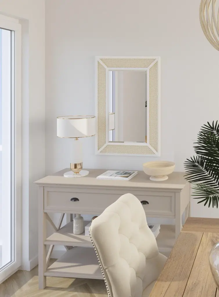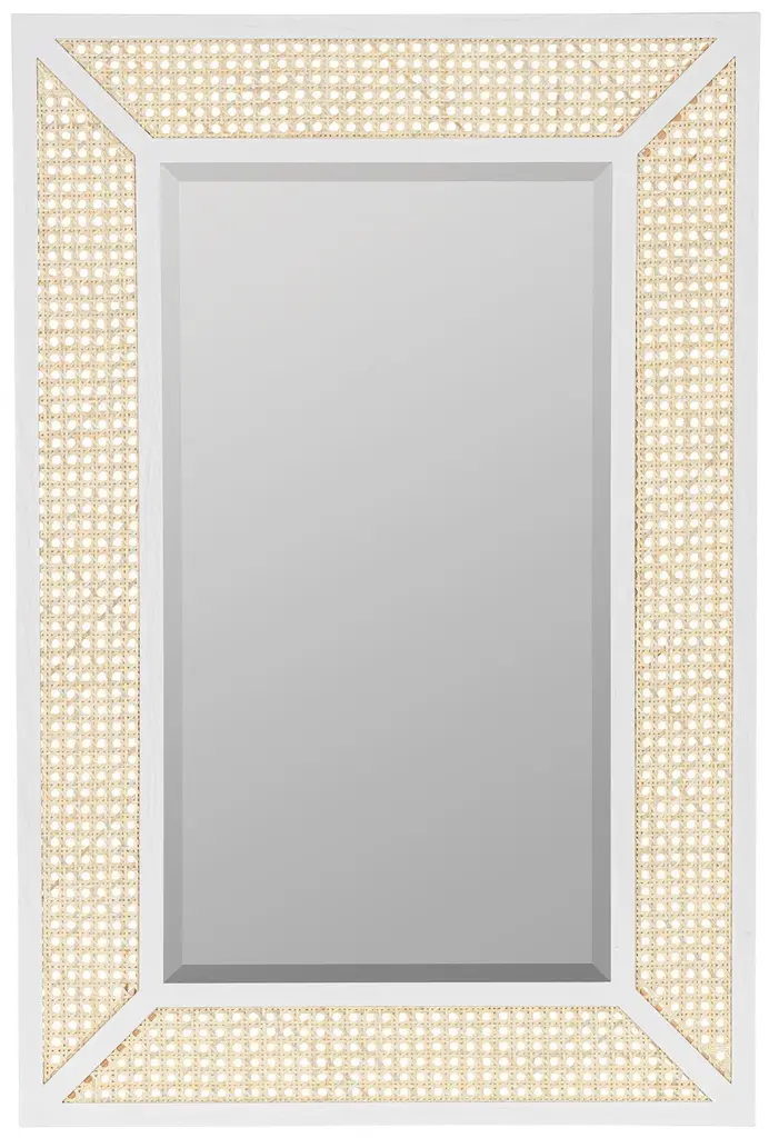 The beautiful Dani wall mirror features intricate details and a modern look. This piece is sure to add a statement to a space of any style! Finish: Natural Cane with White Wood Finish Material: Cane Glass Dimensions: 26.50x14.50 Hangs Both Ways: Yes Beveled: Yes Use Case: Commercially Approved, Outdoor/Damp-rated. Installation: Ready-to-hang with included, D-Ring Hangers. Details: Hand-crafted Frame, Hand-crafted Finish Care: Wipe Clean with a damp, microfiber cloth.
