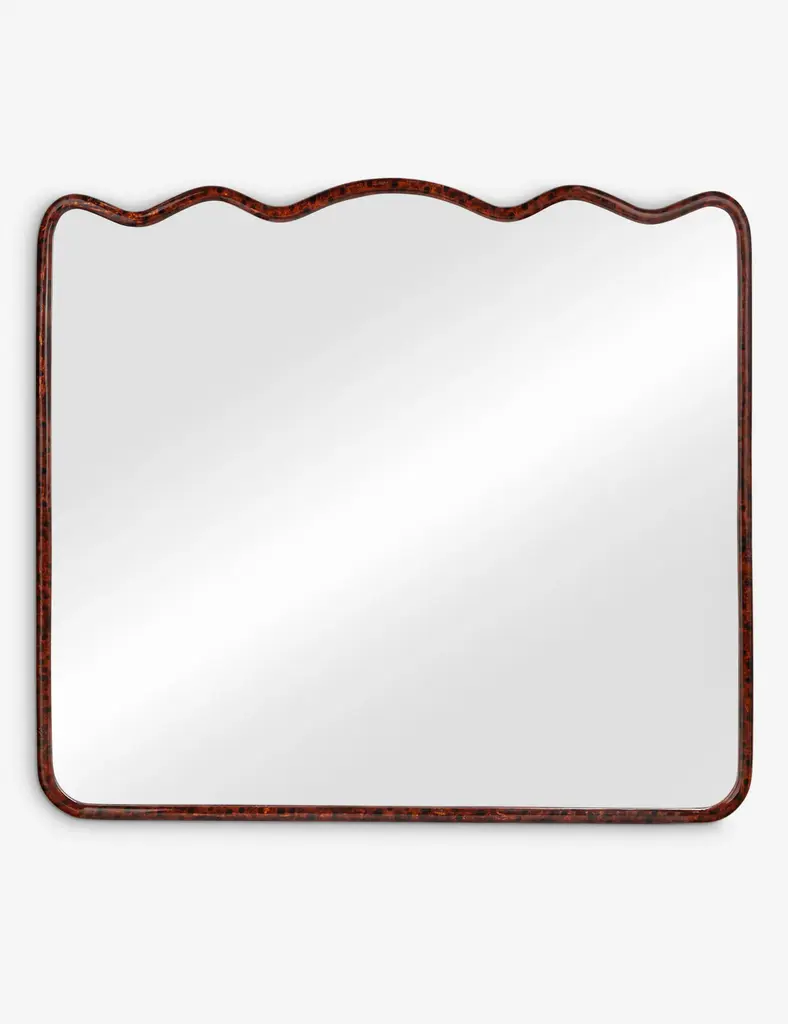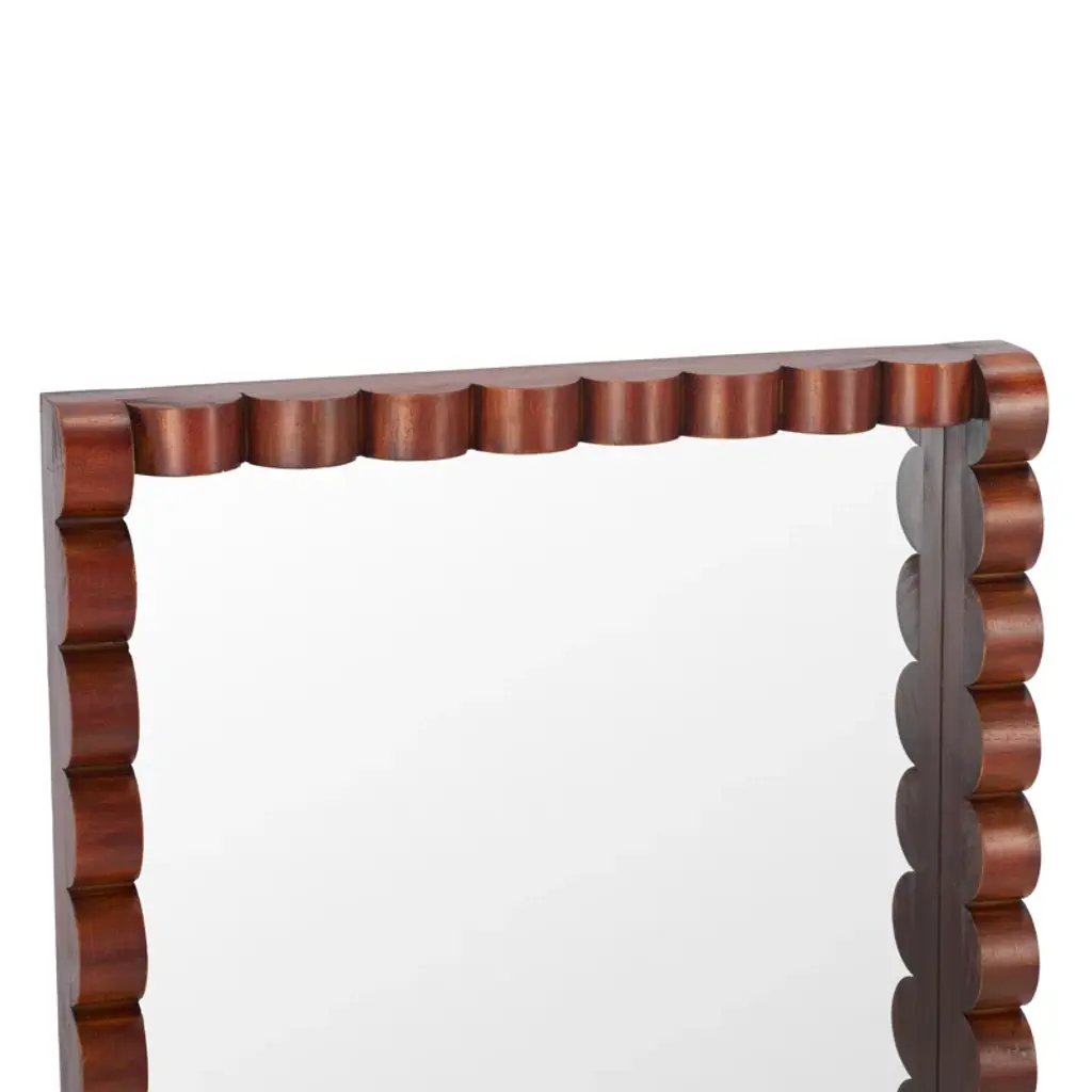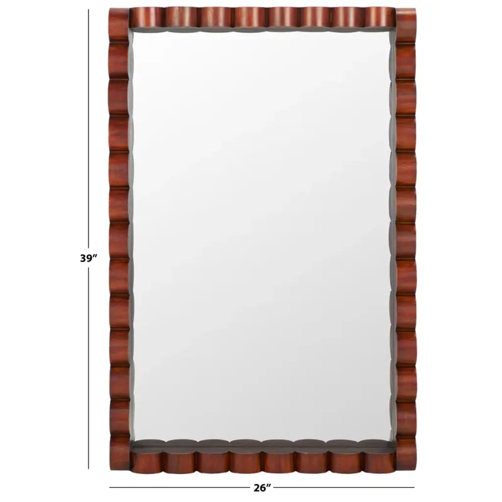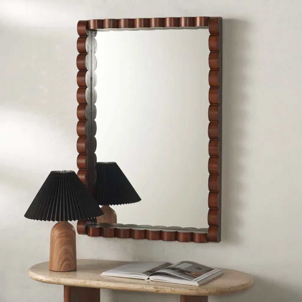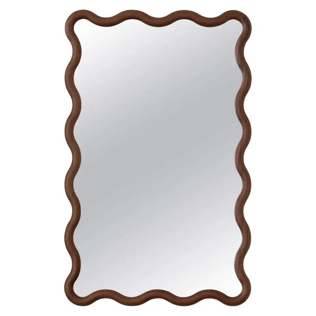 Introducing the mirror, a sophisticated addition to any interior space, beautifully crafted in a rich walnut hue with the natural appeal of pinewood and firewood. This elegantly designed mirror features a unique wavelike border along the frame, crafted from wood with a glossy finish that accentuates its deep, warm tones. The undulating, sculptural contours of the frame create a rhythmic, flowing effect that brings dynamic visual interest to the piece, making it a perfect complement to both contemporary and traditional decor. With its generous size and reflective clarity, the mirror serves as a functional piece for your daily routine while adding a touch of aesthetic warmth to your room. Designed with care, this mirror is not only an attractive element for your wall but also a testament to tasteful craftsmanship. Invite the mirror into your home or office space, and enjoy the blend of practicality and style that it offers. Whether you are looking to enhance natural light, create the illusion of space, or simply add a stylish touch to your wall, this mirror is sure to meet your needs with grace and charm.