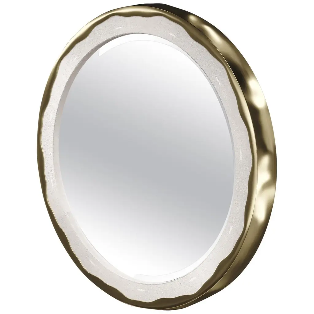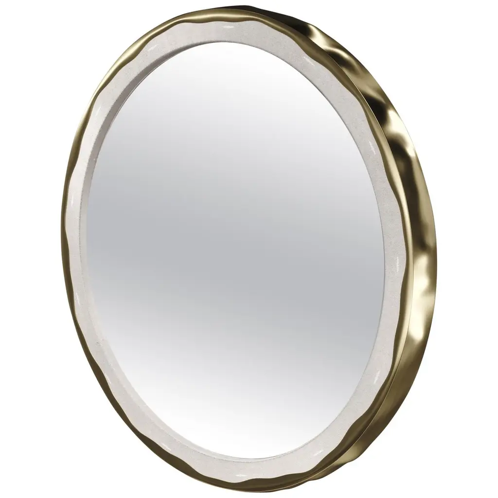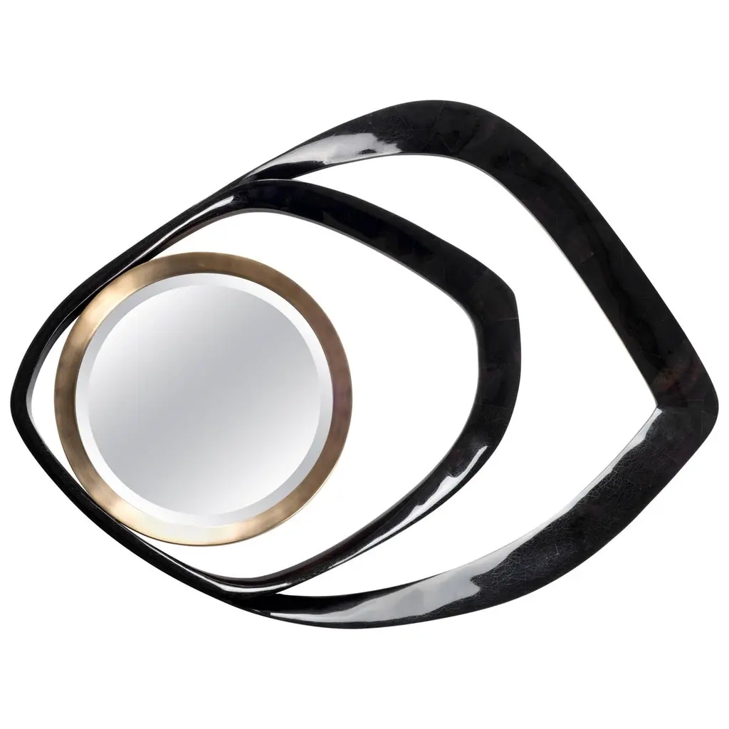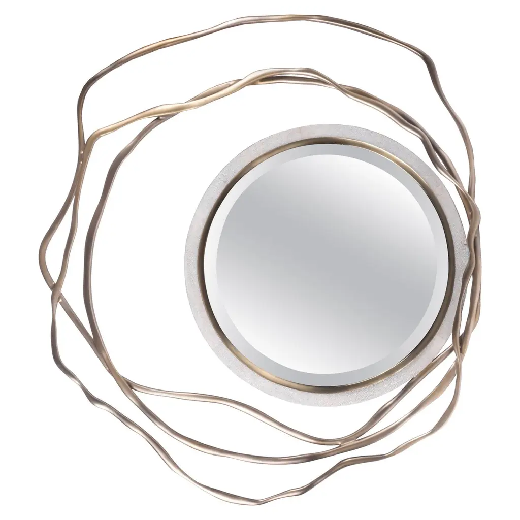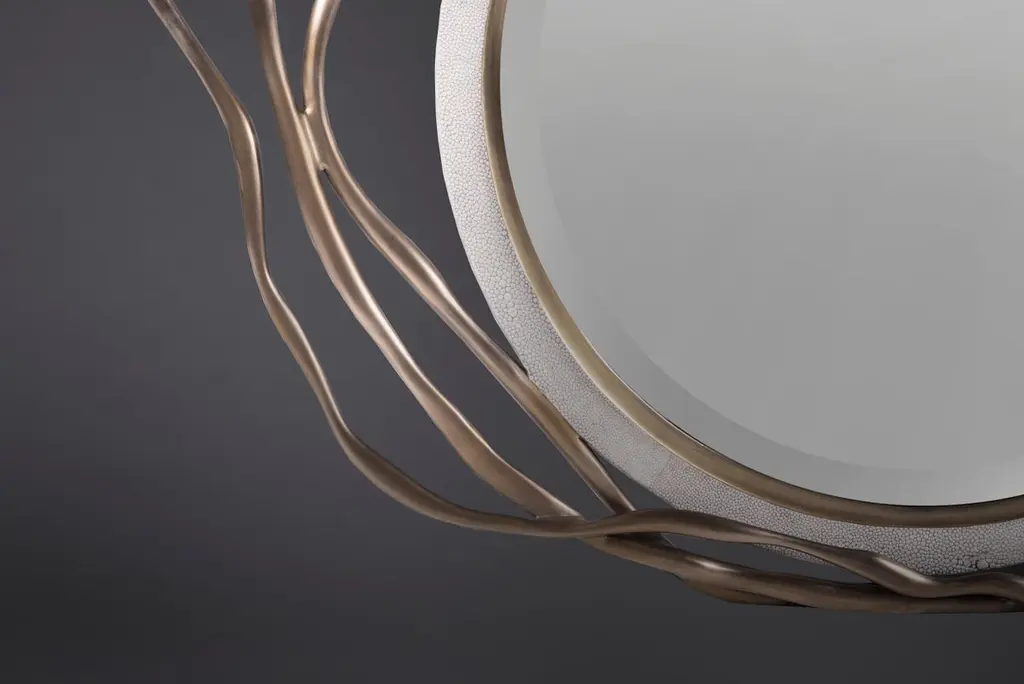 The Paris based label has distinguished themselves since their launch, with their iconic use of shagreen mixed with brass and other exotic materials. All furniture is handcrafted by skilled artisans, ultimately making each piece unique, designed in Paris and produced in the Philippines.The Dargelos Mirror is a statement piece with its ethereal inspired roots. The intertwinement of the twisted bronze-patina brass wires, against the circular cream shagreen frame of the mirror creates a truly whimsical feel, white retaining it's elegance. The shagreen is hand-dyed by artisans creating a one of a kind piece each time. This piece is designed by Kifu Augousti, the daughter of Ria and Yiouri Augousti. The dimensions of these pieces are: 80 x 80 x 3 cm / 31.5 x 31.5 x 1.25”All Kifu Paris pieces are handmade by artisans, ultimately making each piece unique. Custom color or sizing available on request.Wipe clean with soft dry cloth.Although inspired by her parents, her collection of home accessories and furniture is a distinct identity of its own. Kifu uses handmade techniques of elaborate inlay patterns of shagreen, shells, semi-precious stones, materials she experienced as a child growing up in her parent’s studio, but interpreted in a younger quirkier way reflecting her youth. From her "jewelry inspired knobs" on decorative boxes, gold bar boxes and an extravagant inlay pattern mix of shagreen and shell inspired by galactic constellations, as seen on her enormous round mirror, is refreshing to see. Kifu embodies whimsical elements throughout her collection and is not afraid to be daring and unexpected in her approach to design.All shagreen-covered items should be kept out of direct sunlight, color variants may occur on the stingray and other exotic finishes, but this showcases the Parisian label's commitment to creating authentic luxurious products using natural components.