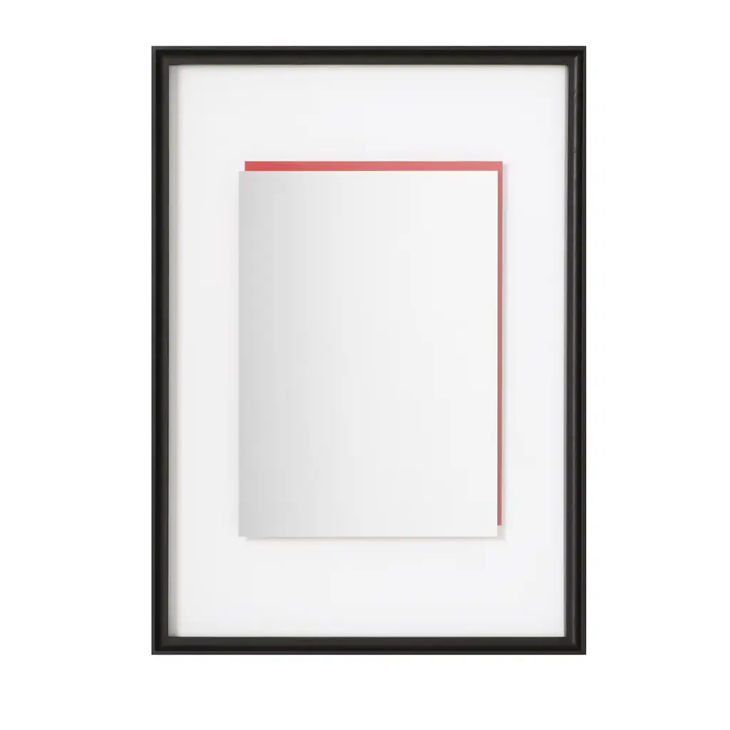 The mirrors are ingeniously designed hybrid objects, combining premier engineering and carpentry skills. Sixteen unique pieces, each set in its own black or white ashwood frame. Every piece is composed of two sheets of glass, 12mm apart. The front face is silvered, the back being colored orange, blue, or red. These colors are reflected in the second mirror, to create a subtle interplay of shapes. The frame comes apart so the mirrors can be cleaned.