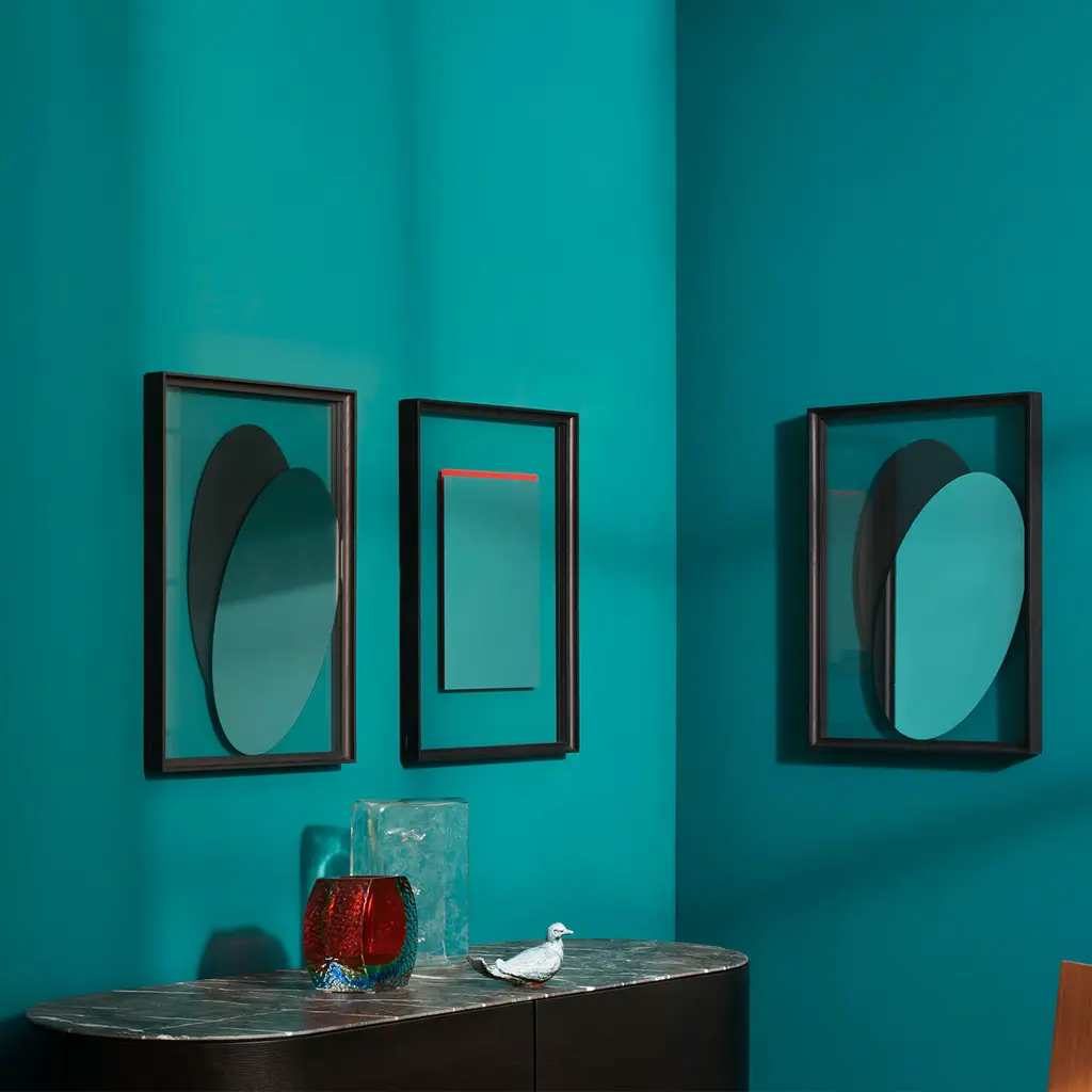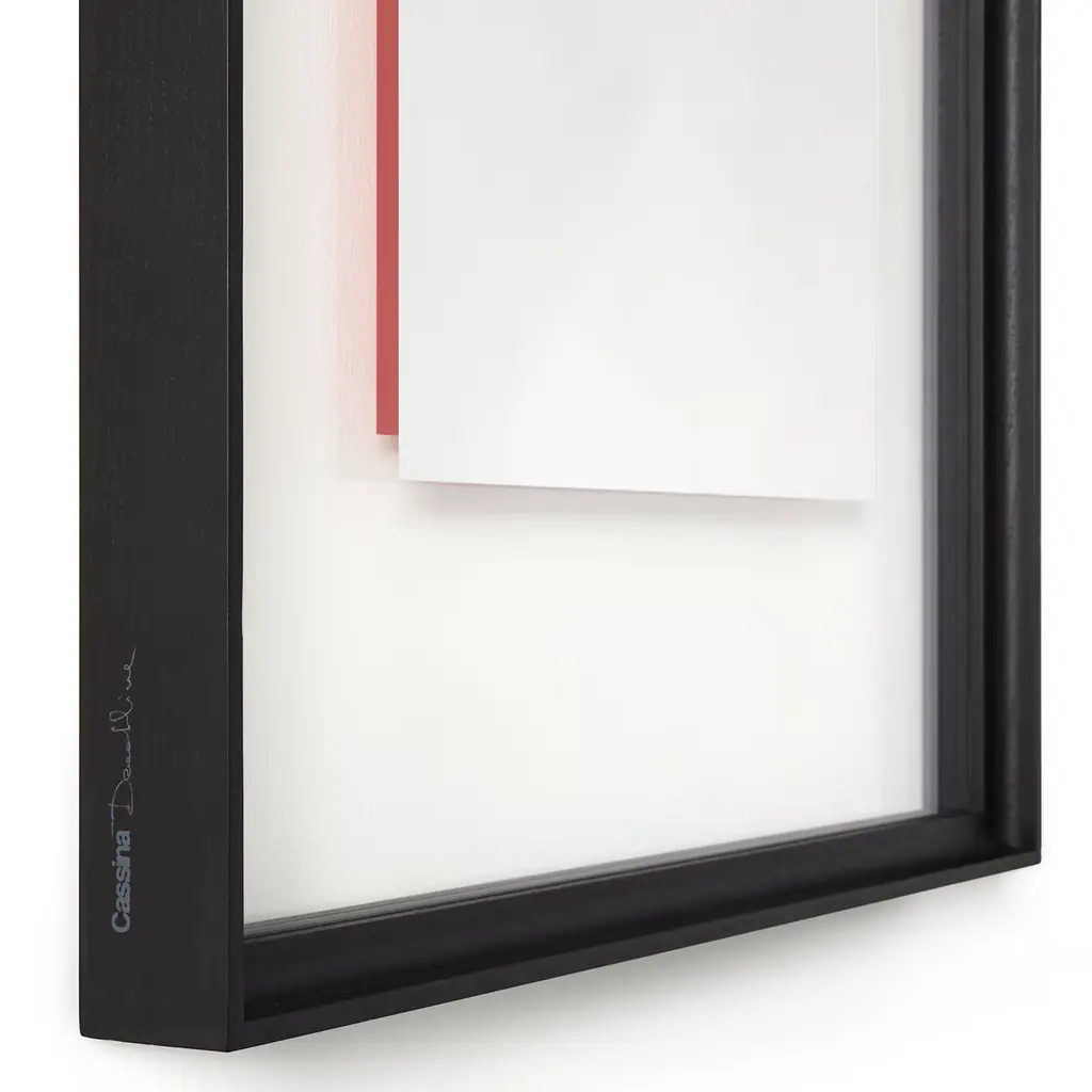 The mirrors are ingeniously designed hybrid objects, combining premier engineering and carpentry skills. Sixteen unique pieces, each set in its own black or white ashwood frame. Every piece is composed of two sheets of glass, 12mm apart. The front face is silvered, the back being colored orange, blue, or red. These colors are reflected in the second mirror, to create a subtle interplay of shapes. The frame comes apart so the mirrors can be cleaned.