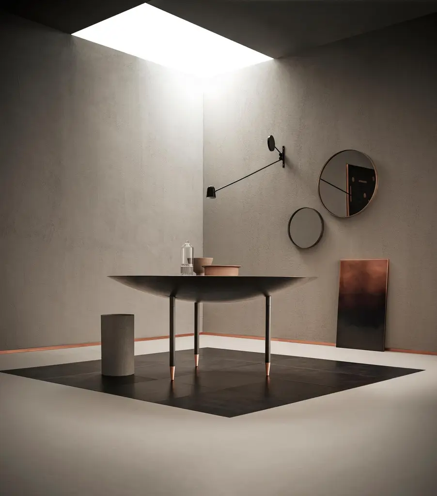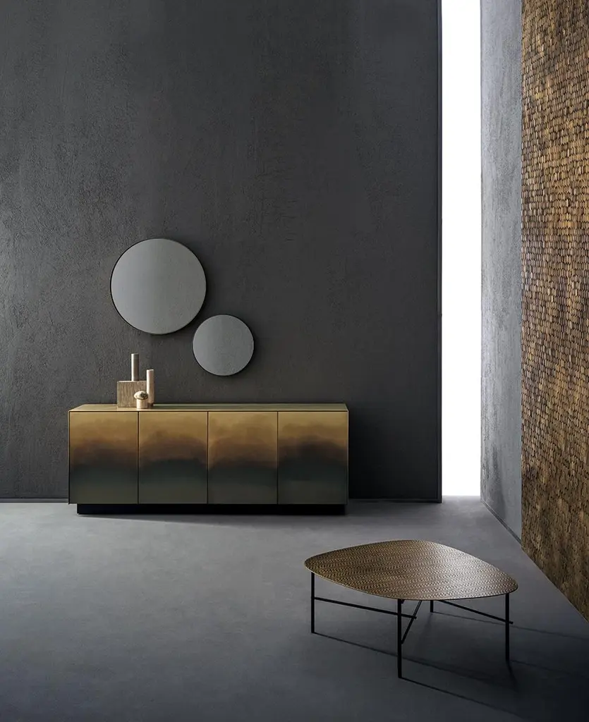 Like a ballerina on her toes, Elizabeth gracefully unfurls her luminous dress, as if made of pleated fabric. The characteristic folds add movement to the metal sheet along the surface of the cabinet, transforming each reflection into light. In an interplay of airiness and tension, elasticity and rigour, the metal vibrates with the rhythm of its pleats. Available in steel, brass or copper, Elizabeth gives shape to a new way of imagining unambiguously feminine metal furniture.Additional Information: Material: Brass structure frame and mirrorFinish: Orbitale DeLabré brass G3Dimensions: Ø. 90 x D. 5 cmAvailable in other color options: Orbitale DeLabré stainless steel G2Available in other size options: Medium & small