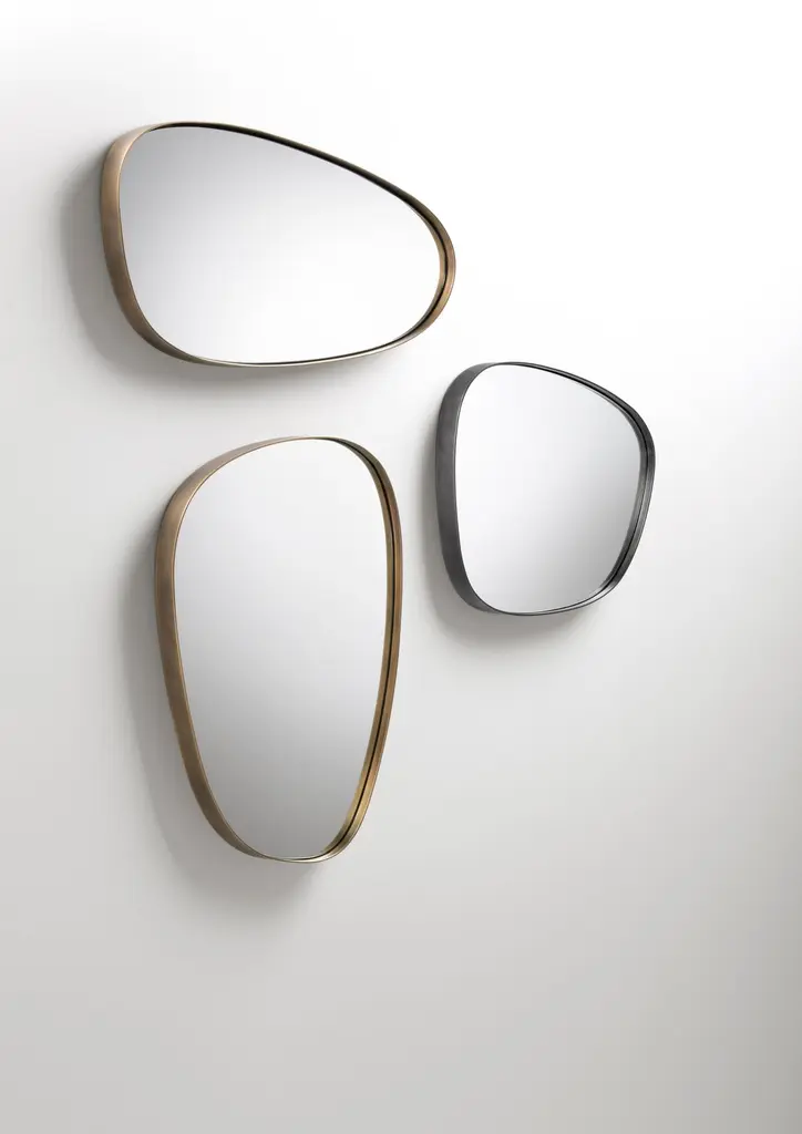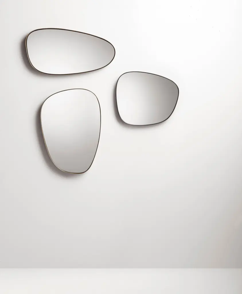 Syro Mirror echoes the organic silhouettes of the entire Syro collection, translating them into mirrored surfaces that, surrounded by thick iron and brass frames, mimic the natural outlines of petals. In a mix of chromatic effects obtained from various metal treatments, these multifaceted shapes can be arranged as desired, on their own or one next to another. The organic nature of the collection is thus amplified, revealing the multiple ways they can be combined on the wall, to surprisingly dramatic results. Additional Information: Material: Brass and mirrorFinish: DeLabré orbital G3 brassDimensions: W. 76 x D.5 x H. 54 cmAvailable in other color options: Stainless steel