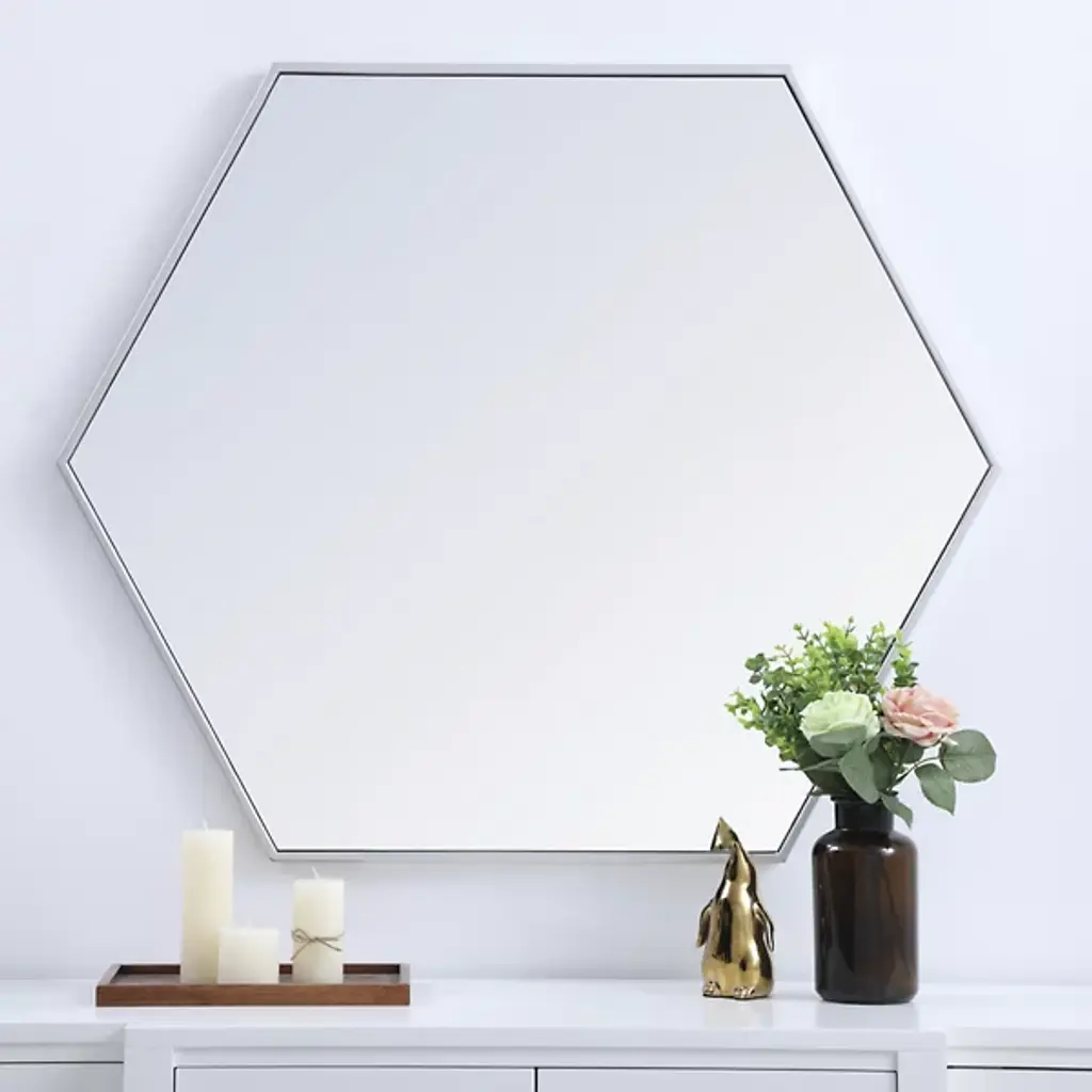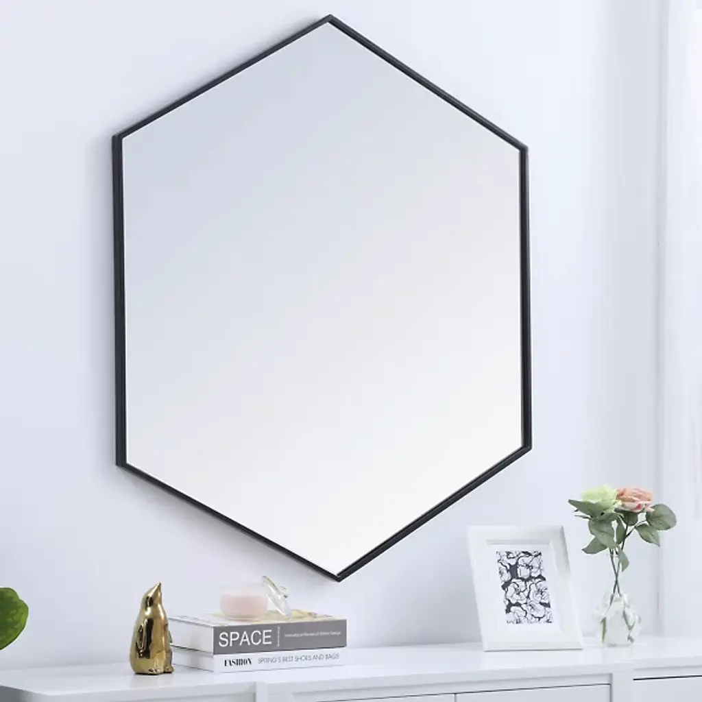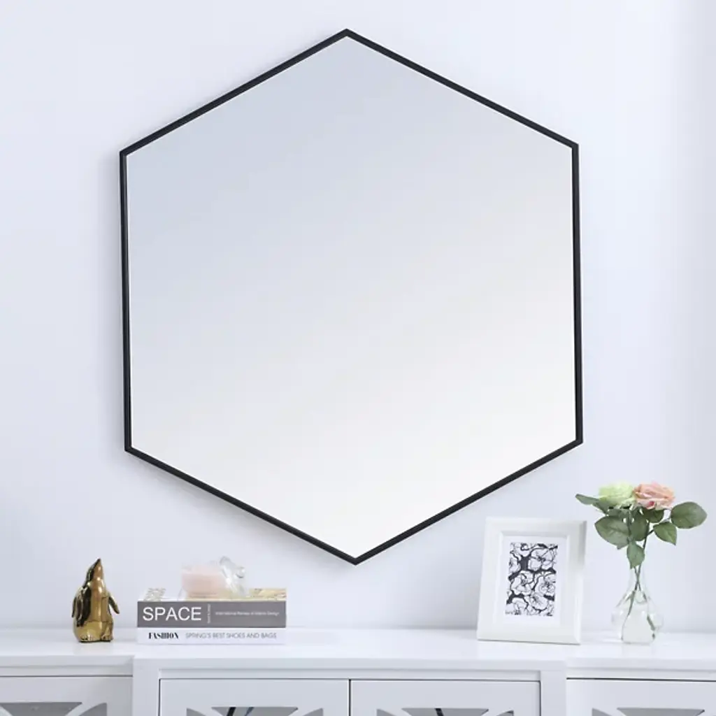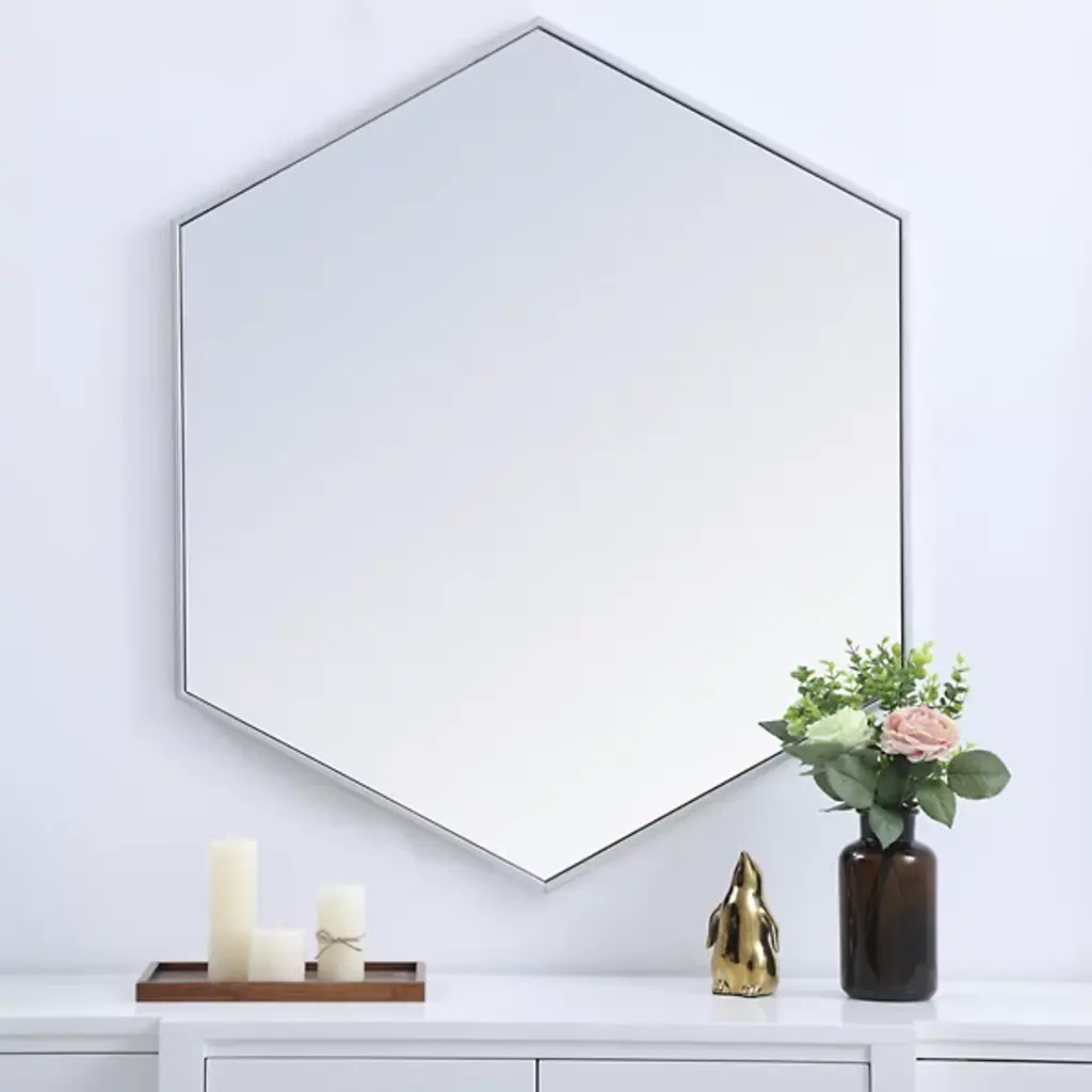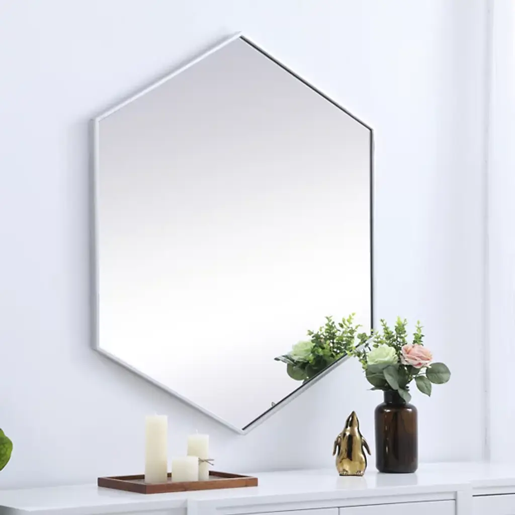 The Decker Hexagon Wall Mirror from Elegant Lighting brings a playful style to your home. Its unique shape and contemporary flair create a captivating focal point, effortlessly complementing any decor. The clear mirror expands the visual space, while the slim metal frame adds a hint of color, enhancing your room with a modern, lively vibe.