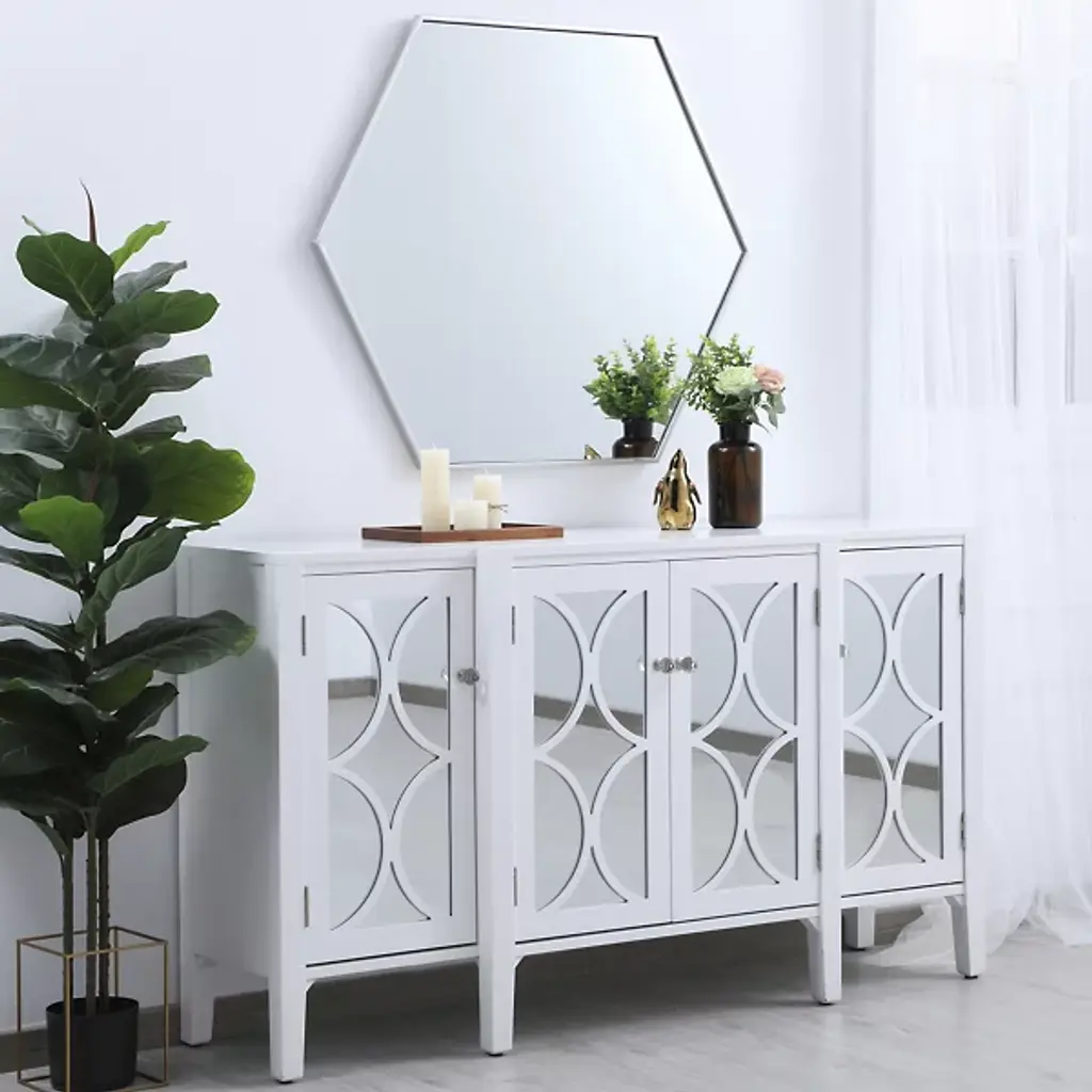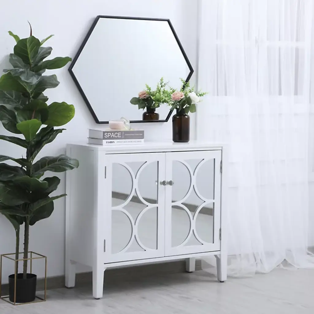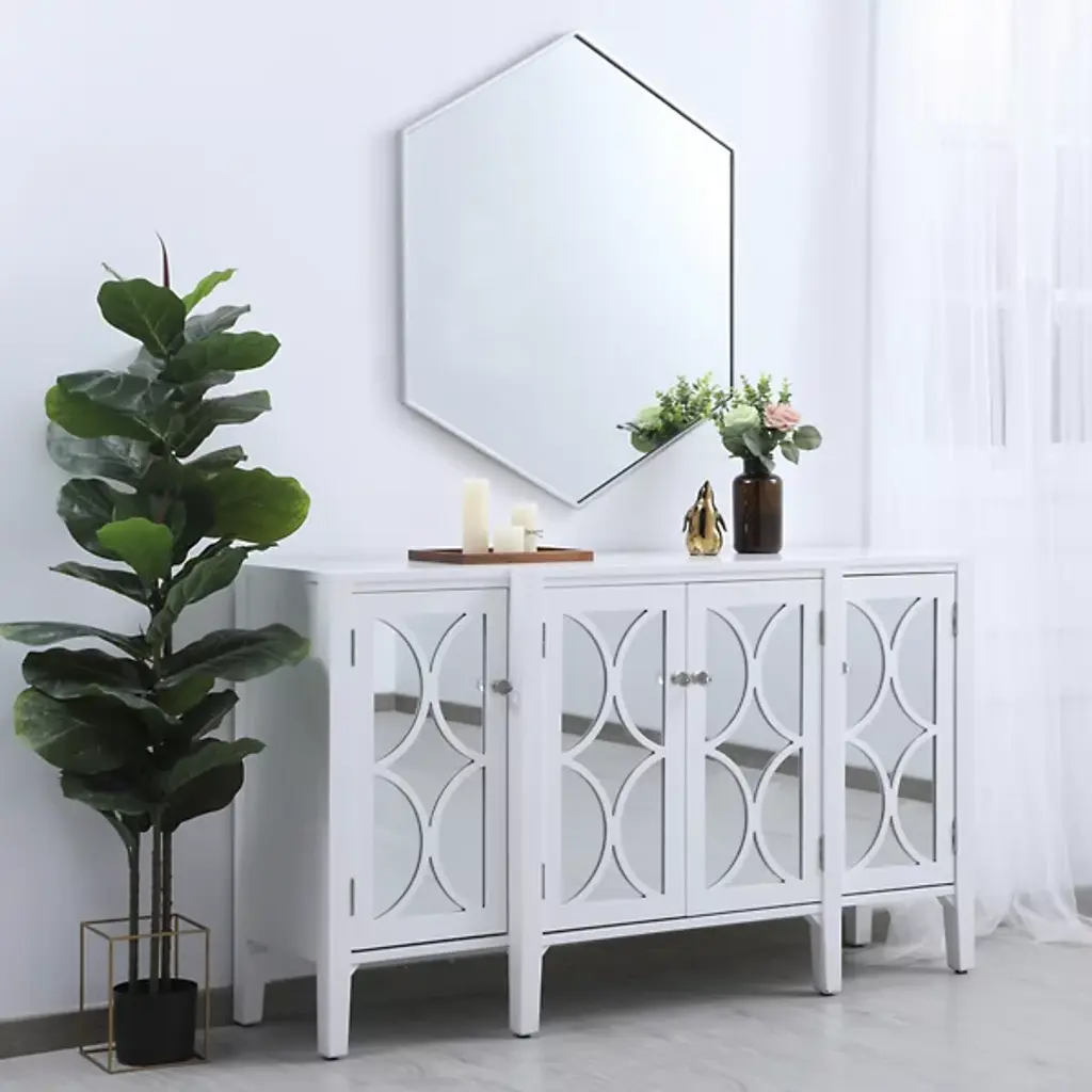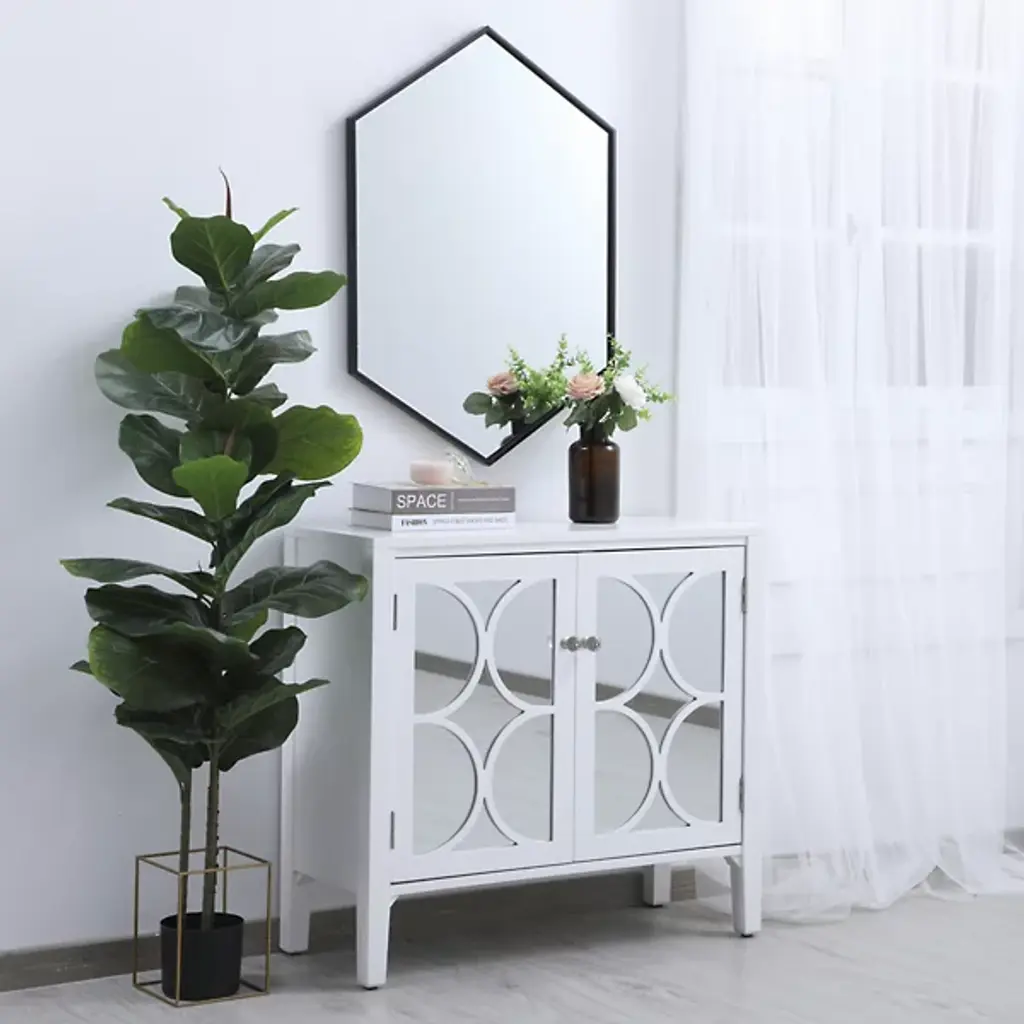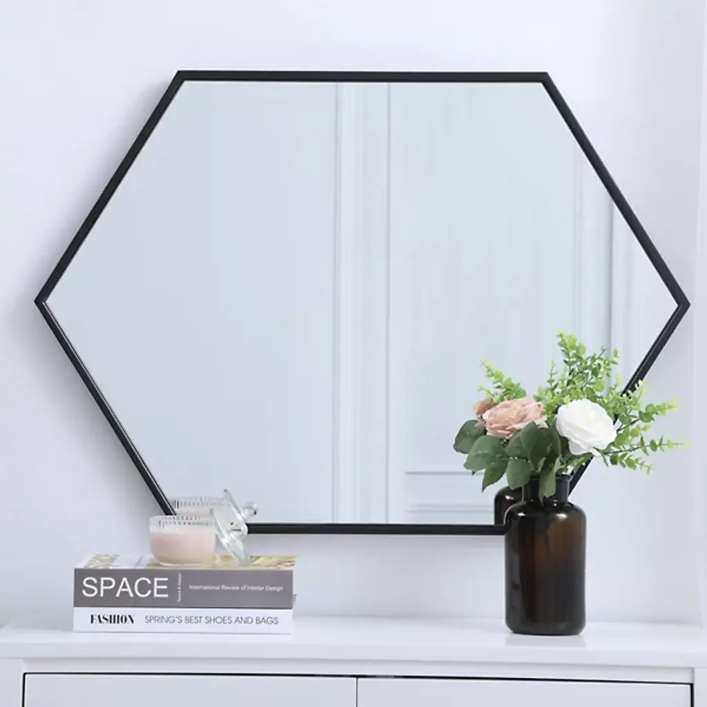 The Decker Hexagon Wall Mirror from Elegant Lighting brings a playful style to your home. Its unique shape and contemporary flair create a captivating focal point, effortlessly complementing any decor. The clear mirror expands the visual space, while the slim metal frame adds a hint of color, enhancing your room with a modern, lively vibe.