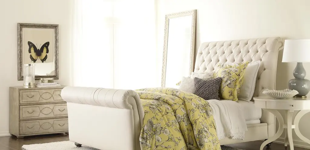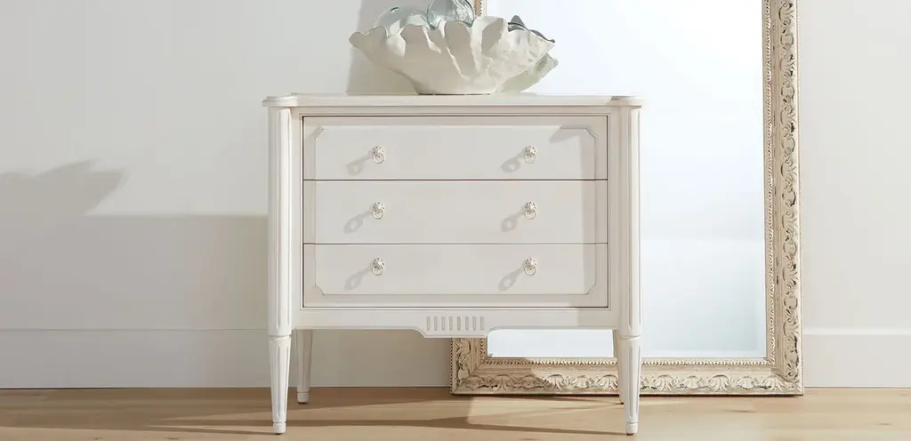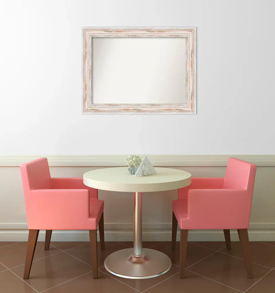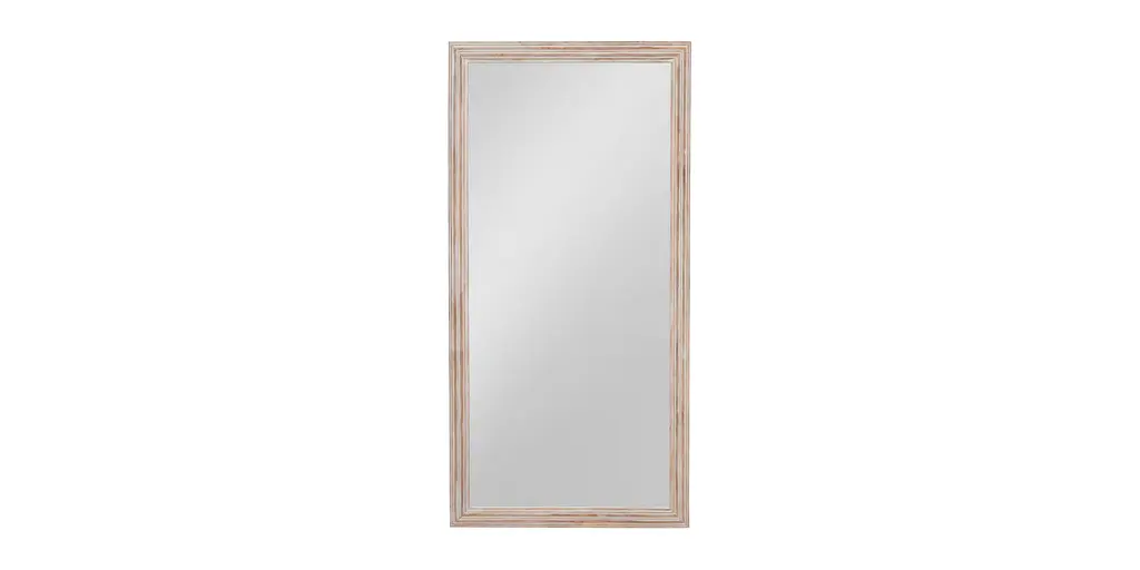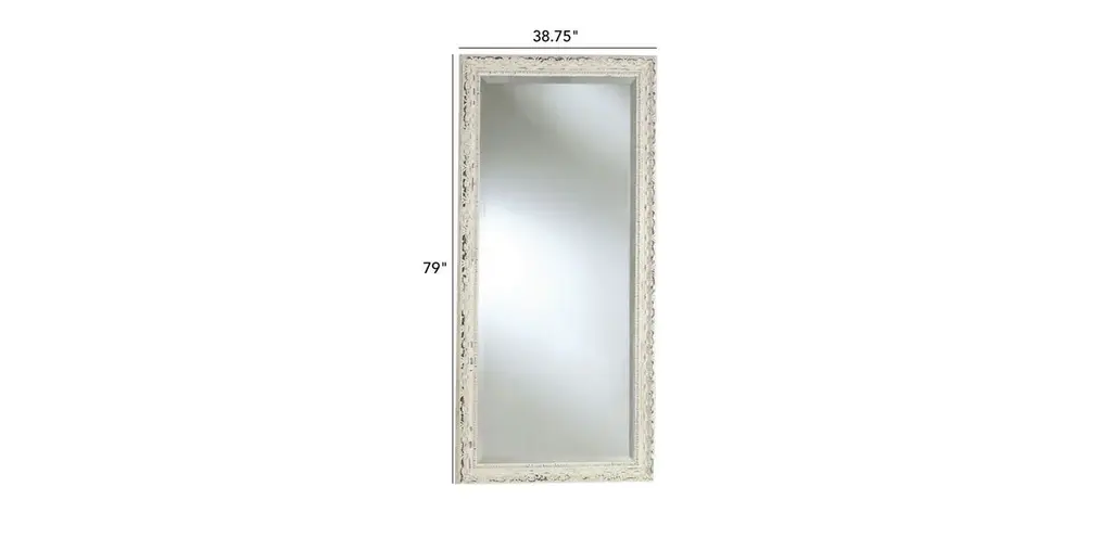Inspired by a flea market find, this floor mirror, more than six feet tall, makes a dramatic yet relaxed statement. Its wood and composite frame, finished in distressed white, has the look of aged wood peeking through. A 1½-inch bevel adds to its stature.