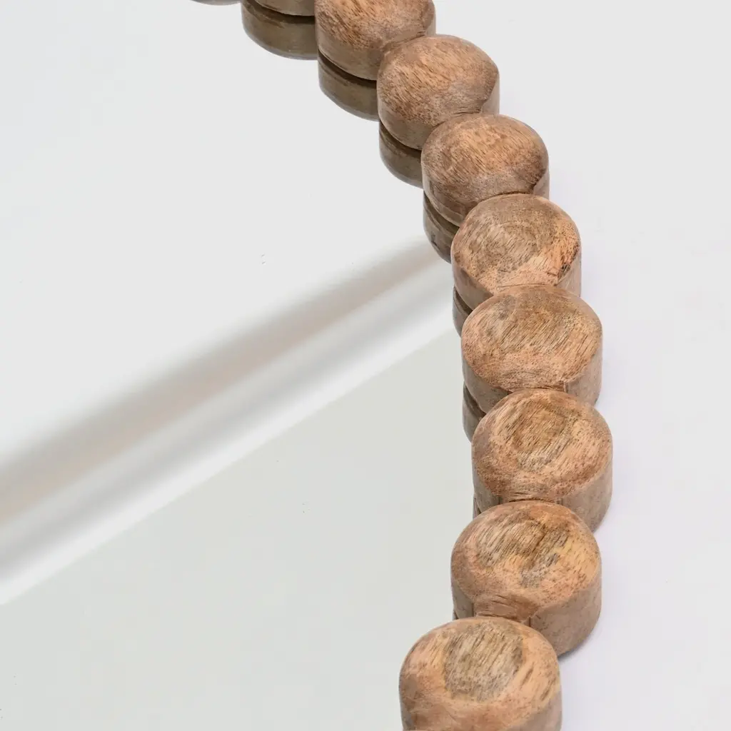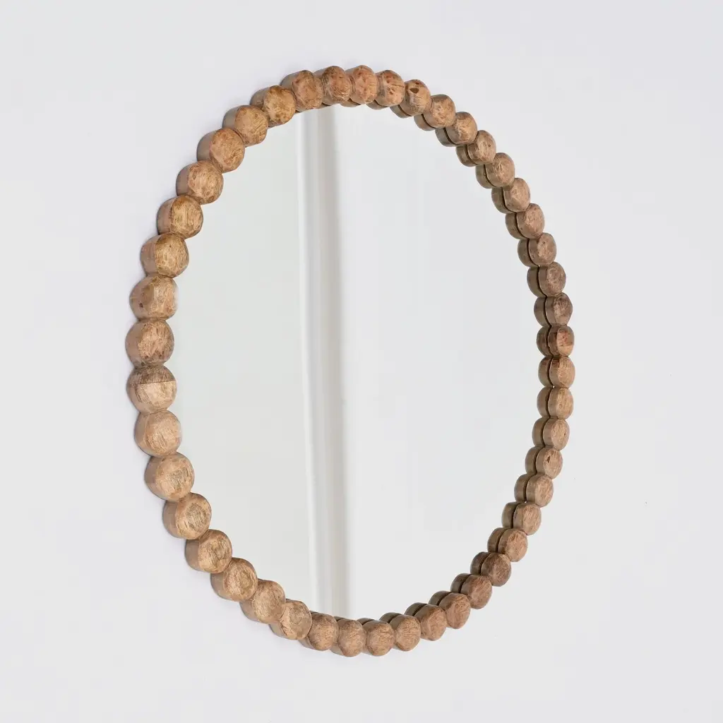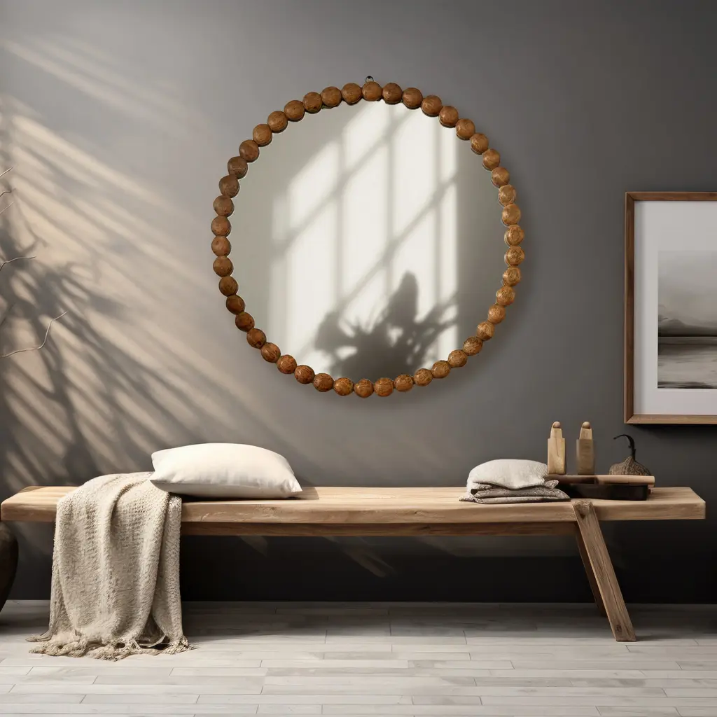 Bring elegance and organic charm into your home with this 32-inch Decorative Round Wall Mirror, beautifully encased in a natural wooden bead frame. Made from high-quality mango wood, each bead features unique wood grain and tone variations, adding texture, warmth, and a natural feel to any space. The mirror itself is crafted with a clear, 3MM non-beveled glass, offering a clean, minimalist reflection perfect for everyday use. This mirror effortlessly elevates a variety of interior styles—from bohemian and coastal to Scandinavian and rustic modern.