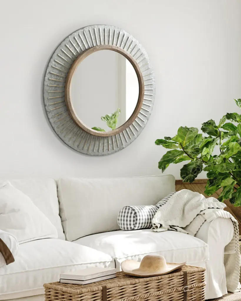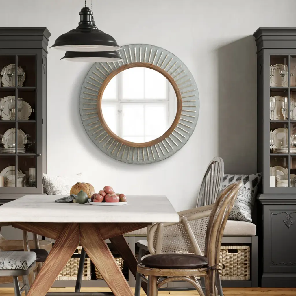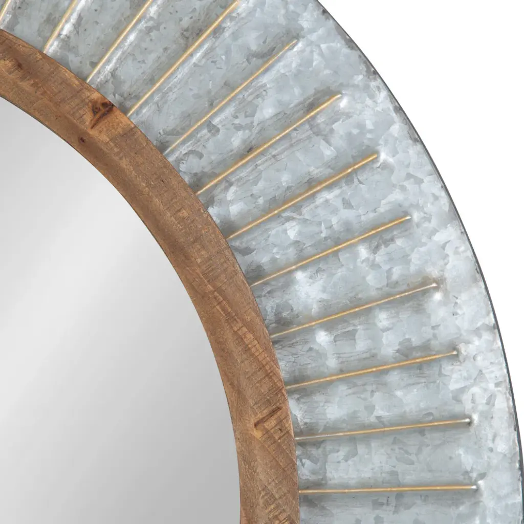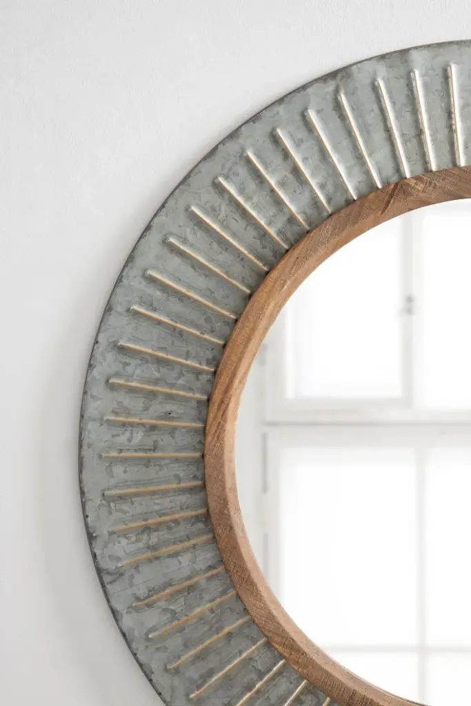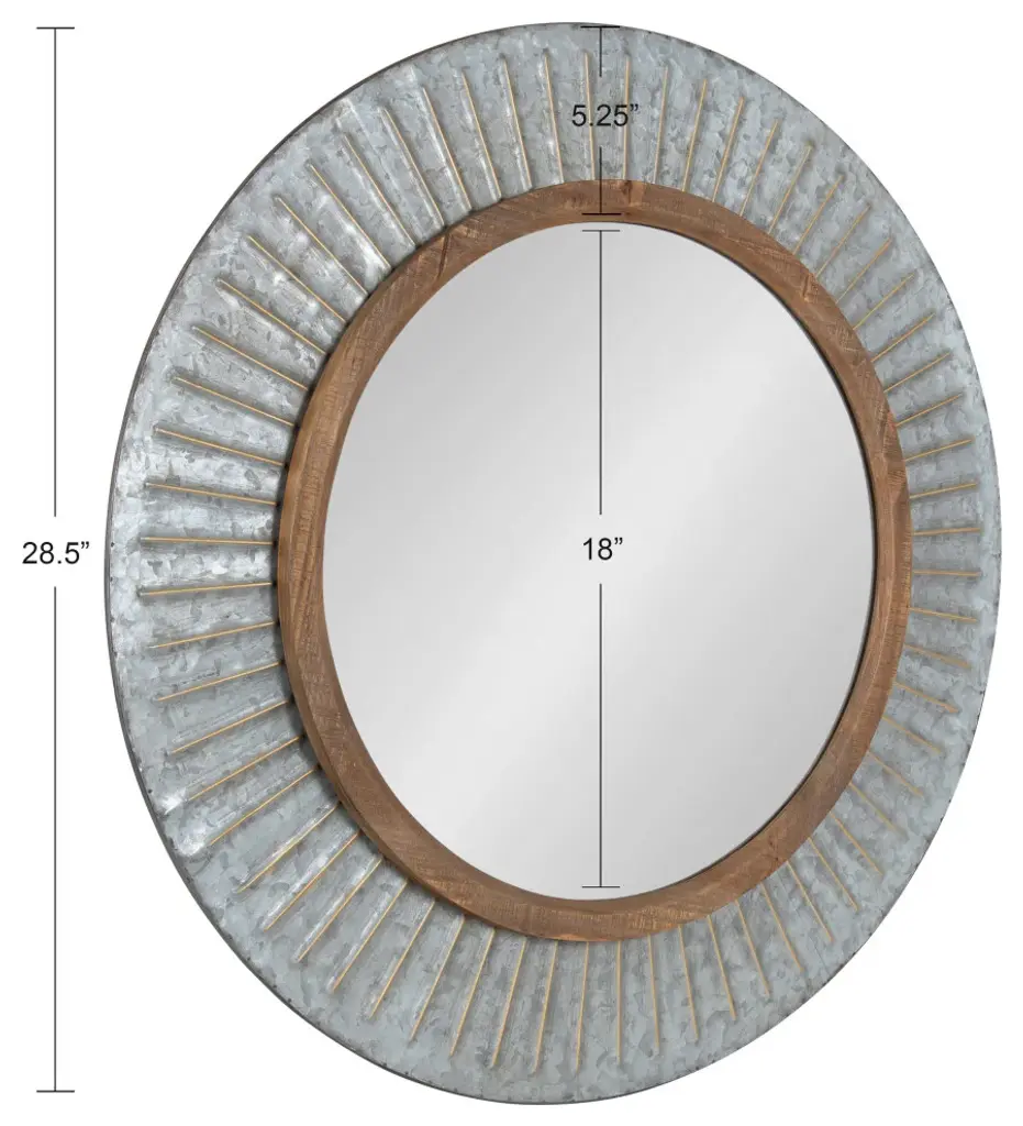 The Deely wall mirror''s vintage-inspired look brings a sense of old school rustic charm to your home. Inspired by farmhouse aesthetics, the Deely features a beautiful frame with a rustic brown finish, constructed from a blend of wooden material. Within the wood frame, you''ll find a bold, galvanized metal, reminiscent of a flea market find with a long, distinguished history. It''s a fantastic decorative piece to showcase your passion for antiquity and quality craftsmanship. This wall mirror''s overall dimensions are a 28.5 inch diameter, making it the perfect size for an entryway console, a living room mantle, or a bathroom vanity. Adding this mirror to your home not only enhances your farmhouse theme but makes your space appear brighter and more open, thanks to the generous surface area of the glass. The Deely will wow your guests and family alike no matter where or how you decide to hang this vintage accent mirror.• Rustic Look: This mirror was inspired by farmhouse aesthetics with a galvanized metal surrounding the glass and a rustic brown finish on the exterior frame• Quality Materials: The exterior frame was composed of a lovely wooden material surrounding an iron interior• Impressive Size: The overall dimensions of this sophisticated wall accent are a 28.5 inch diameter, making it fantastic for display over a console, mantle, or bathroom sink• Functional: This mirror not only brings a farmhouse look to your home but spreads light with its large surface area, making your space feel more open and vibrant• Easy to Hang: Use the metal hanger attached to the back to easily and securely hang the mirror