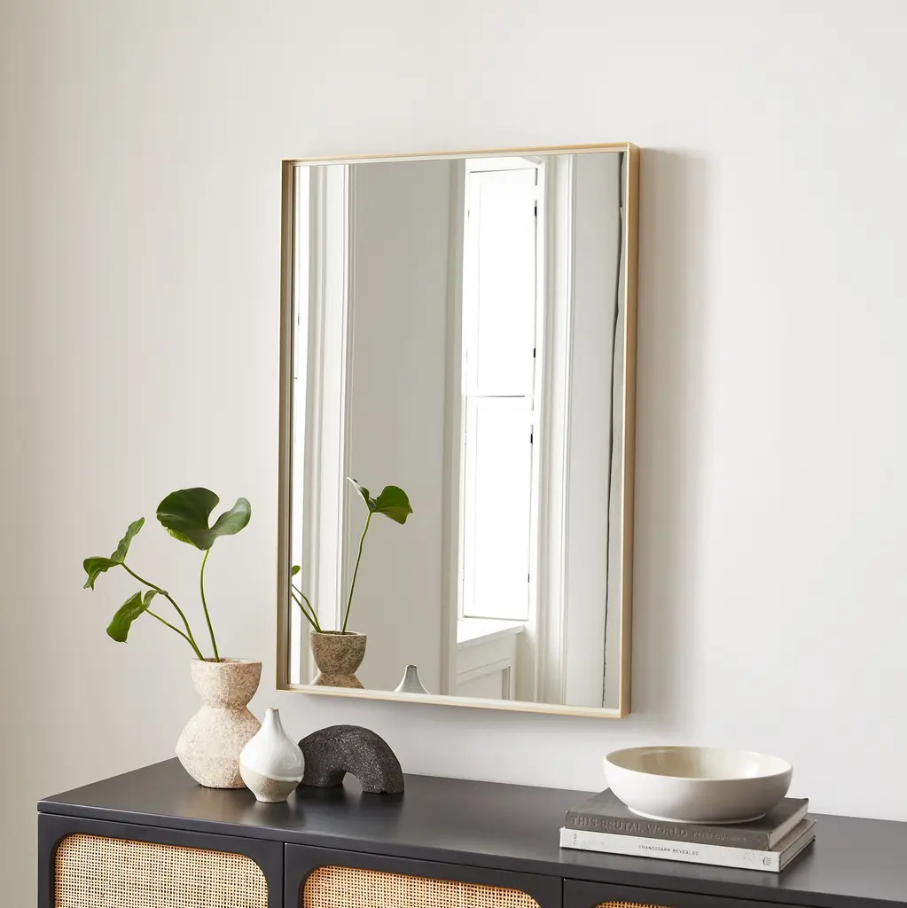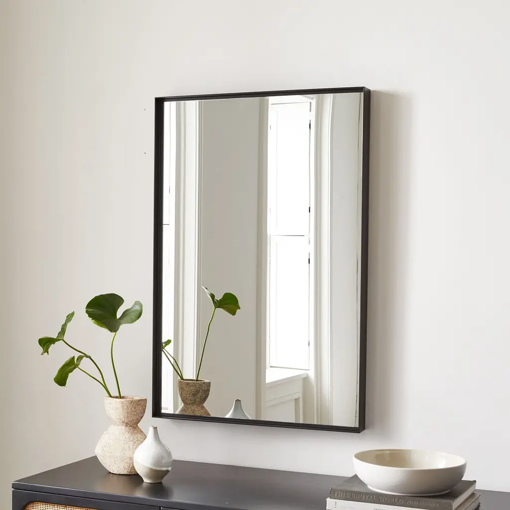 Its thin metal frame is a subtle statement. Quick and easy to hang with included hardware. Perfect for an entryway or bathroom.