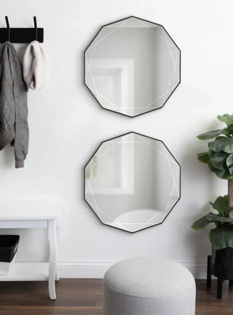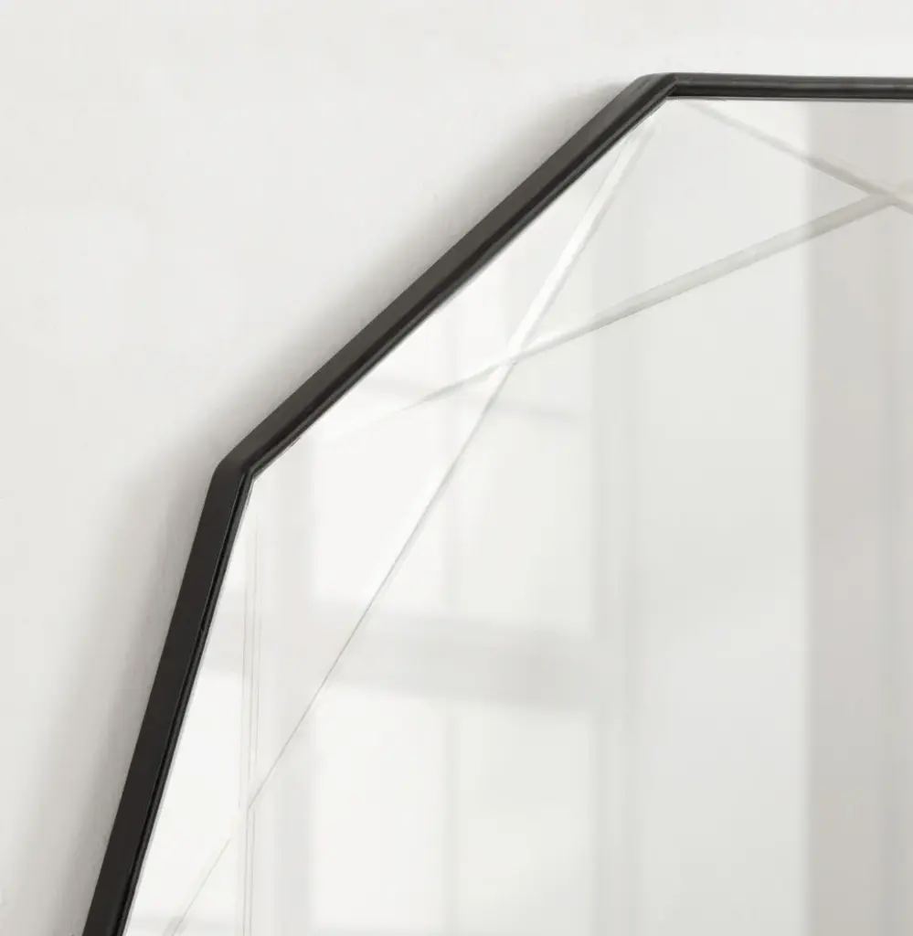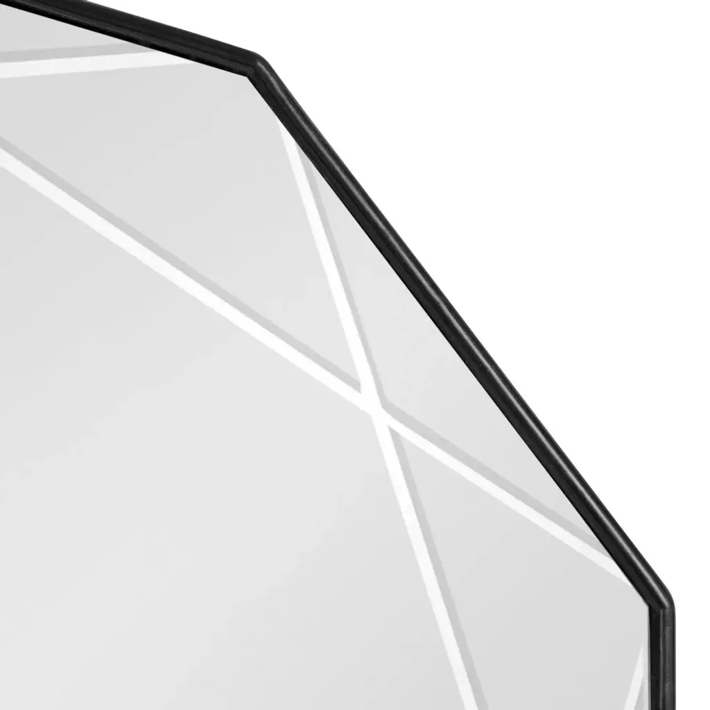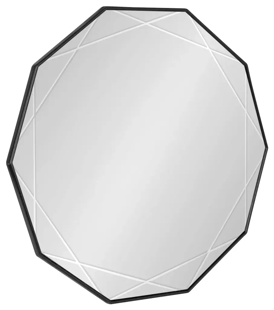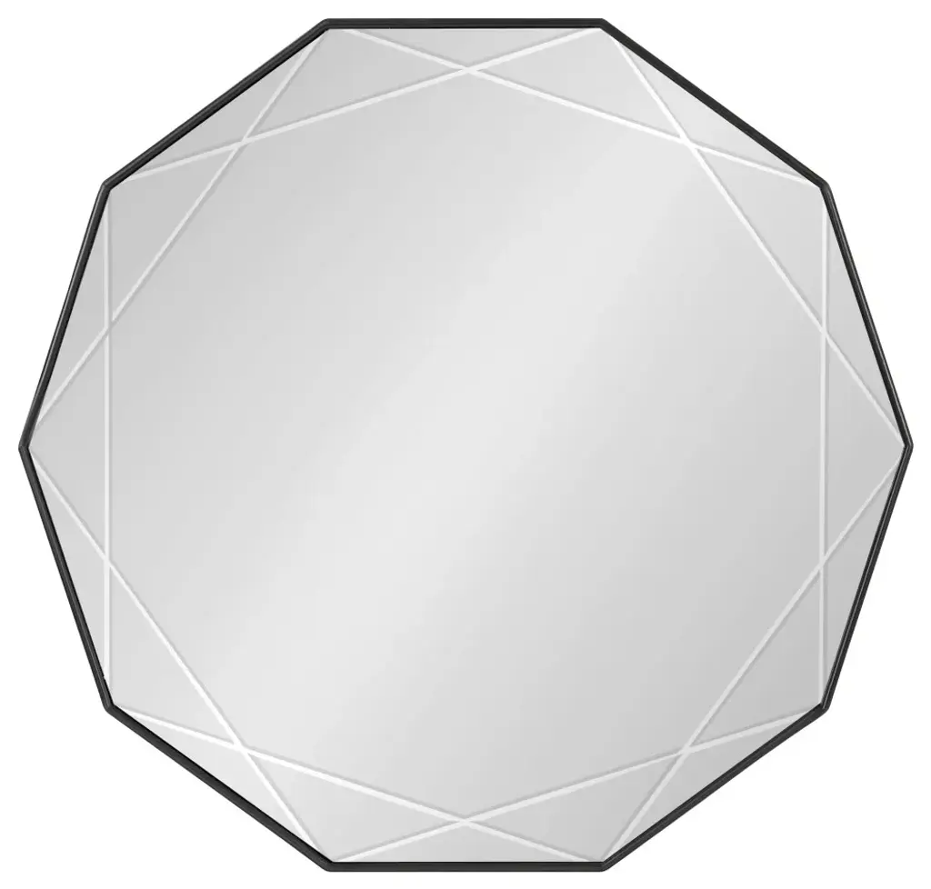 Bring a dynamic and modern piece of home decor to your favorite space with the Deka wall mirror. This decadent accent mirror captures your attention with its geometric frame and holds it with the unique deep-set grooves within the sleek glass surface. The starburst-shaped frame features a dazzling and sleek black finish on the frame, creating a welcoming environment out of your favorite living space. The overall dimensions of this modern accent mirror are 26 inches wide by 26 inches tall, tying your room together as a fabulous visual focal point. Feature this beautiful mirror over your mantle, above a console, or paired with a dresser as bedroom decor. Its large surface area also makes the Deka mirror a fantastic bathroom mirror above your vanity! Regardless of where you hang this mirror, it is fantastic for showing off your modern taste while expanding the room''s dimension with its reflective and vibrant nature. Use the metal D-ring hangers attached to the back of the frame for quick and easy installation in a matter of minutes.• Modern Design: This stunning design of the Deka wall mirror includes a geometric decagon frame and inset grooves engraved within the glass that connect to each point of the frame• Refined Finish: The bold style and sleek sophistication of the Deka''s black finish allow it to set the tone of any modern space, creating a look that fits in various areas of the home• Large Size: The Deka captivates onlookers with its large, commanding presence, measuring 26 inches wide by 26 inches tall to create an eye-catching focal point in any space• Versatile: The large size of the Deka mirror make it the perfect room decor, opening your space with its vibrant reflective surface. It''s also a fantastic bathroom mirror to hang above your vanity• Easy to Hang: Use the convenient metal D-ring hangers attached to the back of the Deka wall mirror for quick and easy wall installation in a matter of minutes