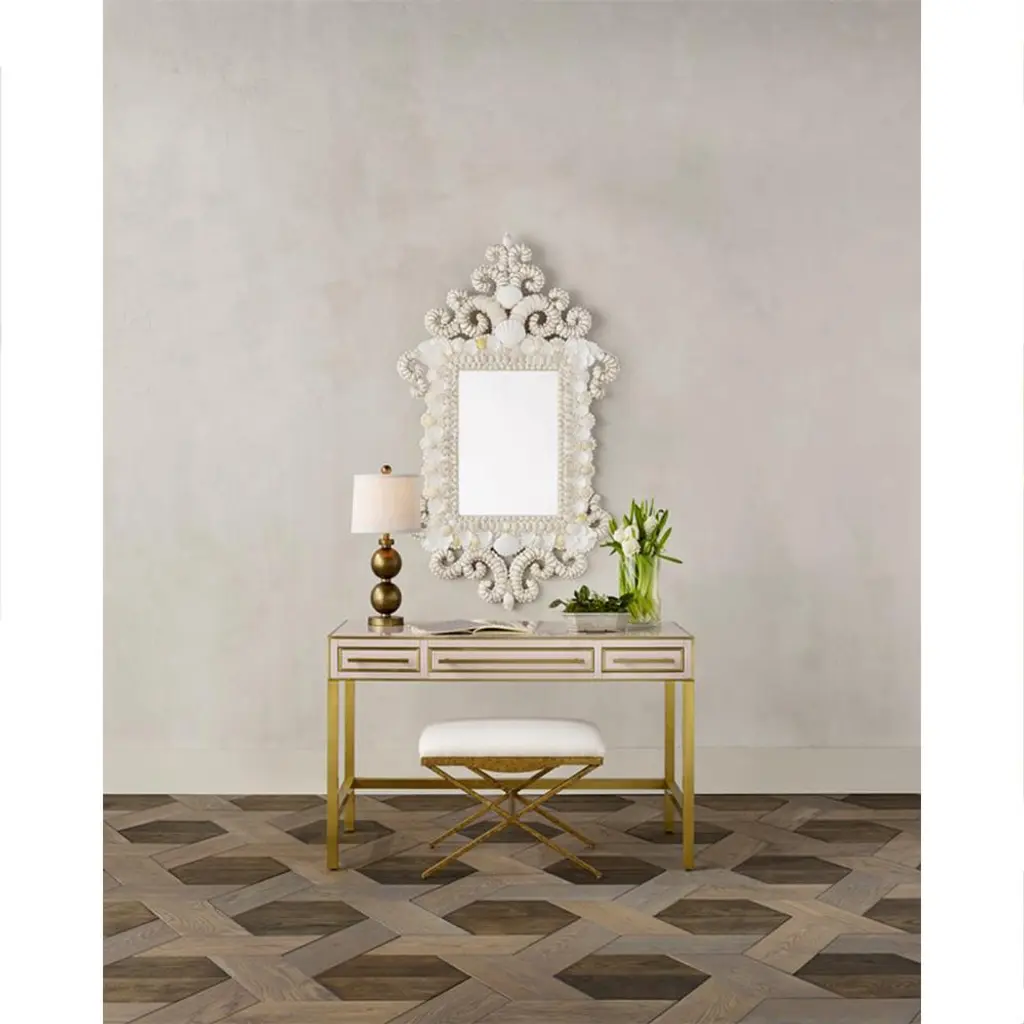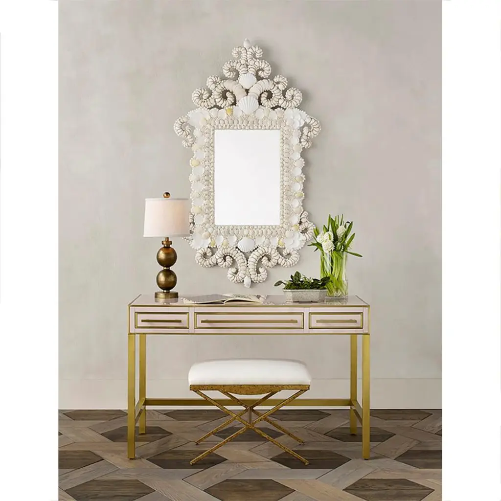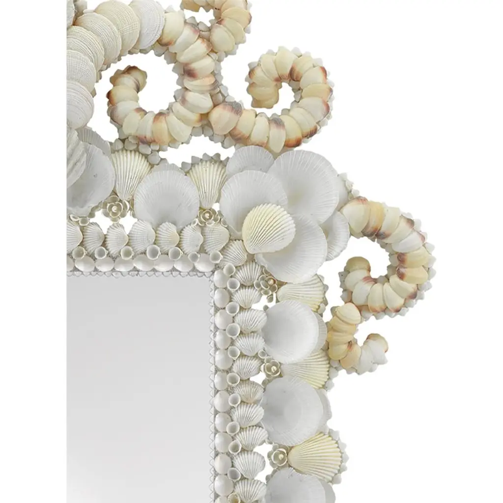 At once both whimsical and regal, this chic wall mirror takes an elegant white frame and covers it in seashells for an exuberant, coastal twist. The natural shells vary in hues from ivory to cream and make a beautiful addition to any home from classic beach bungalow to eclectic urban pad.
