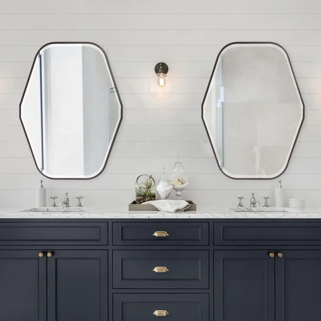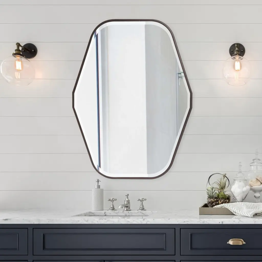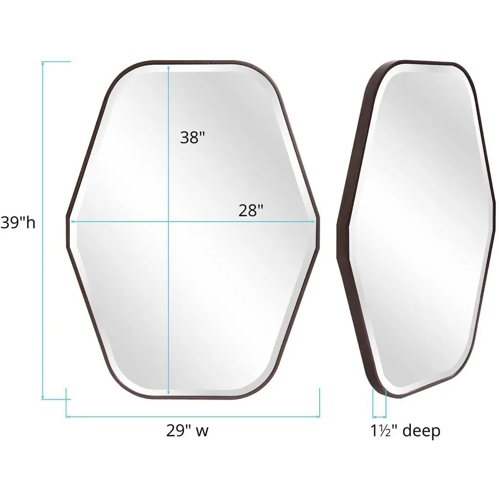 Our Delmar Mirror features a stylized octagonal mirror trimmed in a thin wood frame. The simplicity of the frame really lets the unique shape of the piece shine. It is finished in a dark espresso brown stain. D Rings are attached to the back of the mirror making it ready to hang right out of the box! This mirror can only be hung vertically. A simple bevel on the mirror adds to its style and beauty.