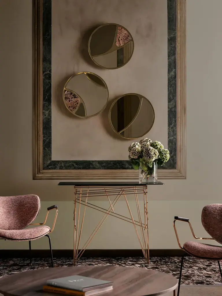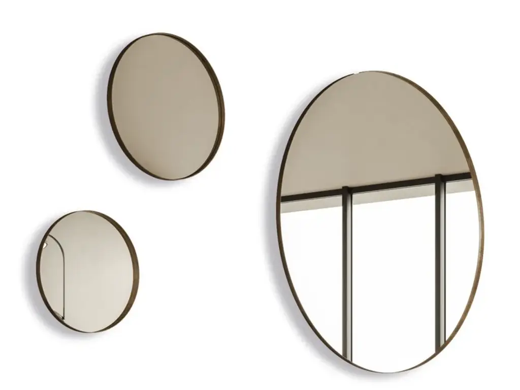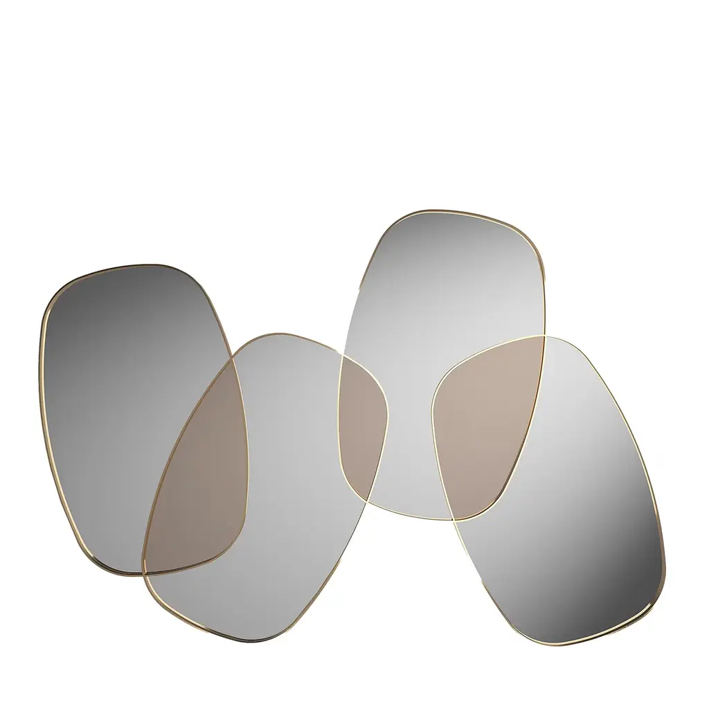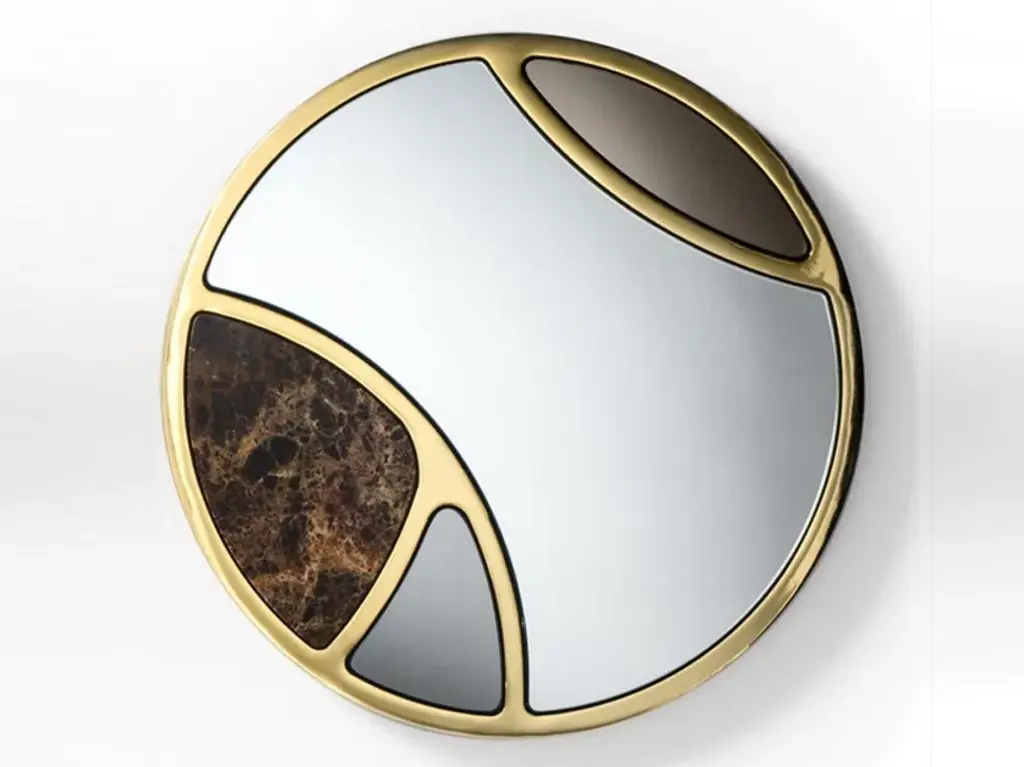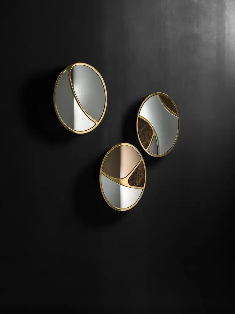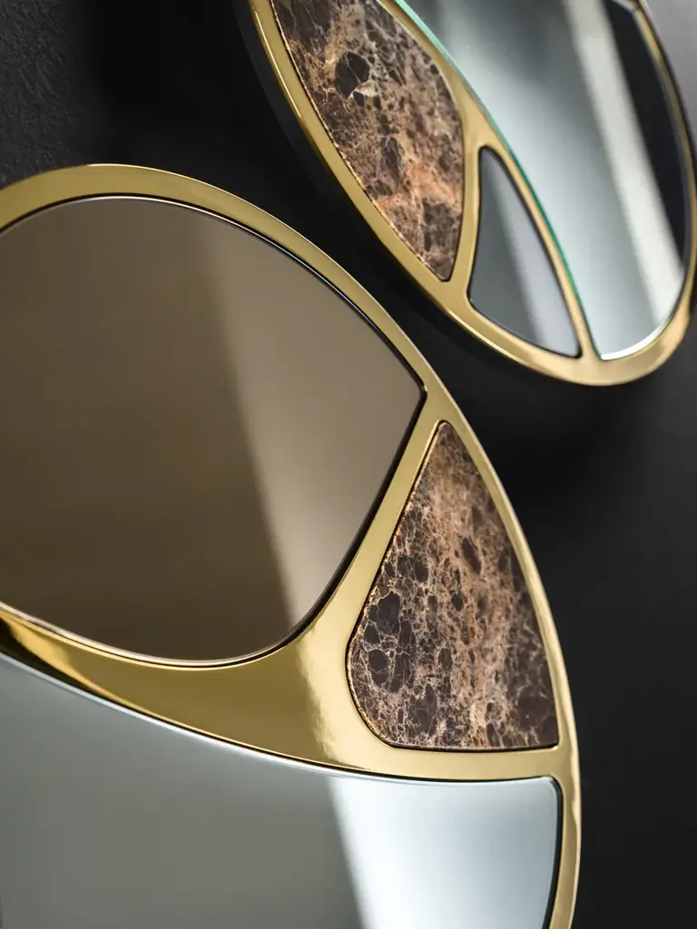 Delta is a set of mirrors with black MDF structure, frame in laser cut metal, gold finishing. Extraclear, bronze, fumè, mirrored glass Emperador marble details. Wall mount bracket. A refined element, which amazes for the lightness with which the solidity of the Emperador marble is coupled with the delicacy of the mirror: Delta is a dance of shapes, lines and design. It is a symphony of bronze, smoky and polished gold shades, skilfully hand-chiselled. It’s just transforming a wall into an element of style with a unique, prestigious nature.Info for purchase: The price refers to a set of 3 mirrors.