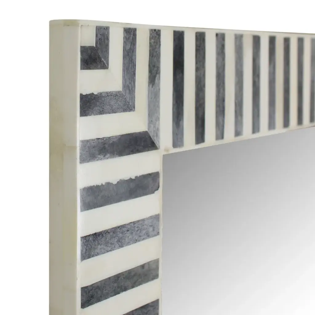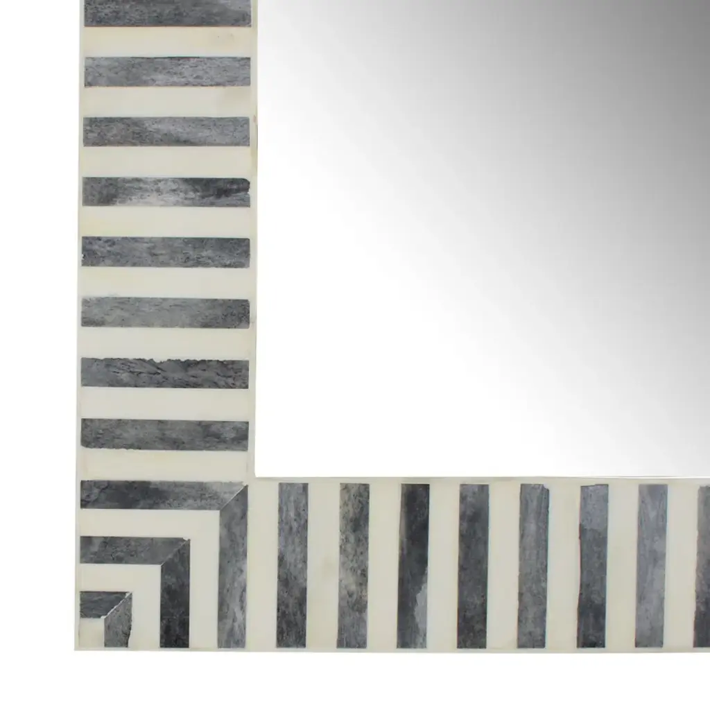 This mosaic wall mirror brings a warm and inviting look to your home with its hand-laid bone and gray-washed stripe pattern. The minimal, rectangular design makes it an elegant addition to your hallway or a stylish centerpiece above your sink in a half-bath. Placing it across from a window adds light and depth to any room, creating a neutral nirvana. With a solid mango wood backing, this mirror blends timelessness with a fresh take on classic style. Plus, this mirror measures 30" tall by 24" wide, making it the ideal mid-size accent mirror.