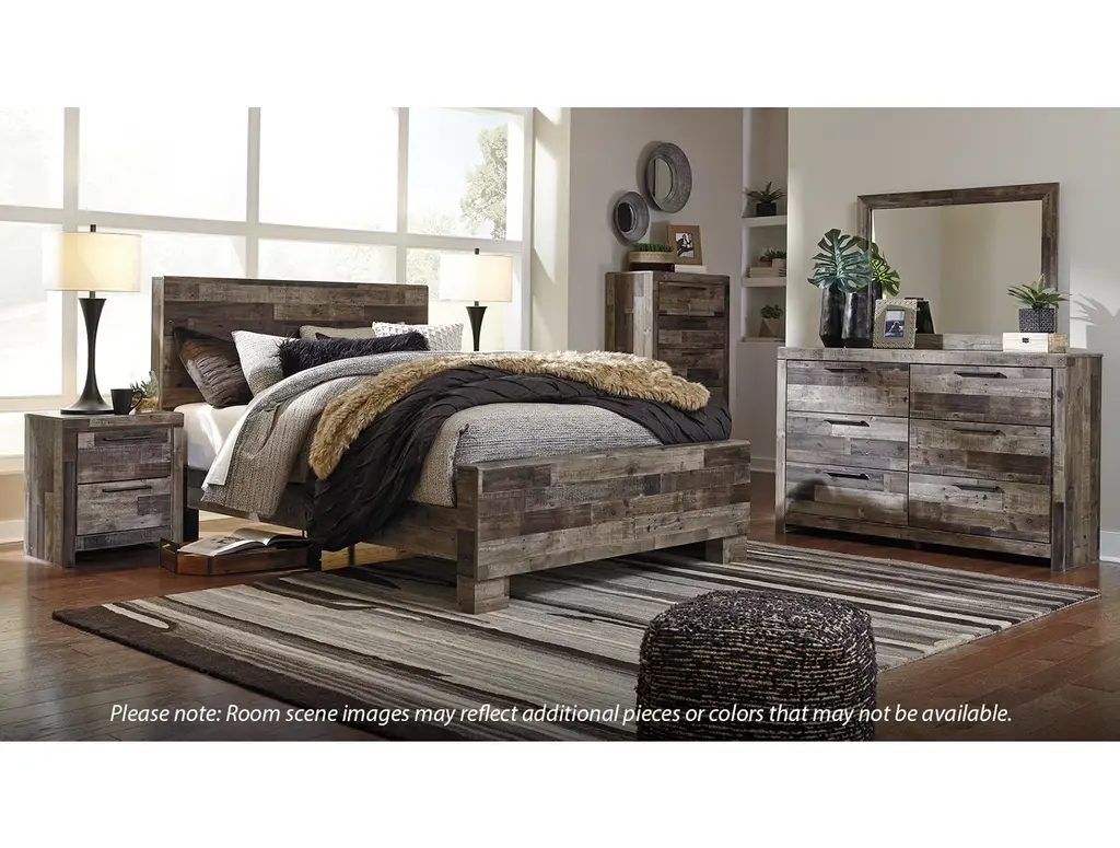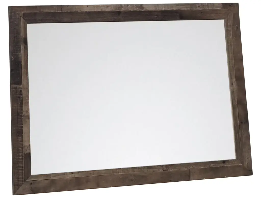 The Derekson Mirror features thick and heavy design with a rustic butcher block finish over replicated pine grain for an authentic touch.