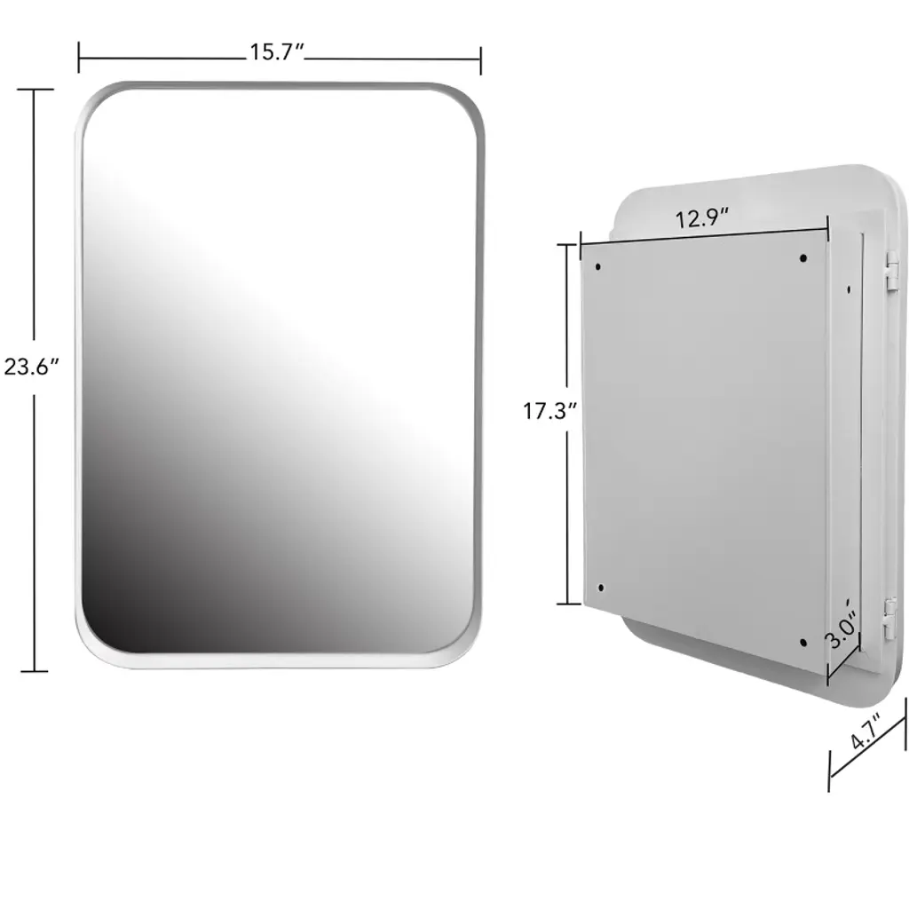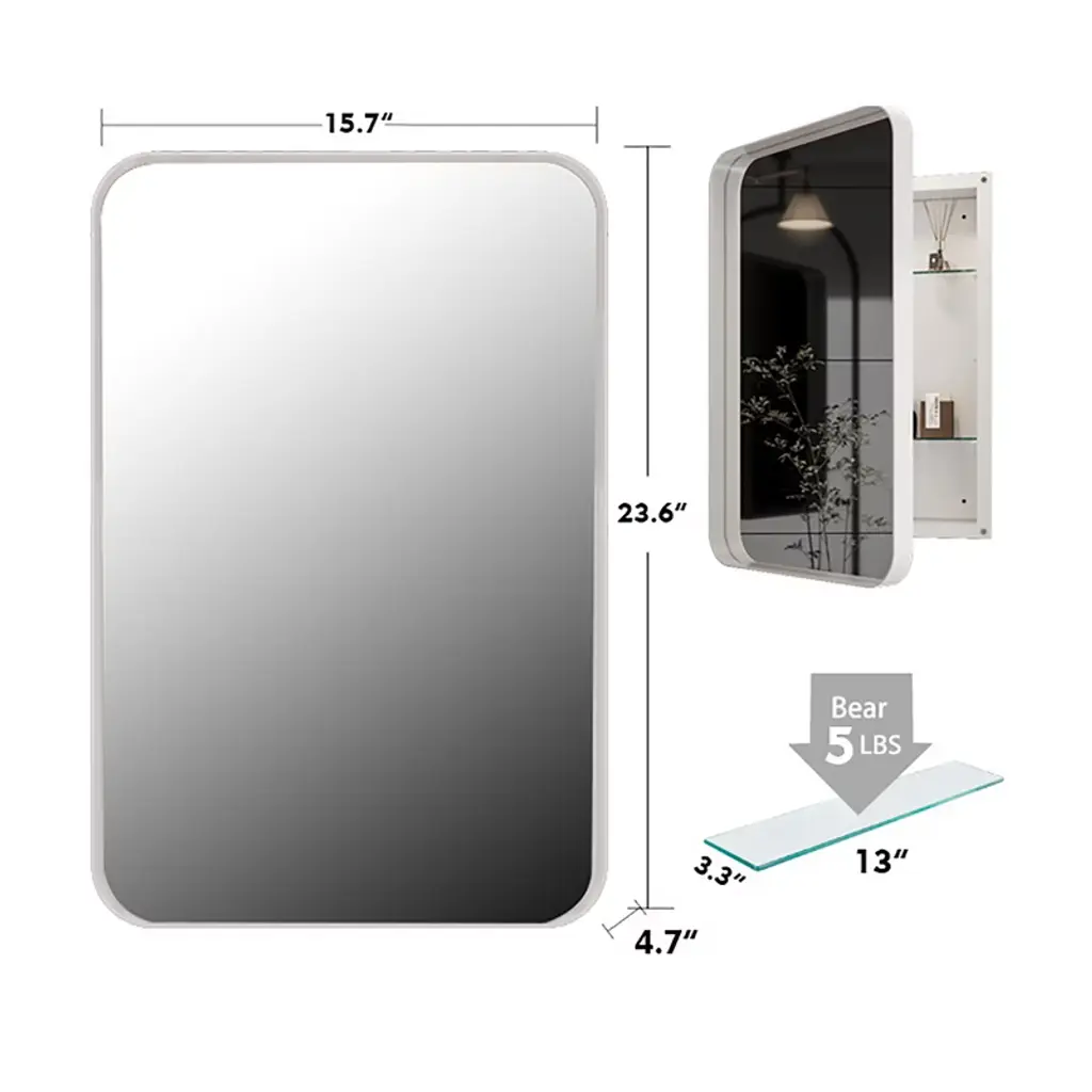 Recessed White Metal Framed Medicine Cabinet with Mirror and Adjustable Shelves The metal framed medicine cabinet with mirror seamlessly combines the aesthetic and practicality of metallic luster, enhancing the taste of the bathroom. Fashionable design and unique metal finishes add a touch of elegance to your bathroom.