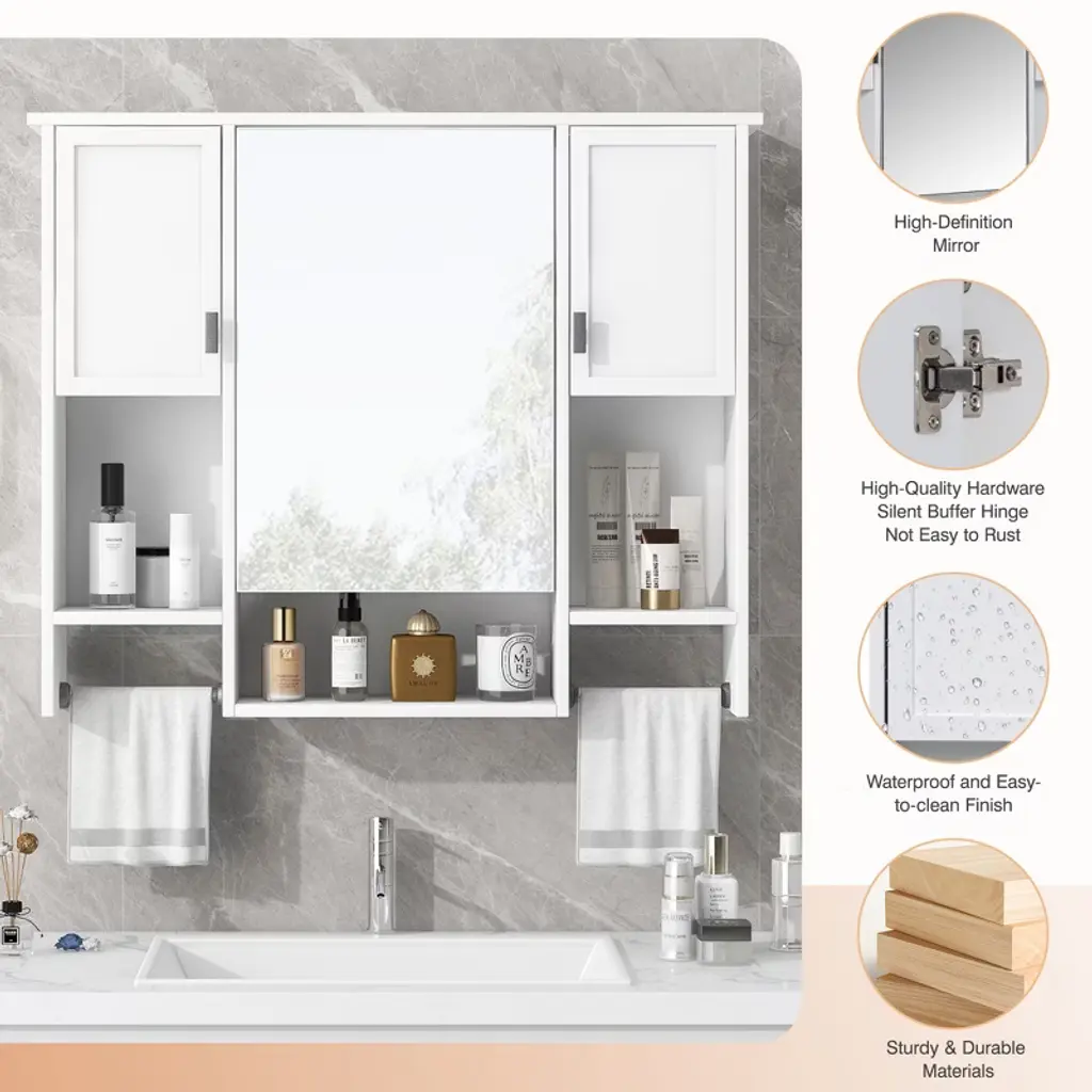 This wall-mounted mirror cabinet perfectly combines modern design with excellent functionality. It is made of high-quality MDF board, which is durable and environmentally friendly. The high-definition mirror provides clear reflections, making every use convenient and quick. The clever design combines hidden and open shelves to store personal items and keep the space tidy, while displaying commonly used items for easy access. Two built-in storage cabinets meet large-capacity storage needs and perfectly hide clutter. The three-layer adjustable storage board allows you to flexibly adjust the storage space according to your needs and adapt to the storage of different items. The included towel rod design allows you to easily hang towels or clothes, increasing the practicality and convenience of the bathroom. Whether it is the bathroom, bedroom or other space, this mirror cabinet can provide a neat, practical and beautiful storage solution to improve the quality of your home life. Exquisite and Durable Hardware Combining high-quality materials and exquisite craftsmanship, it ensures long-lasting use and excellent performance. Whether it is door handles, hinges or drawer slides, they can show modern beauty and practicality. Modern Minimalist Style The simple lines and elegant appearance make this mirror cabinet perfectly integrated into various home styles, from modern, Nordic to minimalist styles, which can be easily matched to enhance your home taste. Both Hidden and Open Shelves The cleverly designed storage space has both closed shelves to help hide and store personal items and keep them tidy, and open shelves to provide convenient and quick access space for commonly used items, which is both practical and beautiful.