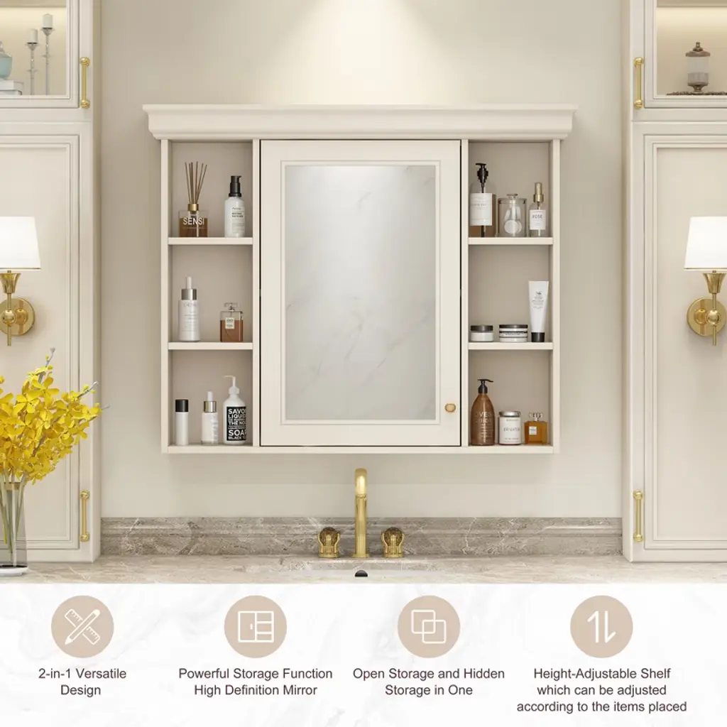 This wall-mounted mirror cabinet perfectly combines modern design with excellent functionality. It is made of high-quality MDF board, which is durable and environmentally friendly. The high-definition mirror provides clear reflections, making every use convenient and quick. The clever design combines hidden and open shelves to store personal items and keep the space tidy, while displaying commonly used items for easy access. Two built-in storage cabinets meet large-capacity storage needs and perfectly hide clutter. The three-layer adjustable storage board allows you to flexibly adjust the storage space according to your needs and adapt to the storage of different items. The included towel rod design allows you to easily hang towels or clothes, increasing the practicality and convenience of the bathroom. Whether it is the bathroom, bedroom or other space, this mirror cabinet can provide a neat, practical and beautiful storage solution to improve the quality of your home life.