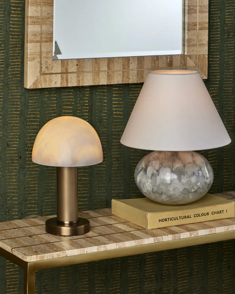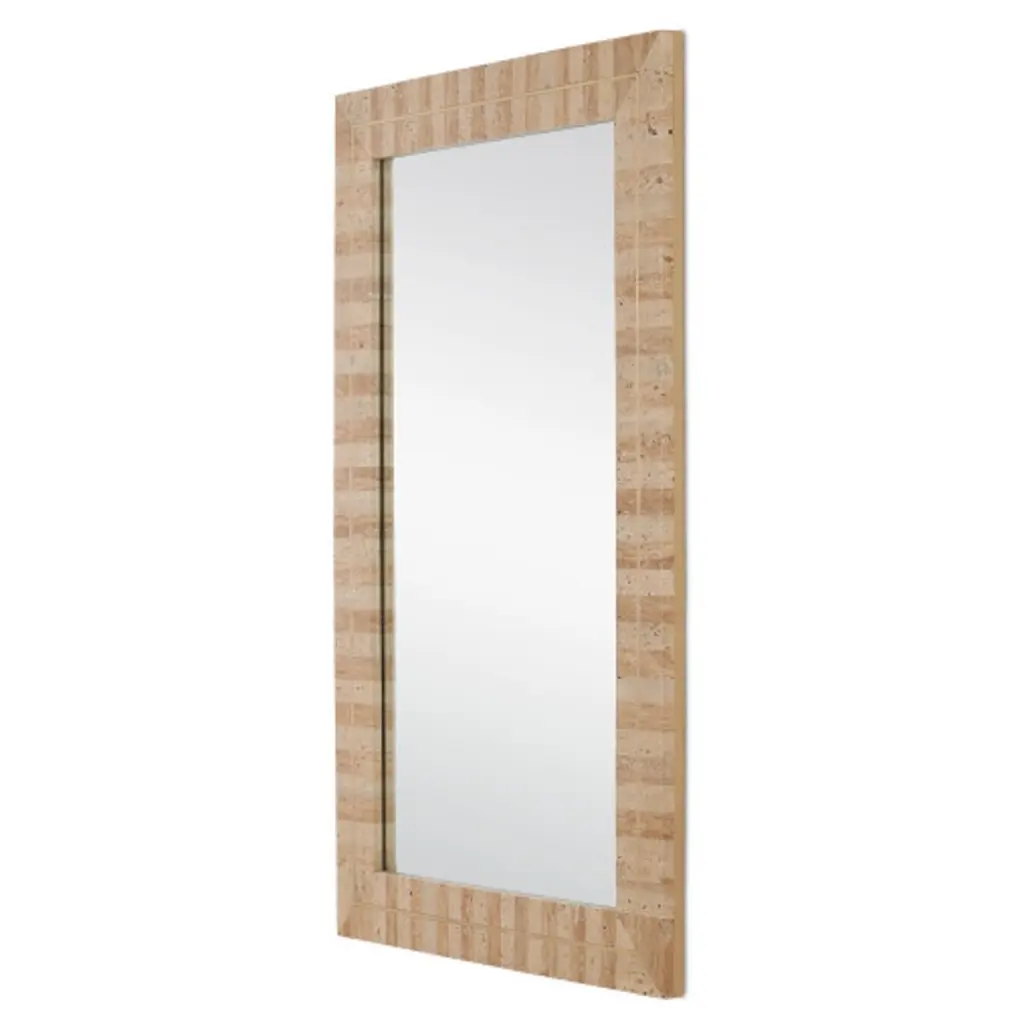 The Dezi Rectangular Mirror is crafted from natural travertine tiles arranged in a stacked dark-and-light pattern with a brass inlay running through the center. The interplay of materials creates a pop of brightness as natural light reflects off the metal and a hint of warmth as the stone absorbs it. Each decorative mirror will have unique surfaces due to the natural materials used in its construction.