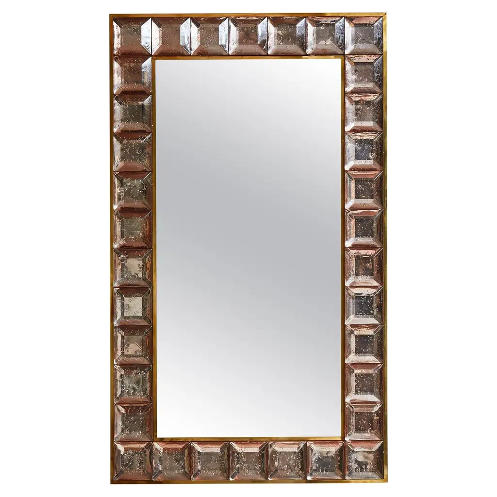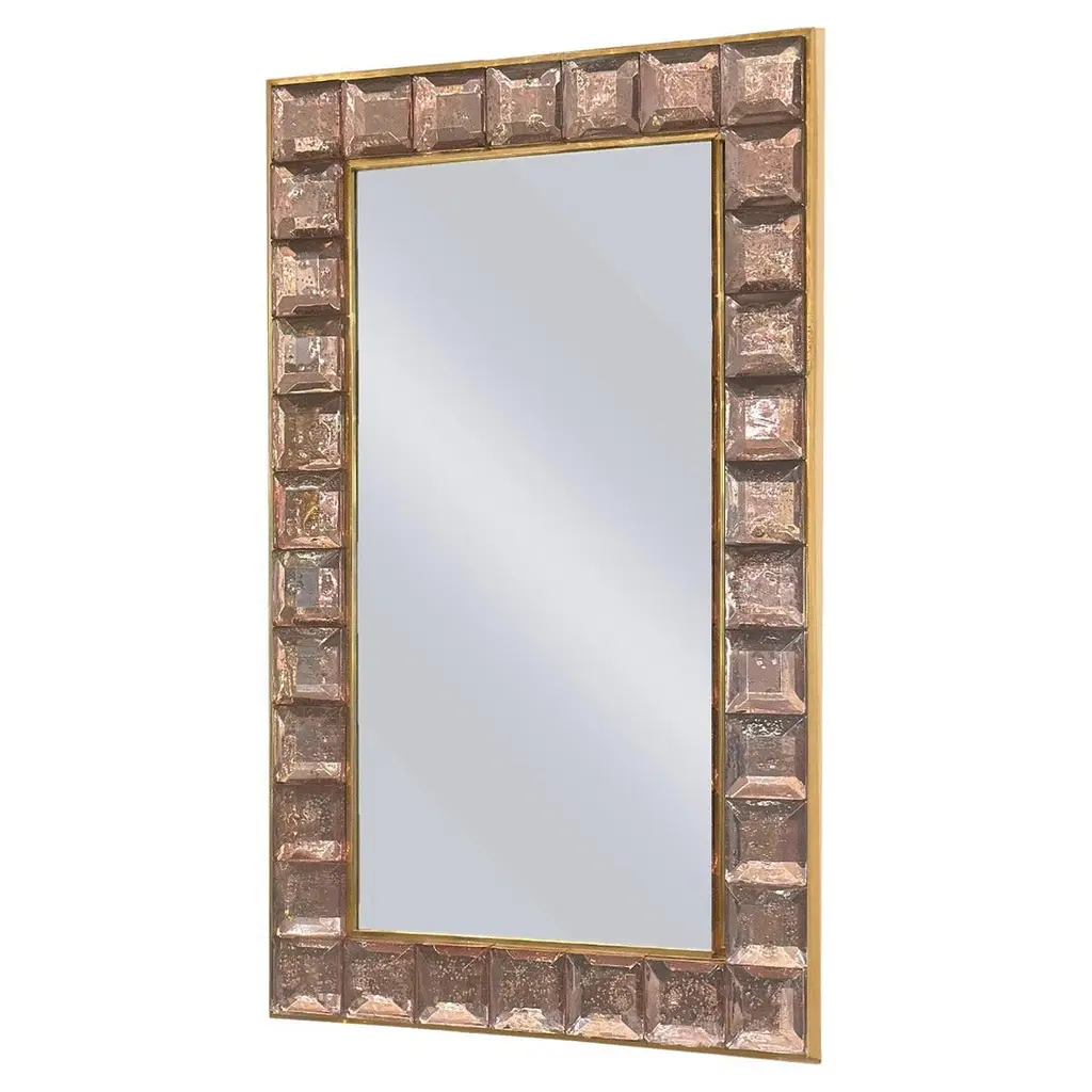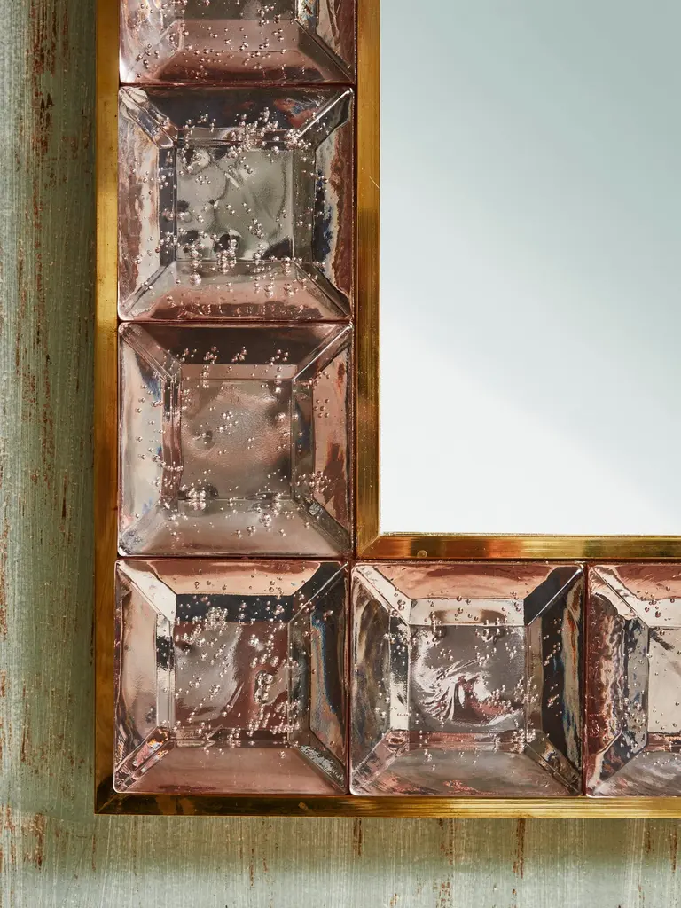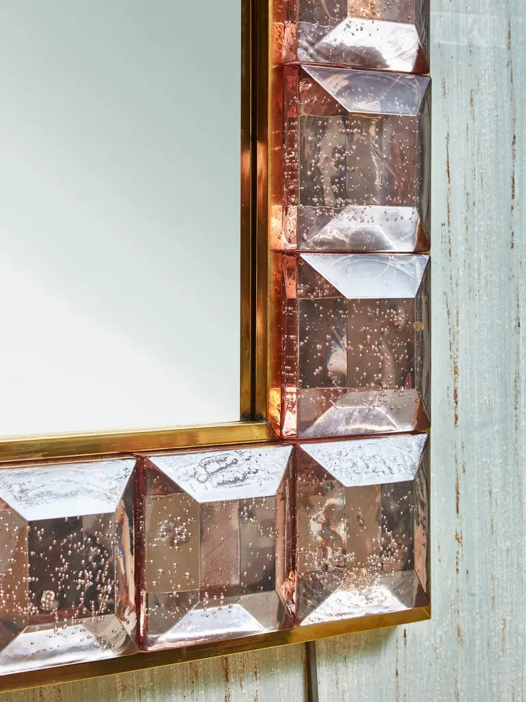 Pair of brass mirrors with frame in pink "Diamond pits" murano glasses.Creation by Studio Glustin.