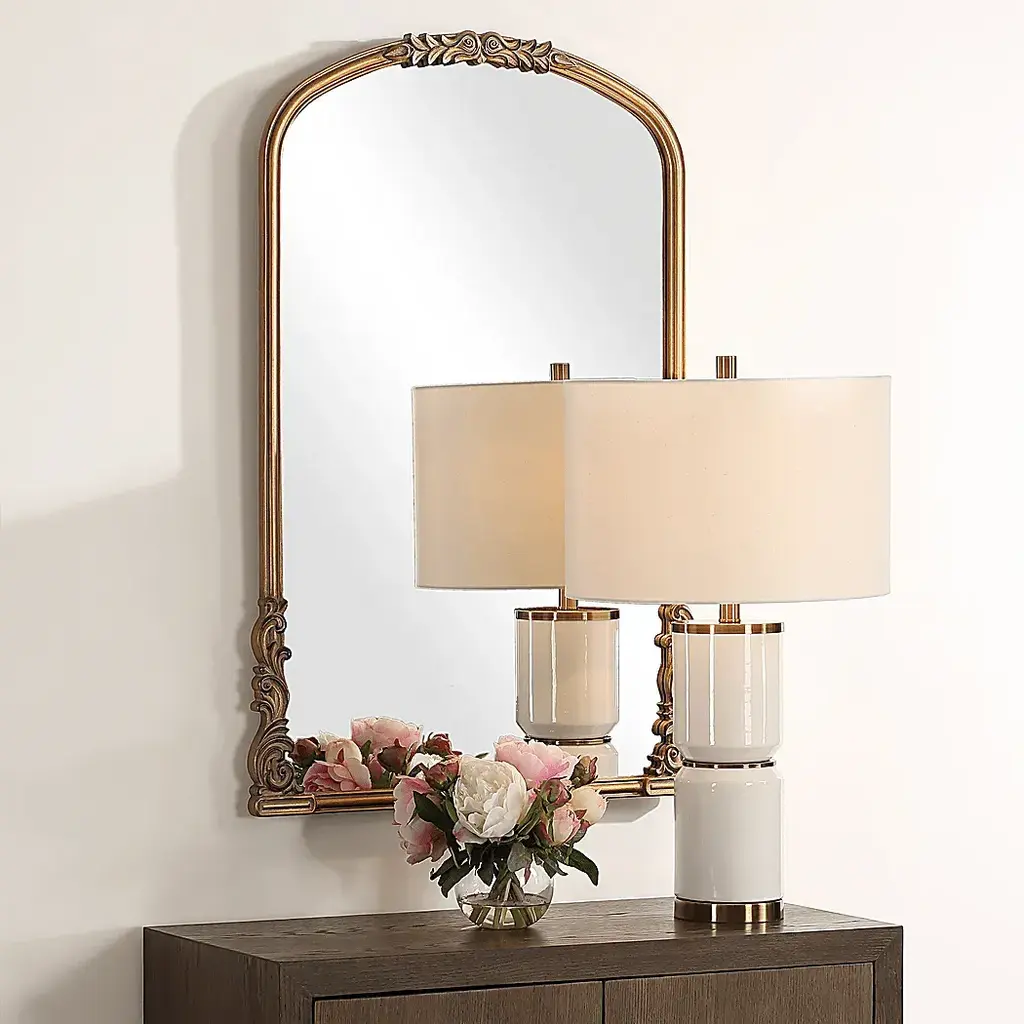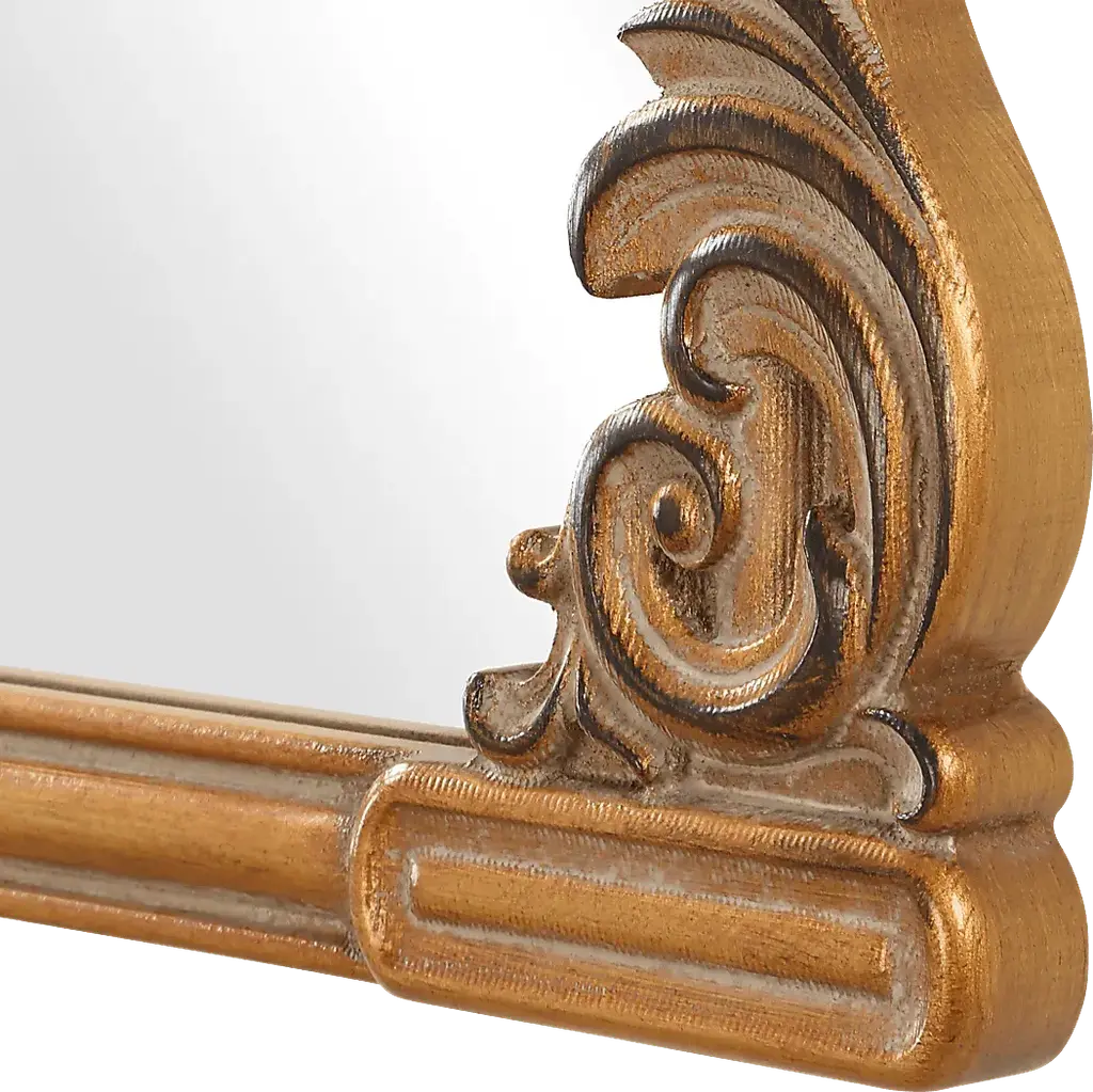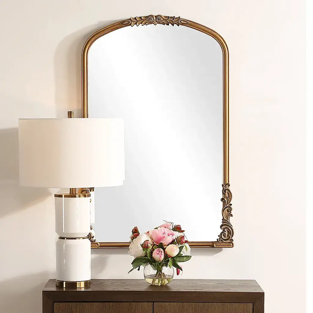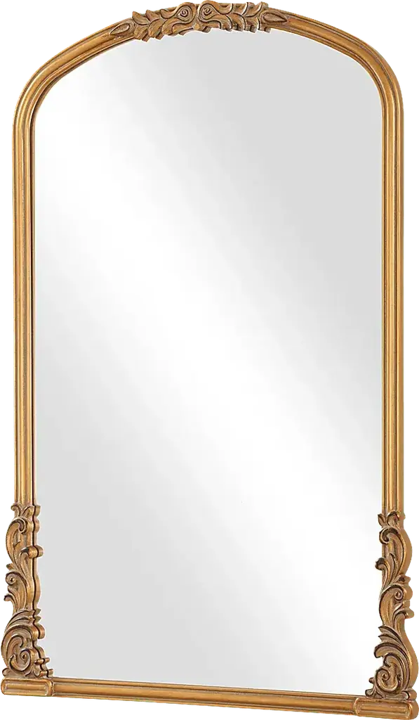 Adorned with intricate, ornate details, this Baroque style Dian mirror features a gracefully arched top that brings a touch of grandeur to any room. Constructed with engineered wood, this frame is finished in a rich antique gold, making it a centerpiece of any room.