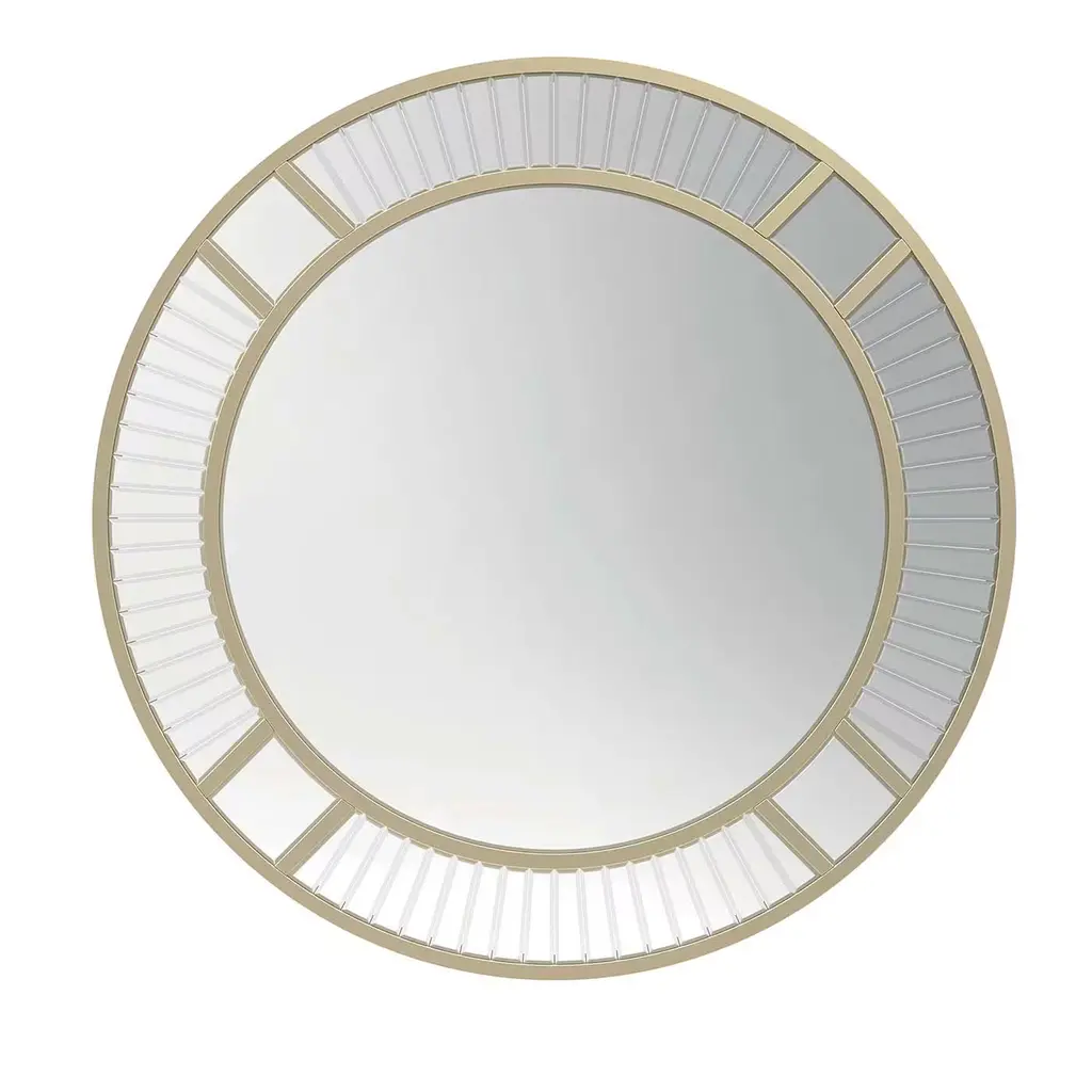 The Discus Mirror features a classic design elevated through opulent metallic tones and masterful craftsmanship. Crafted from beech wood, the piece displays a perfectly rounded silhouette, highlighted by slender borders in a Pewter finish. Beveled glass is showcased throughout the piece, delivering a wealth of textural depth to an interior space.