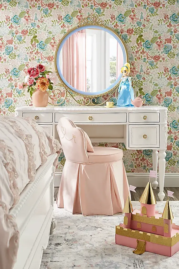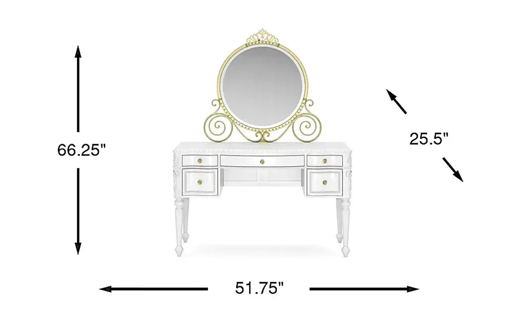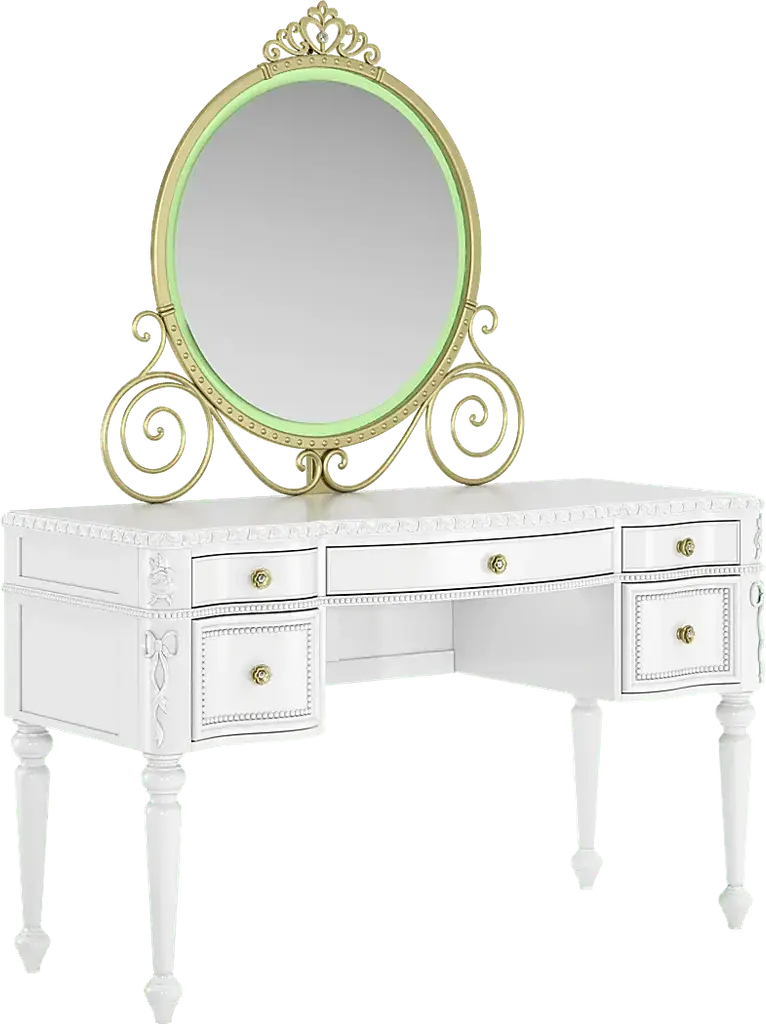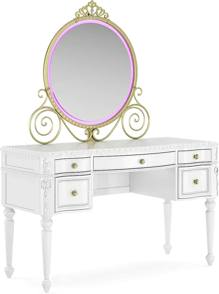 Create a fairytale escape for your little royal with the Disney Princess collection, where every night feels like a bedtime ball and every morning begins a brand-new adventure. With three drawers and a spacious work surface, the elegant desk in this set offers the perfect setting for everything from homework to coloring. The gently curved silhouette is finished in sparkle white and accented by custom gold rose drawer pulls with faux crystal insets. Featuring soft-close glides and French dovetail fronts with English dovetail backs, the drawers open smoothly and quietly. A pink felt-lined top drawer provides a soft space for special keepsakes and writing supplies, while a built-in power station with two AC outlets and dual USB ports brings modern convenience to this princess-worthy design. Paired with the LED-lit carriage mirror, this desk transforms into a magical vanity setup. Shaped like an enchanted carriage and trimmed in sparkle white, the mirror features a multicolored LED light strip that can be controlled with the included remote or the Lotus Lantern app.