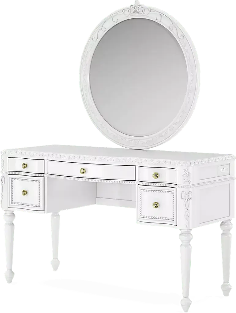 Create a fairytale escape for your little royal with the Disney Princess collection, where every night feels like a bedtime ball and every morning begins a brand-new adventure. With three drawers and a spacious work surface, the elegant desk in this set offers the perfect setting for everything from homework to coloring. The gently curved silhouette is finished in sparkle white and accented by custom gold rose drawer pulls with faux crystal insets. Featuring soft-close glides and French dovetail fronts with English dovetail backs, the drawers open smoothly and quietly. A pink felt-lined top drawer provides a soft space for special keepsakes and writing supplies, while a built-in power station with two AC outlets and dual USB ports brings modern convenience to this princess-worthy design. Paired with the round mirror, this desk transforms into an iconic vanity setup.