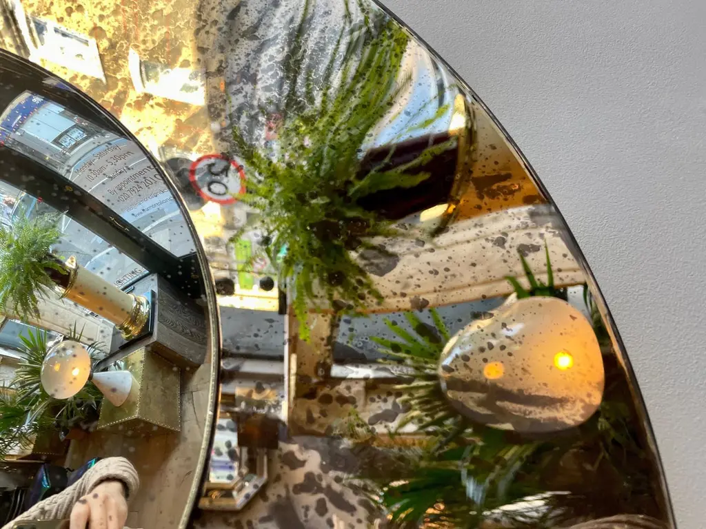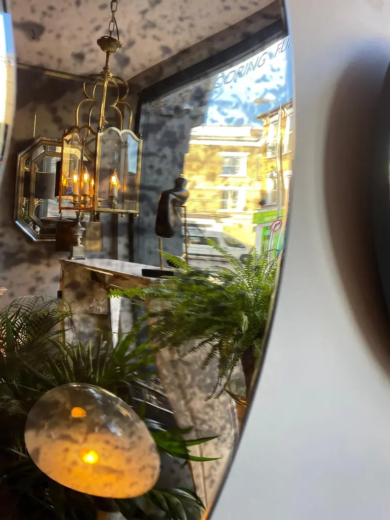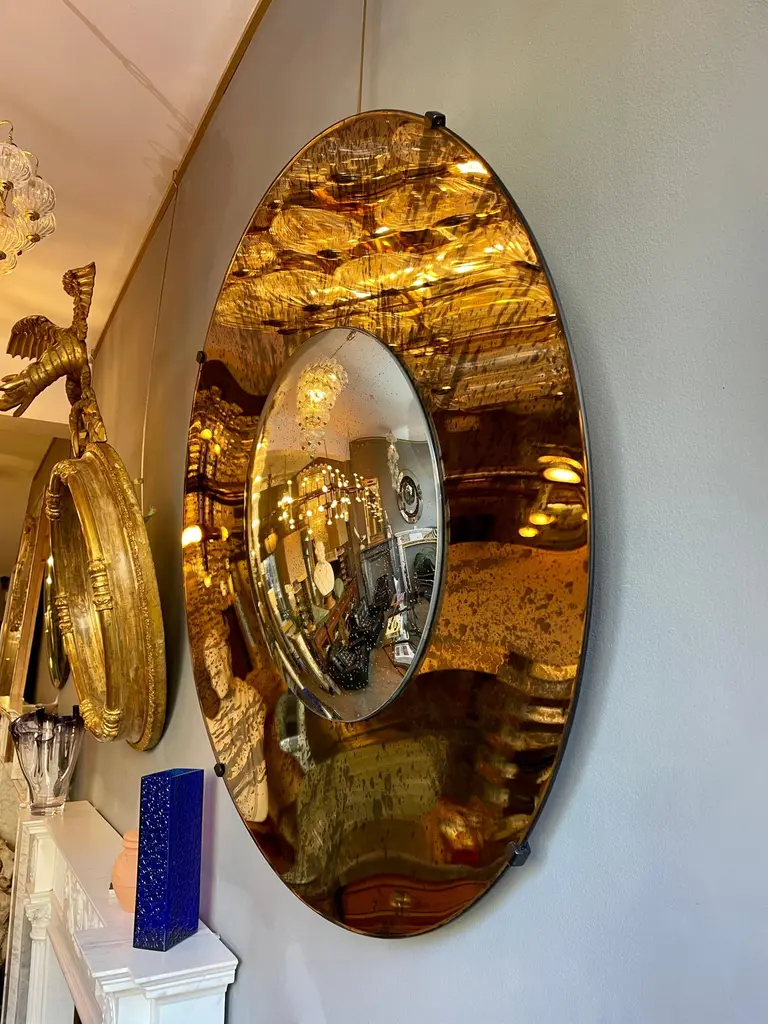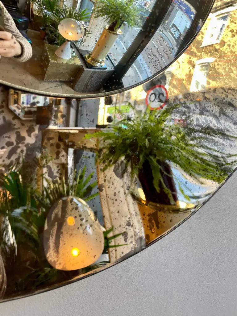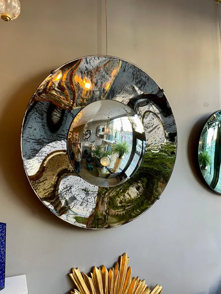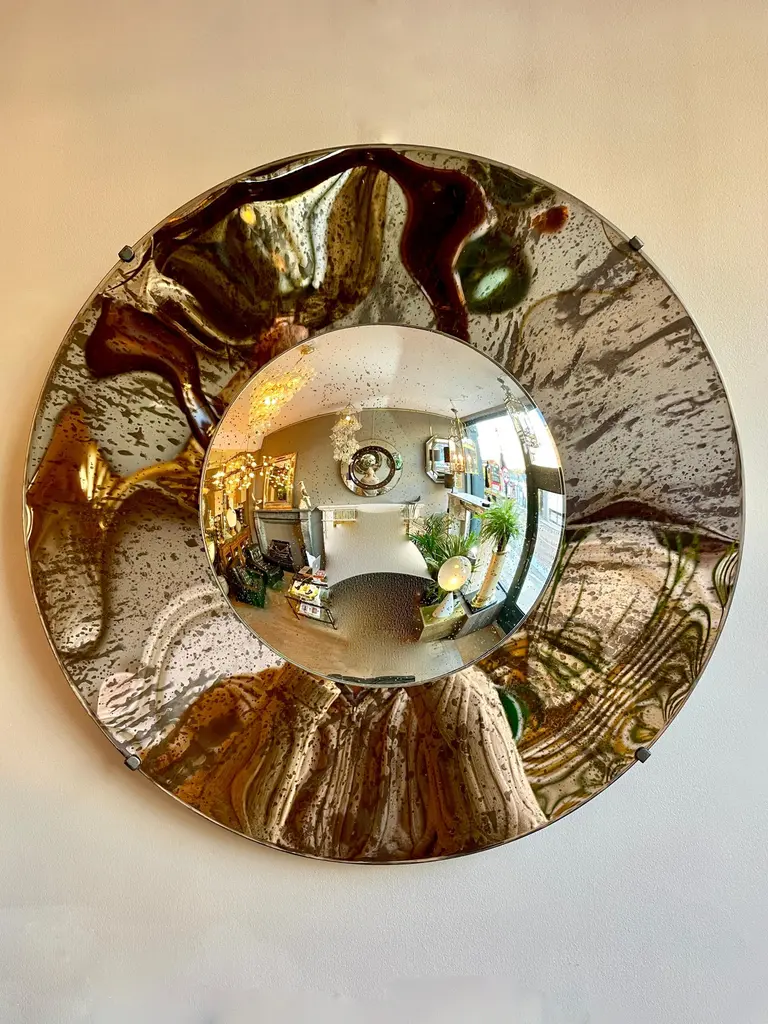 A concave mirror in distressed bronze colour with a silver distressed convex mirror to centre. Frameless, held in place by 4 clips and secured at he back with a circular fitting and built in hook for hanging.