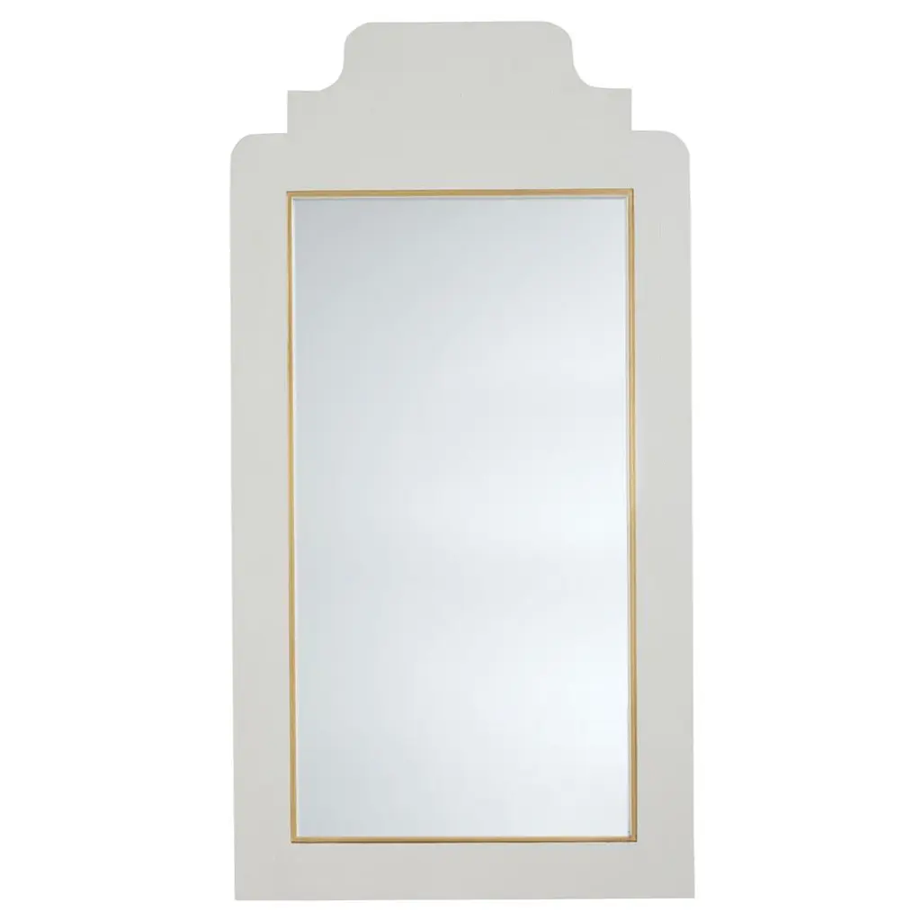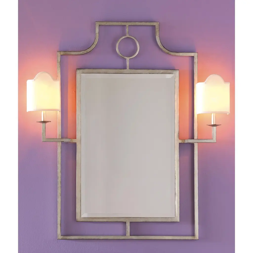Port 68 Overall 46" in height. Perfect for the grand bathroom, dining room console or entryway. The Doheny mirror also coordinates with the Doheny Console. It features a turned metal bamboo leg and wooden top/bottom shelf. Frame material: metal. 60 watt max sconces. Hardwire electrical installation. Actual size of mirror is 29"H x 20"W. Hardback Italian half shades: 6.5"W x 4" D x 8" SH. Off white linen fabric.
