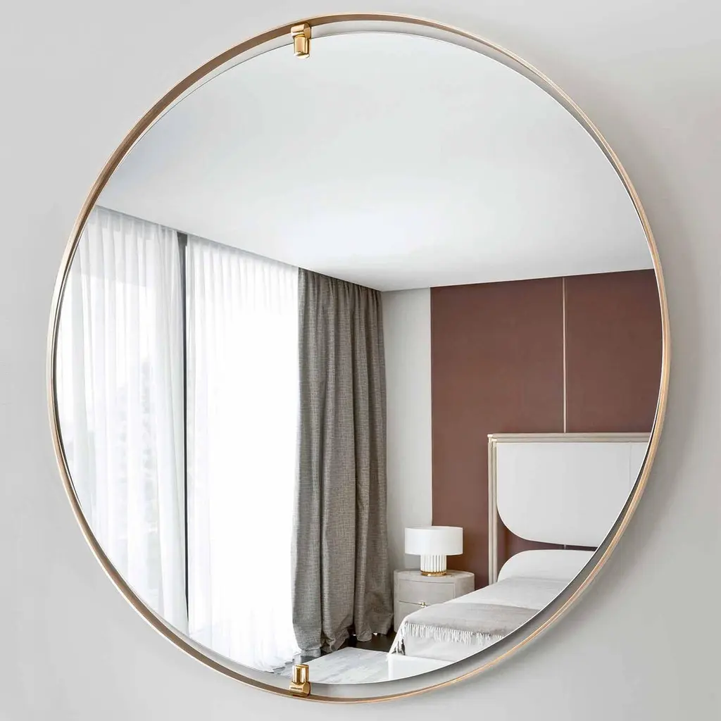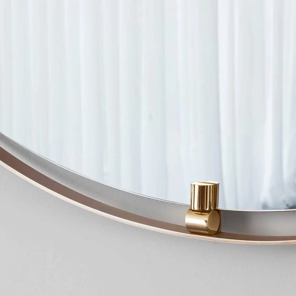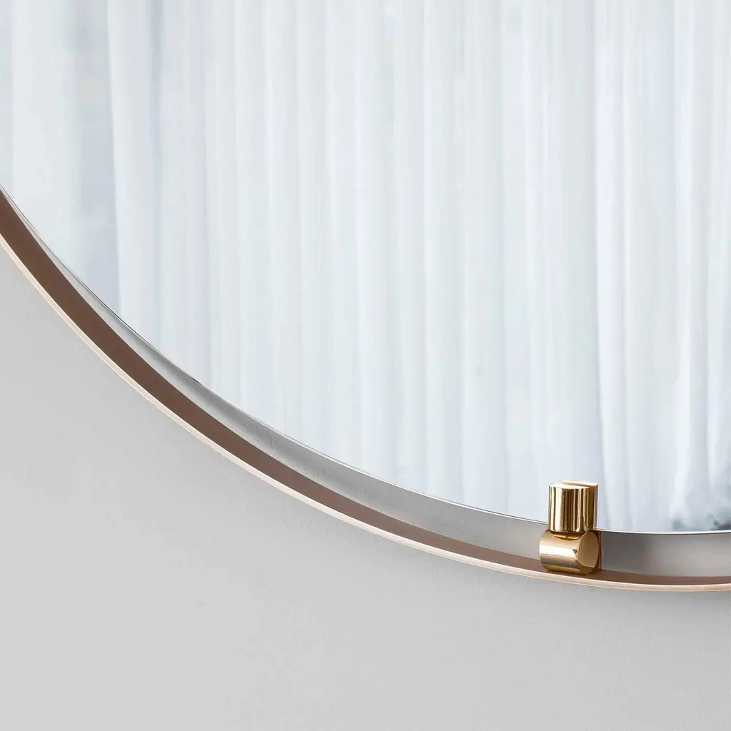 Mirror Dolce with round mirror glass and withSolid brass round frame in bronzed finish. With2 fixture in solid brass in polished finish at theTop and at the bottom of the mirror.