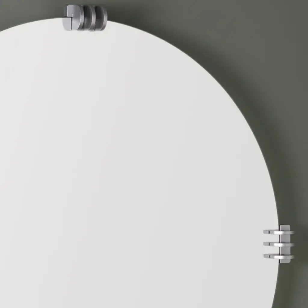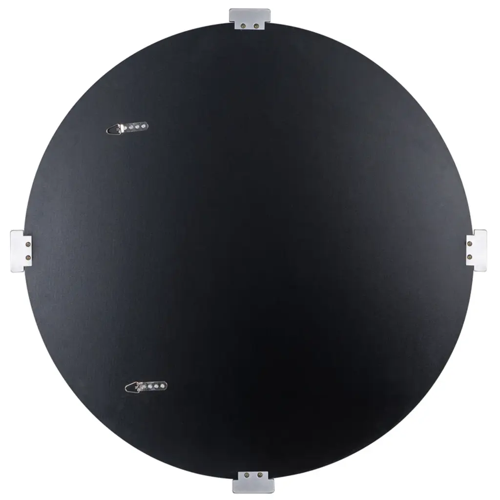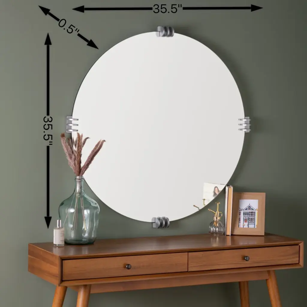 Clarity, in the clutch. Four claw-like brackets add an edgy modern accent to this circular wall mirror, while its frameless design facilitates the flow of light through your space. A fog-free finish makes it a good fit for steamy bathrooms, and it comes with D-ring hangers for easy installation.