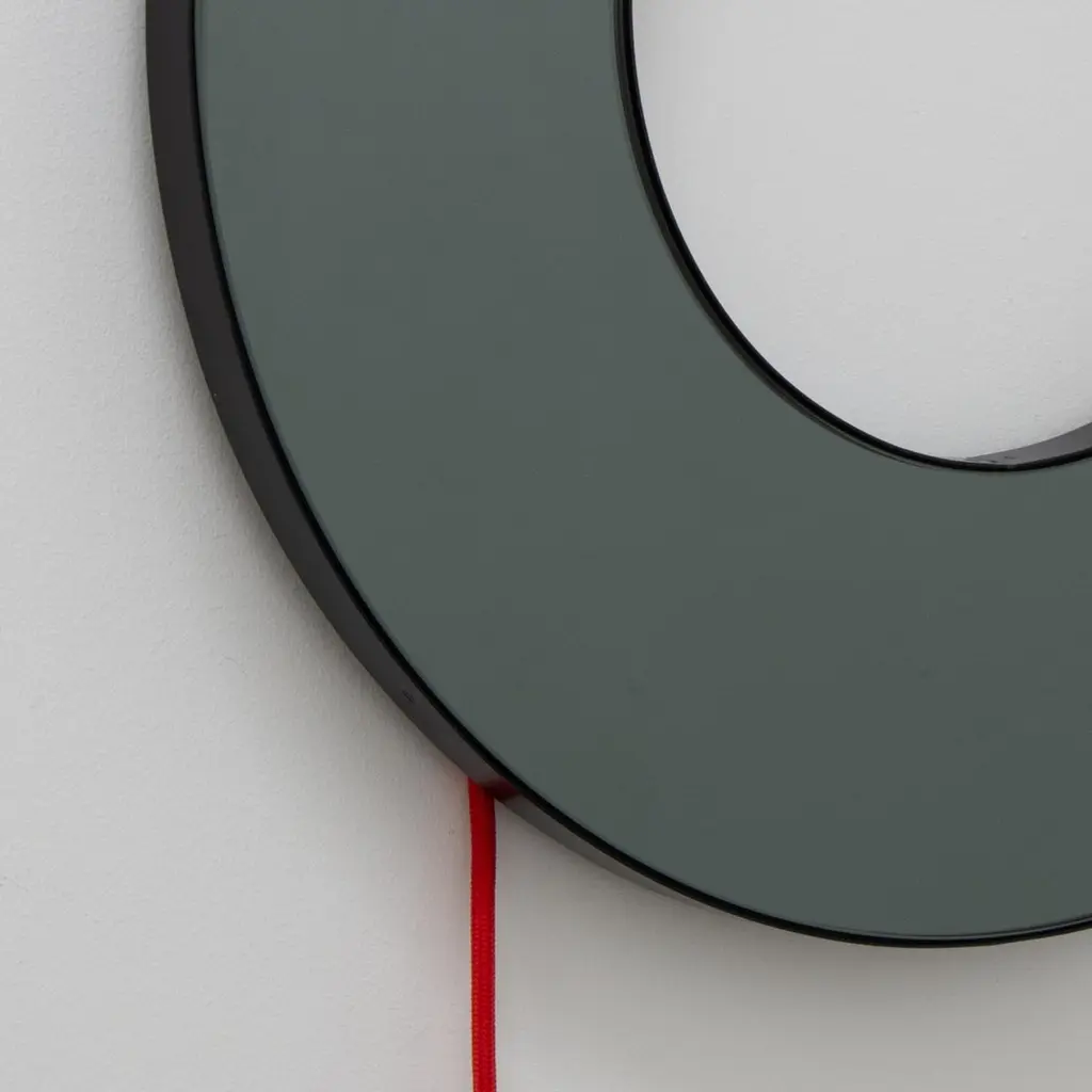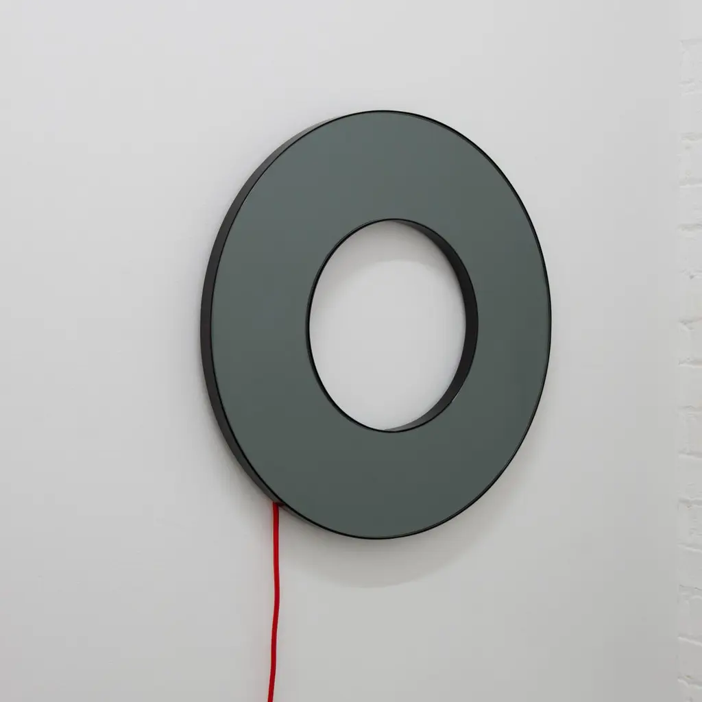 Contemporary Donut™ black tinted round mirror with a matte black frame and back illumination.The latest creation by mirror designer Jose Luis Alguacil Rodriguez is a very exciting contemporary piece that offers a unique focal point for modern interiors with great potential for either warm or vibrant mood-lighting.The Donut™ mirror is available in three different sizes and looks stunning oversized. The light temperature, frame finish, frame colour and mirror tints can all be customised to create a very unique and personal mirror.In line with the style and quality well known to Alguacil & Perkoff, the detailing and finish, including visible screws, emphasise the crafty and quality feel of the mirror. Designed and handcrafted in London, UK.Our mirrors are designed with an integrated French cleat (split batten) system that ensures the mirror is securely mounted flush with the wall. An alternative hanging hook or a Z-bar (depending on the size of the mirror) is available on demand for mirrors that need to be installed allowing some separation from the wall.Please note that the illumination offered with our mirrors is decorative or to create a mood light in the room they are installed in. They are not an alternative to a Hollywood mirror.Shipped safely and fully insured worldwide.ORDERS OF MULTIPLE MIRRORS OF THE SAME TYPE: Please contact us to receive a Packing and Shipping quote when ordering multiple mirrors of the same type. An order for multiple mirrors of the same type may not be accepted without extra packing and shipping fees. Thank you.