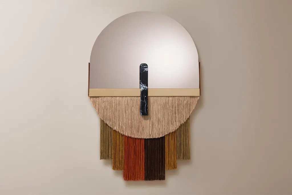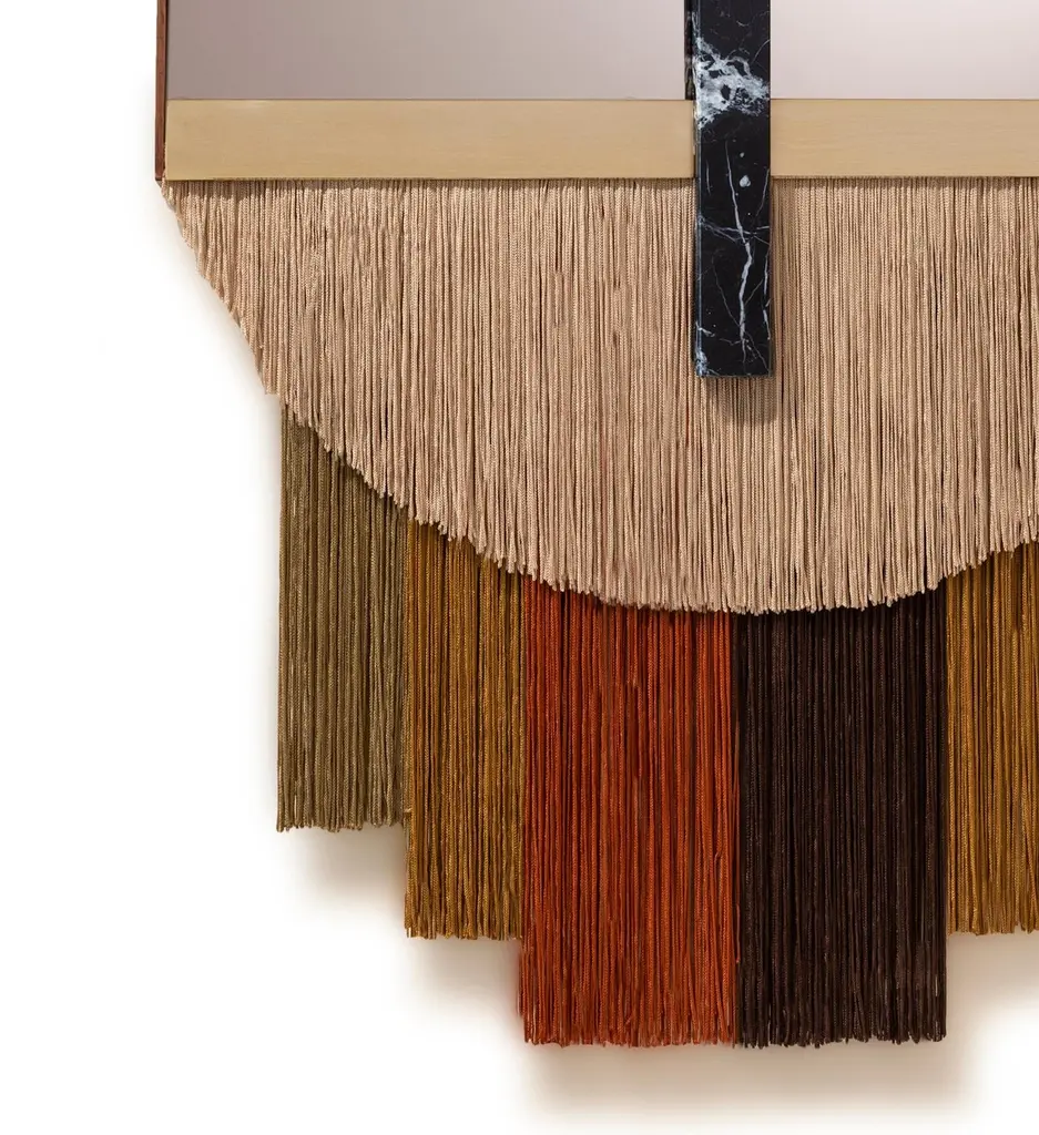 Created by the perfect combination of color, energy and shape, Souk Mirrors reflect the influences of overwhelming and visually fascinating souk markets in northern Africa with its vibrant Silk Fringes and earthy colors resembling typical macramé techniques. These soulful art pieces will make you travel to another time and place where you senses will surely feel aroused.In the Souk Caramel mirror, different earthy color Silk Fringes are combined gracefully in a vibrant composition, completed with a a delicate Stain Brass detail combined with Natural Nero Marquina Marble Stone.The Natural Walnut frame, framing all the back of the Mirror surface and visible on its sides, adds to the delicate craftsmanship present in the Souk Wall Mirror.Made to Order.For sales with delivery address within European territories, VAT will be charged additionally to the stated price.