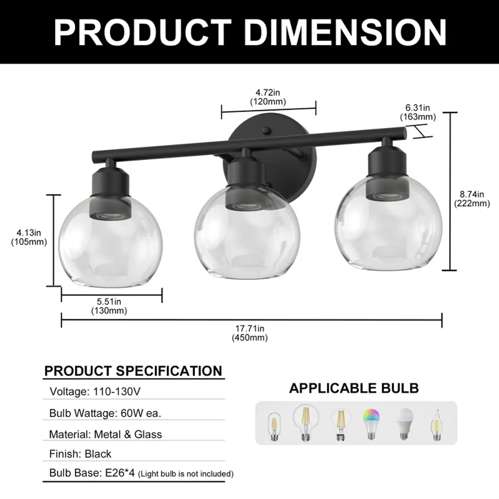 Doresshop 18 In. 3-light Bathroom Vanity Light Fixtures Over Mirror, Black Bathroom Light Fixtures With Clear Globe Glass Shades
