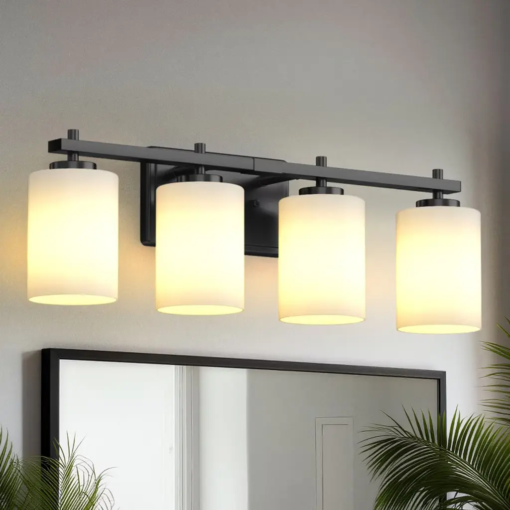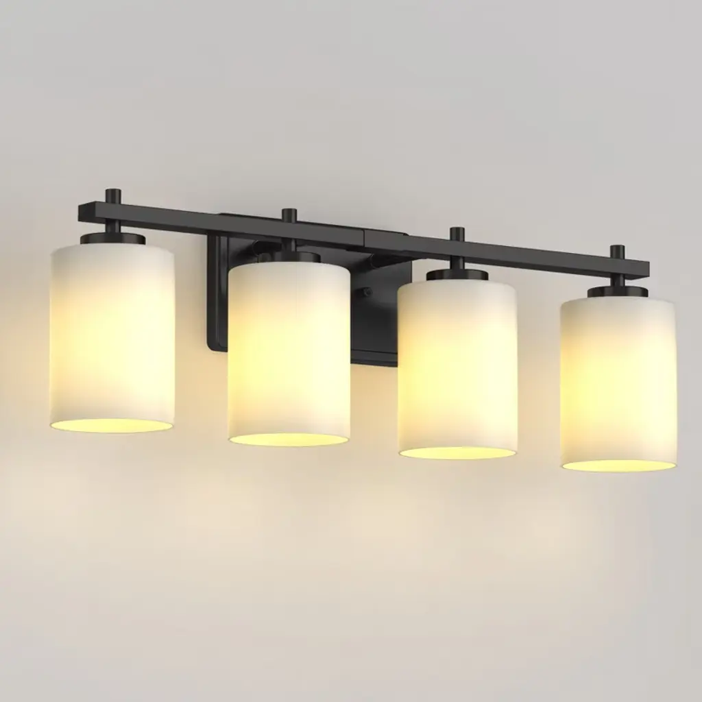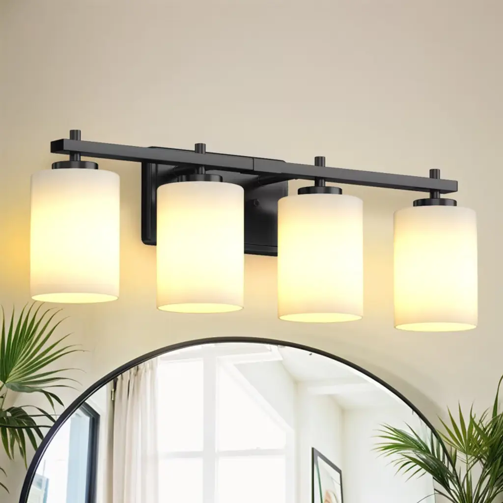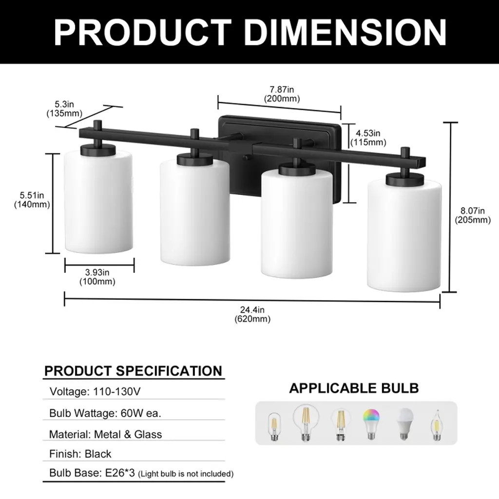 Elevate your space with this modern 4-light vanity wall lamp, designed to combine sleek style with practical functionality. Featuring a black finish and opal glass shades, this lamp adds a soft, diffused light to any room. The E26 socket accommodates standard bulbs (bulbs not included), allowing you to customize your lighting to suit your needs. Perfect for bathrooms, bedrooms, or above dressing mirrors, this wall lamp provides bright, even lighting for grooming and decor. Its durable metal and glass construction ensures long-lasting performance, while the square straight-arm design adds a modern touch. Easy to install and versatile in use, this wall lamp is a stylish and functional addition to any home.