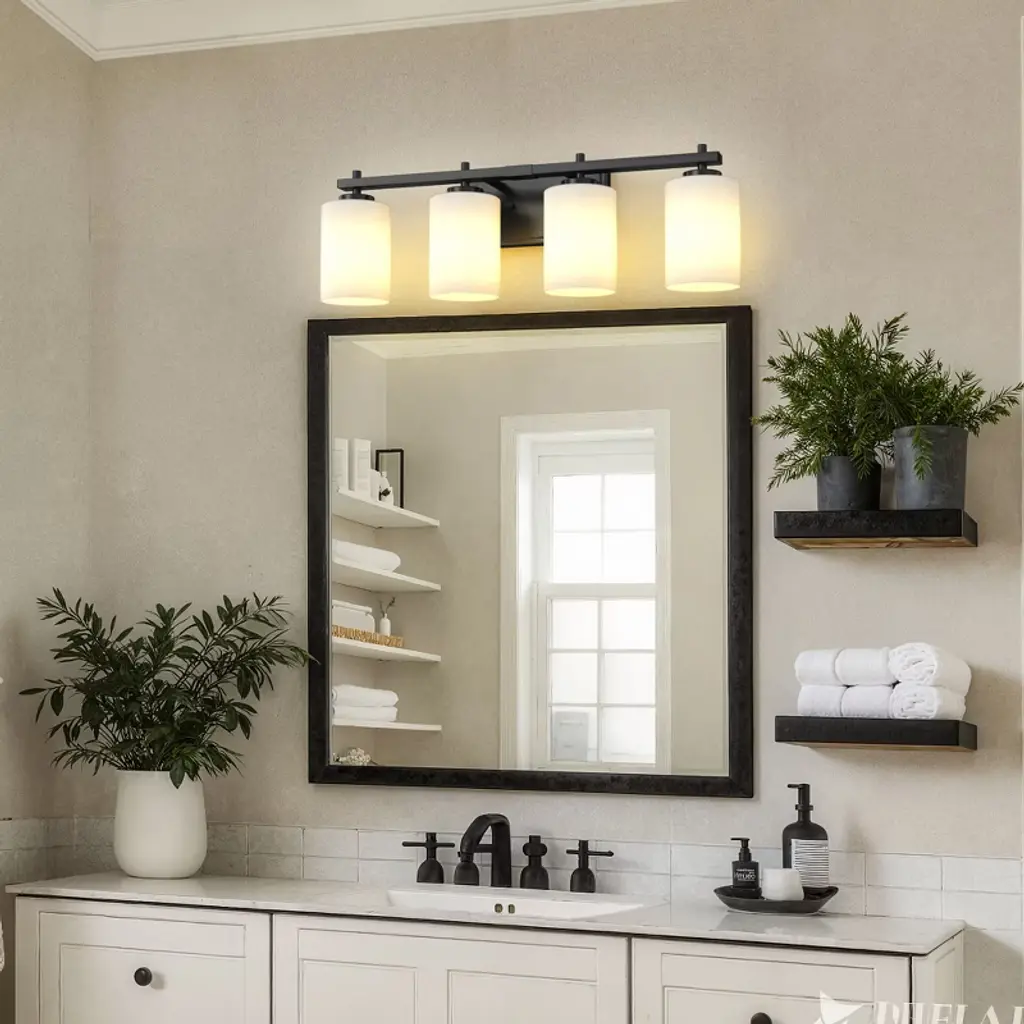 Doresshop Modern 4-light Vanity Wall Lamp, Black Finish With Opal Glass Shade, Perfect For Bathroom, Bedroom, And Dressing Mirror