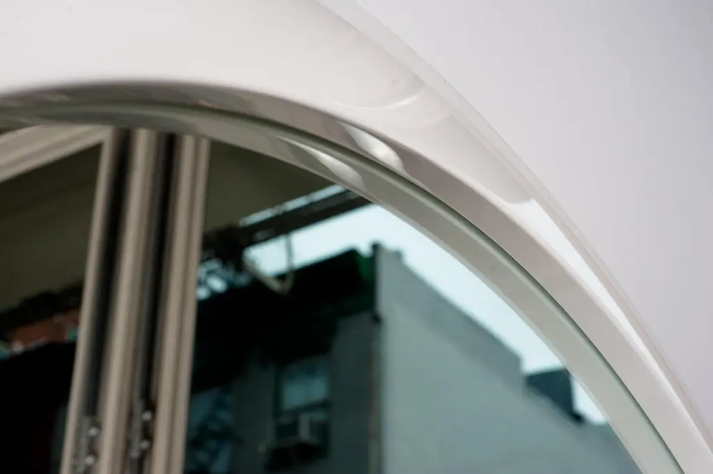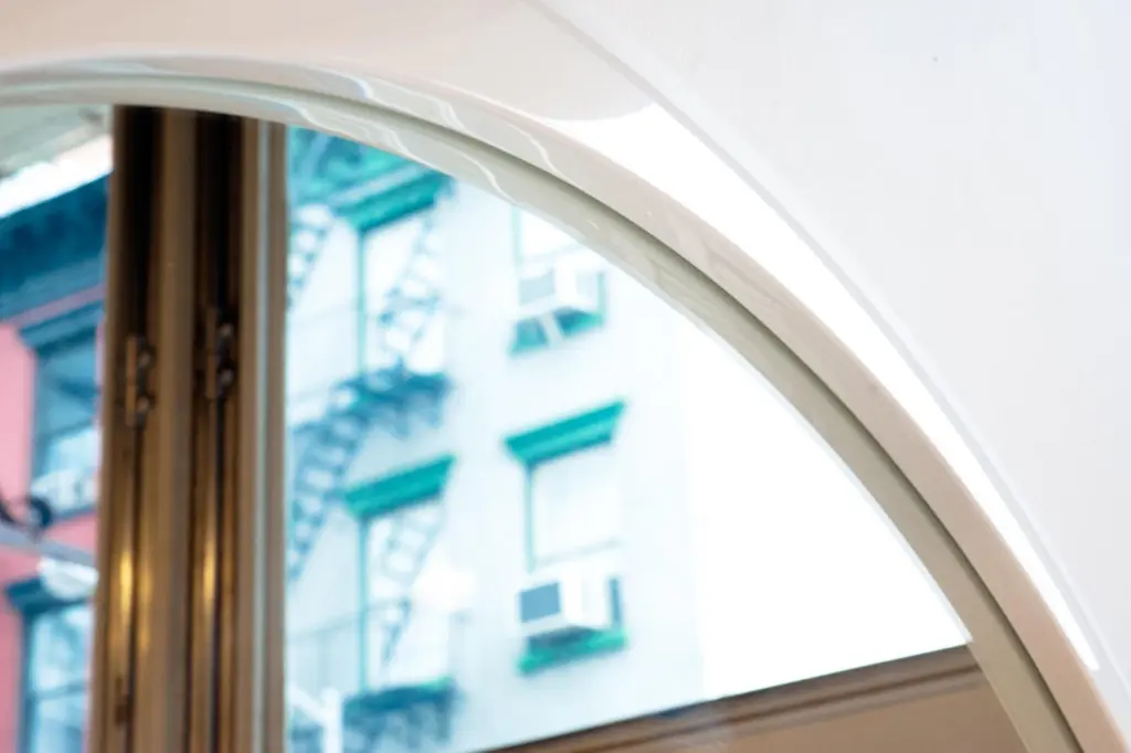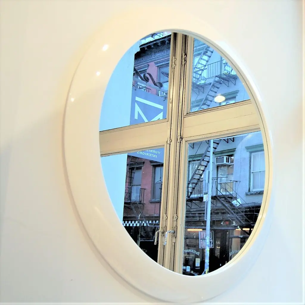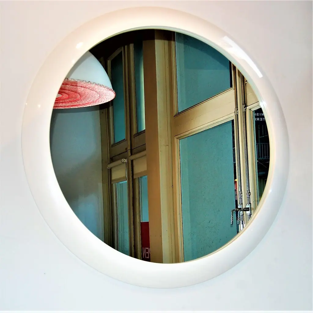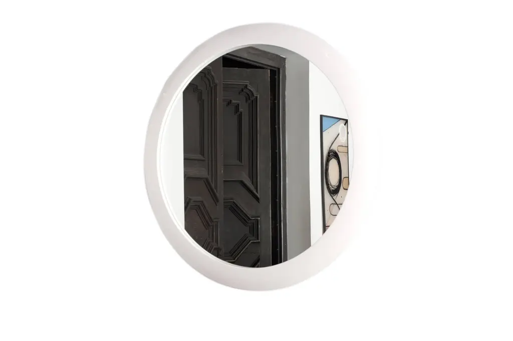 This handcrafted circular mirror is a great piece for any wall, as the balance between glass and frame is proportionally stunning while the frame itself seems to melt right into the wall.