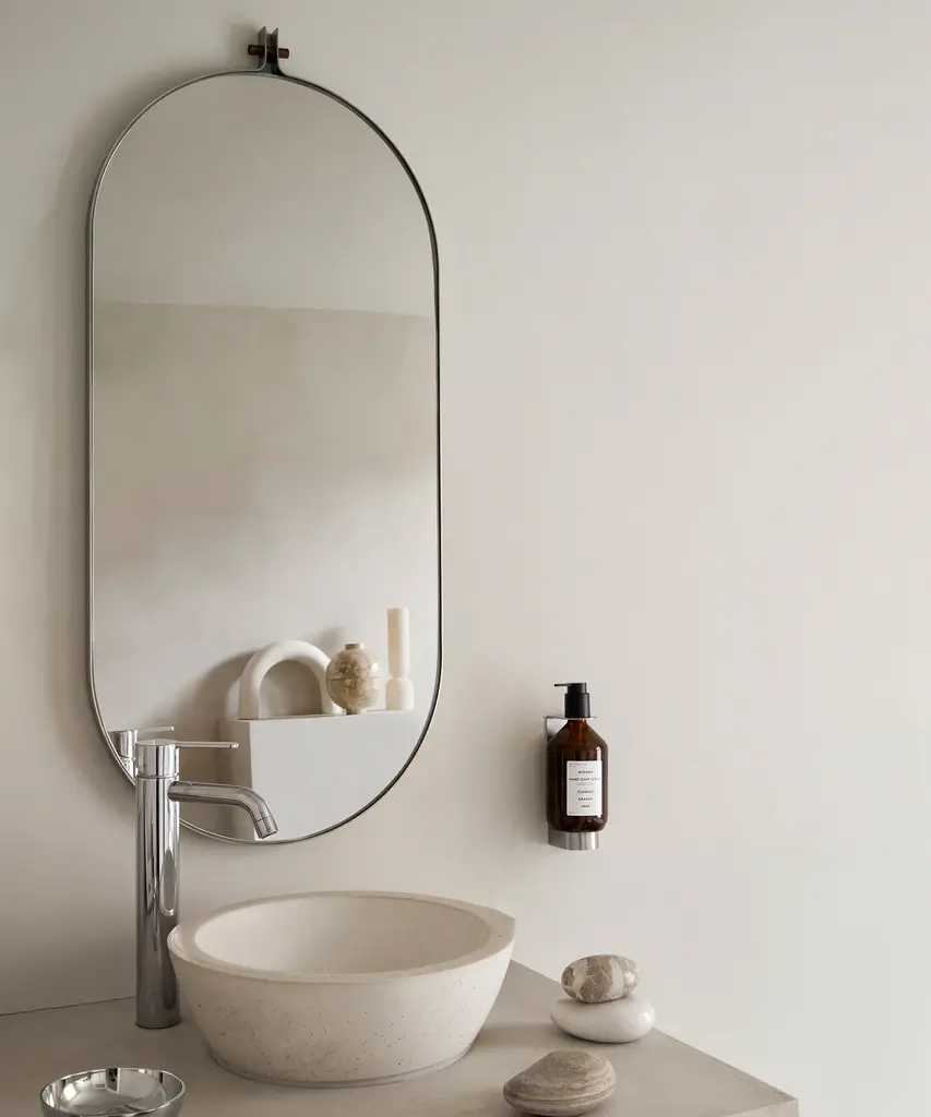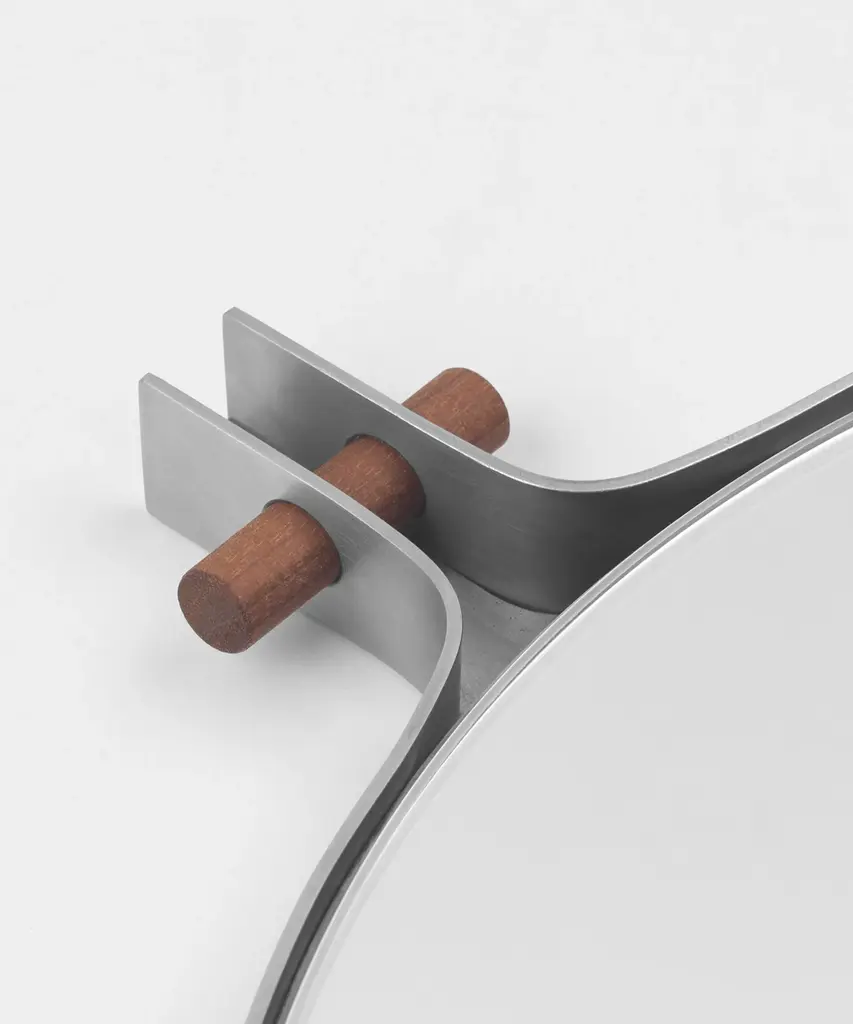 The Dowel mirror is minimalism at its finest – a proponent of the evident beauty in simplicity, and the evident strength in honest design. A mirror sleekly framed in steel, centered with a walnut plug, suitable for your bedroom, bathroom, or your preferred space for reflection.Designed by Kristina Dam Studio in Copenhagen, Denmark.