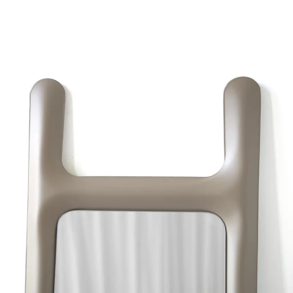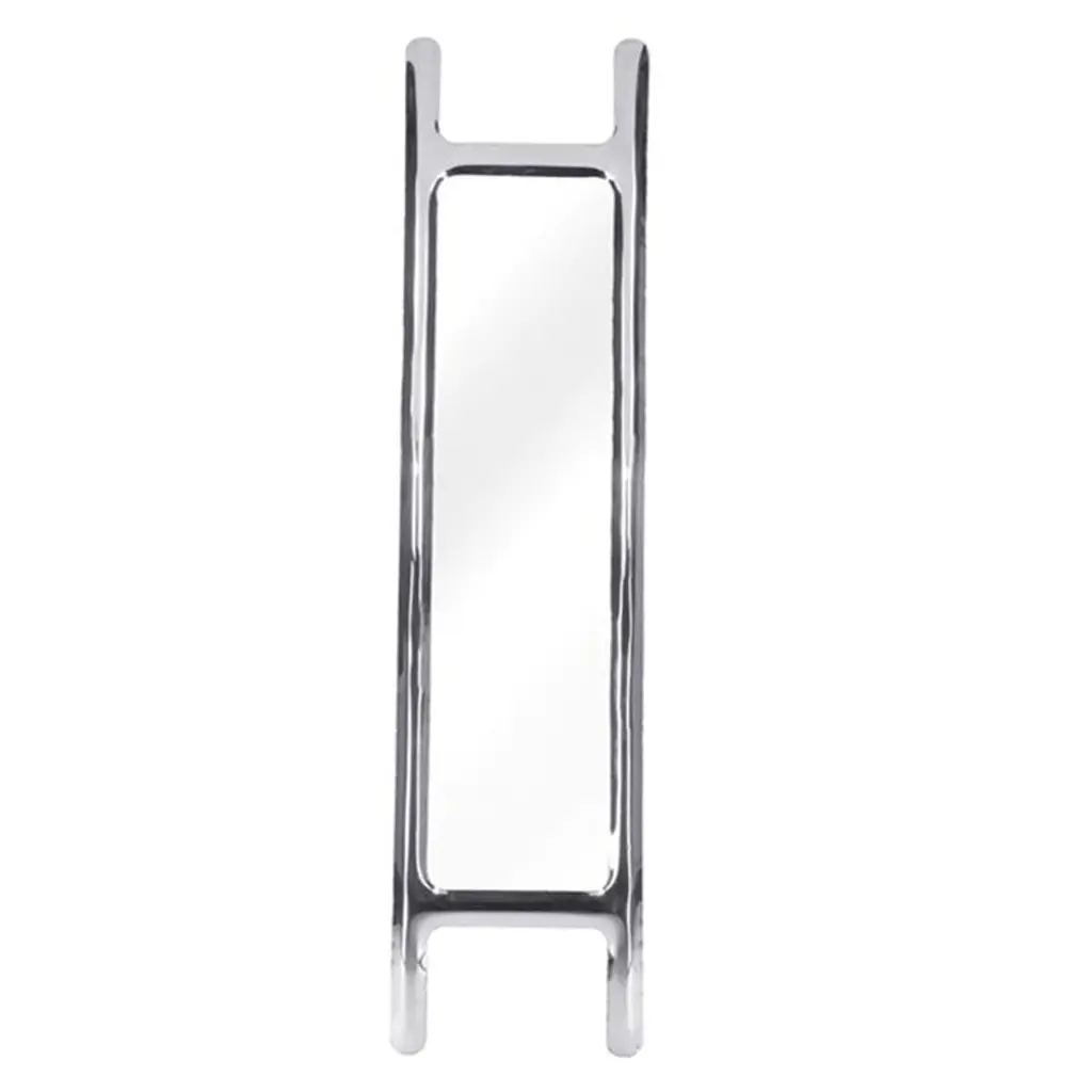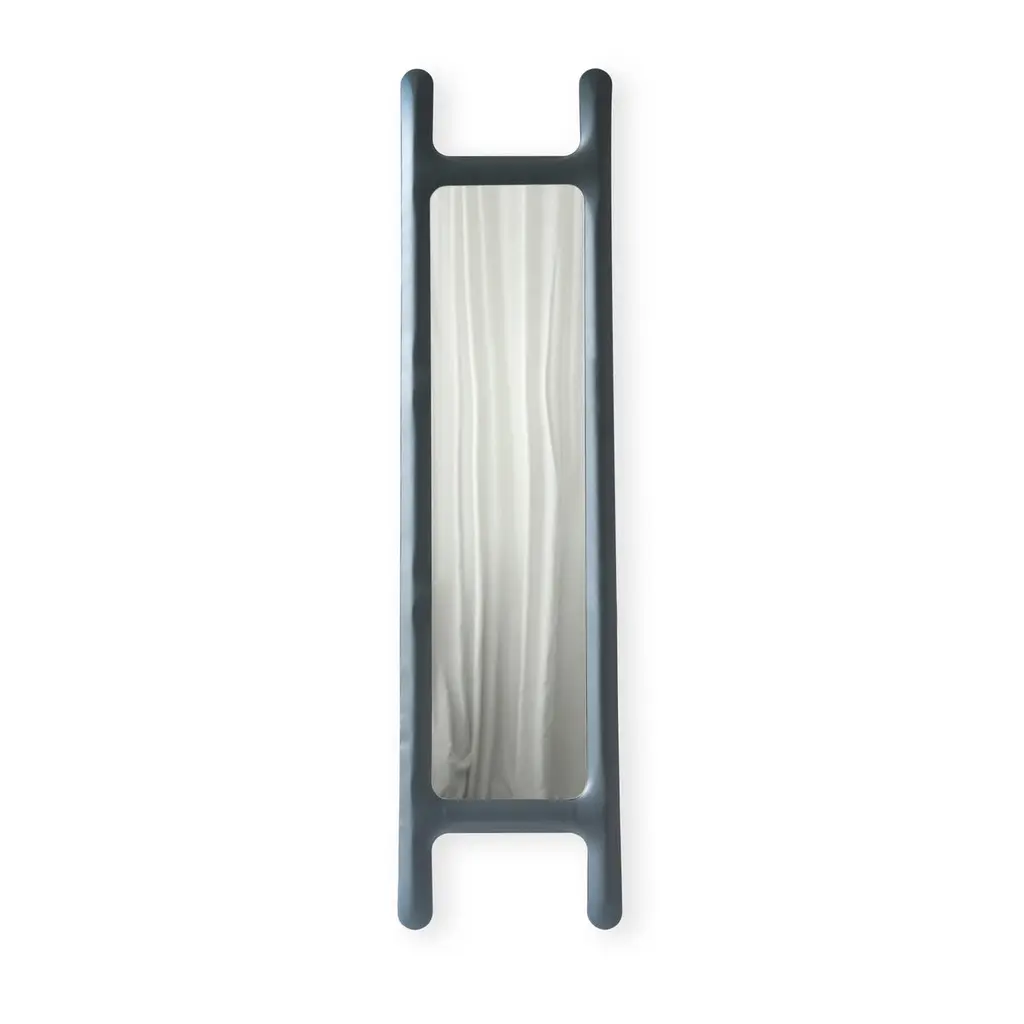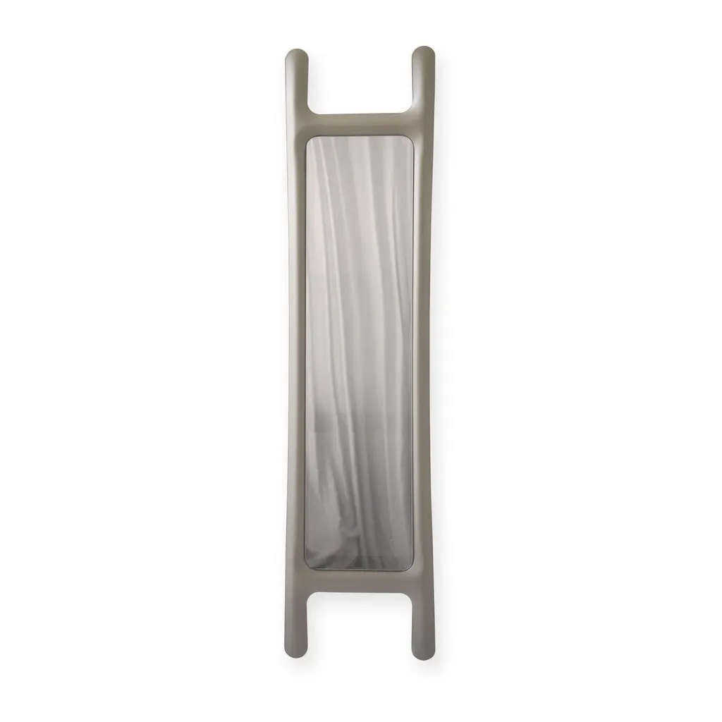 Drab mirror by Zieta BeigeColored steel (black, white or grey) or stainless steel (inox).Measures: 188 x 46 x 6 cm.Zieta is best known for his collection of stools “Plopp” made through the technologist Fidu. With the same principle Zieta Prozessdesign conceived mirror collections made of stainless steel called “Tafla”, “Rondo” and “Rondel”. Two laser-cut metal sheets are first welded together before air is injected between them until they separate from each other forming a three-dimensional object.The steel H-like shaped DRAB mirror can act its role in the bedroom or in the bathroom. It will serve perfectly as the finishing touch in a modern or classical hallway. It is a perfect decorative object for private and public spaces such as hotel rooms or spa parlours. Depending on its finish, DRAB changes its optical weight, so it can define or supplement the interior. In corridors, Zieta Studio recommends a KAMM hanger next to DRAB, as they work together to unravel the intriguing wall dialogue.