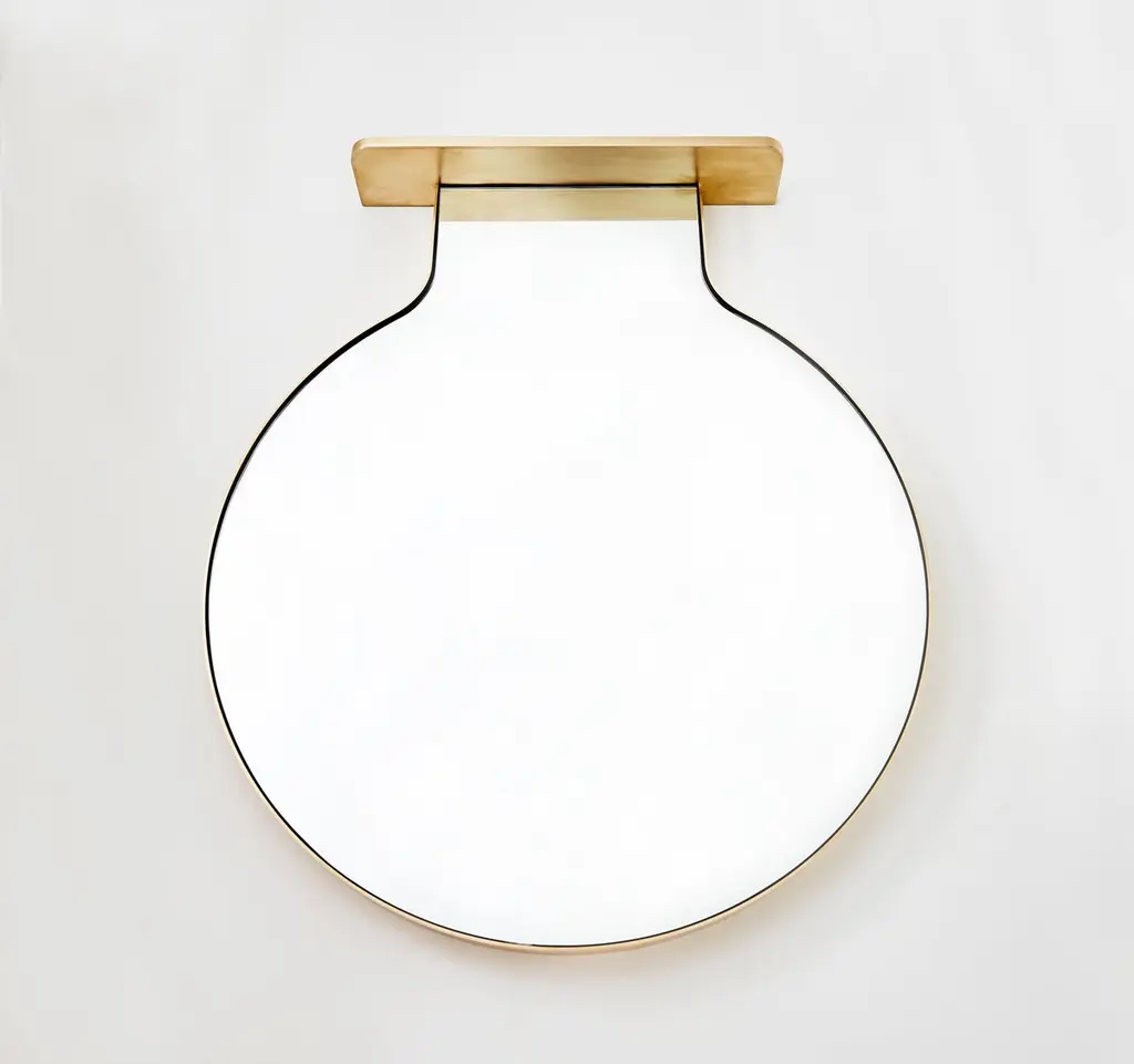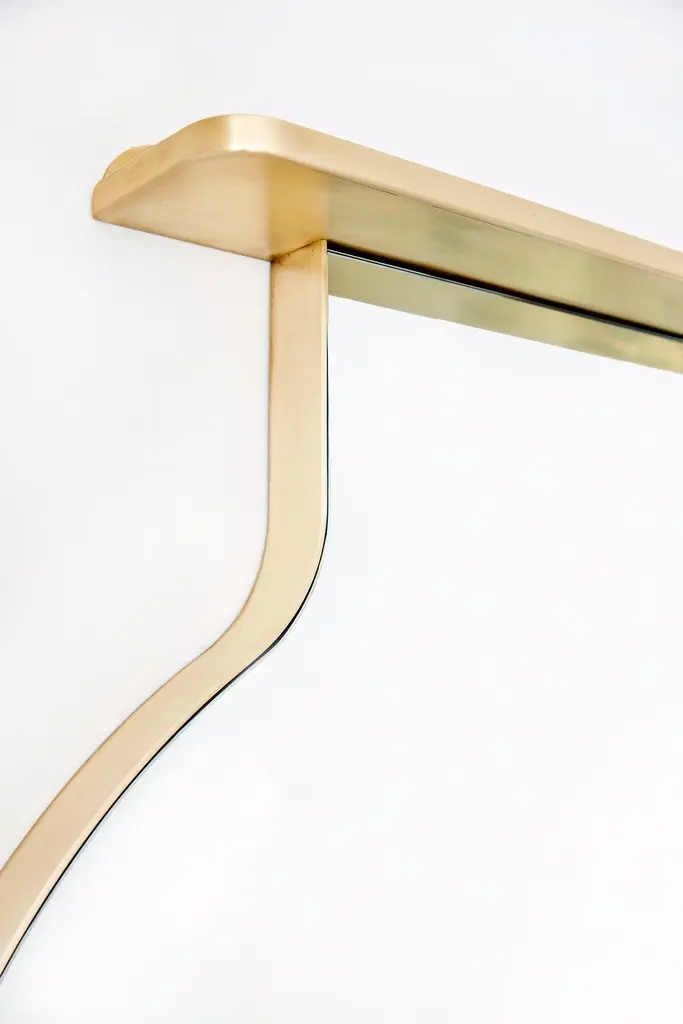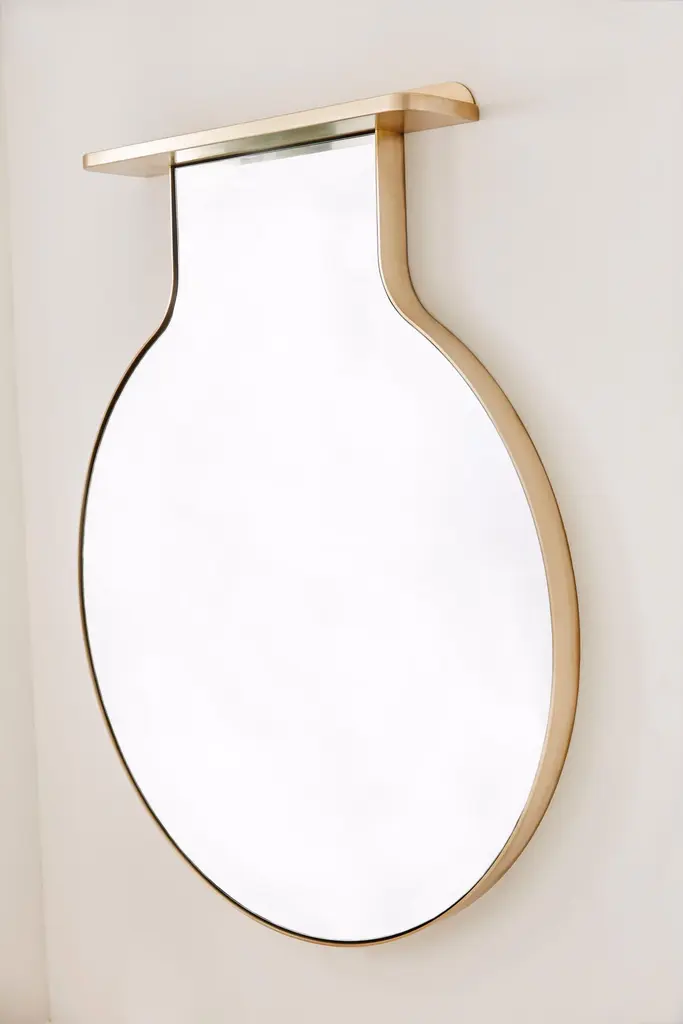 Evan Cranes "Drip Drop Mirror" is an elegant and minimal wall-mounted mirror with unique shelf storage. It is intended to be a feature piece in the home that's both functional and sculptural. Evan hand forms the thin bronze bar perimeter into an iconic "Drop" shape. "It was important to keep the materials to a minimum so that one could focus attention on the dynamic shape". The story of the "Drop" was especially significant to Evan, " I wanted to capture a specific moment in the life of the Drop, not the traditional tear shape but the moment before the drop falls. There is an amazing amount of tension bound up in that particular form. It is fluid, and singular at the same time, part of the whole but with its own individual personality at the same time".