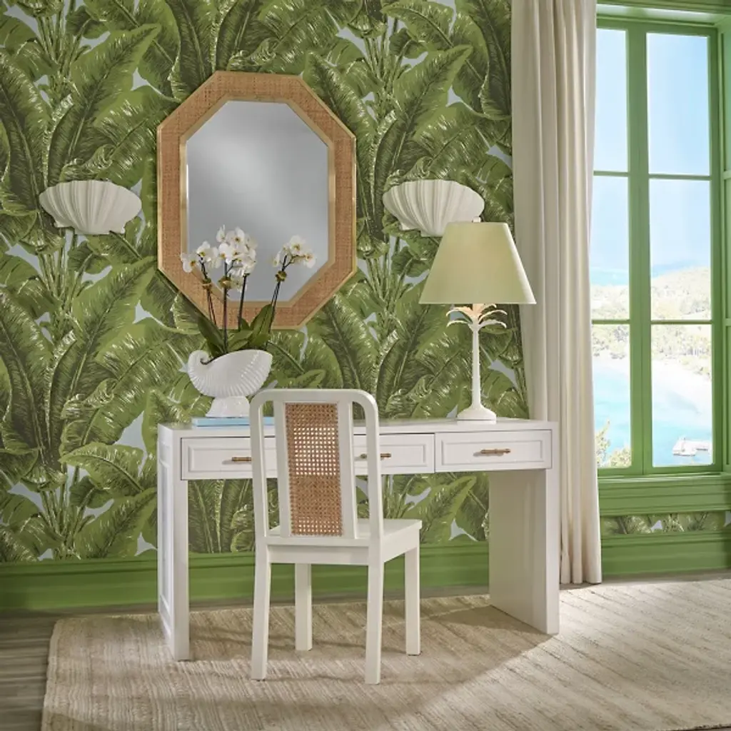 The Dunbar Mirror from Wildwood cuts an octagonal form framed by woven cane work and brass trim details. The geometric mirror shape creates clean angles, while cane weaving softens the overall appearance through natural texture. Brass elements provide structural definition around the octagonal perimeter, creating metallic contrast against organic cane patterns. The elongated octagonal format offers unique proportional relationships that differ from standard rectangular mirrors. Handwoven cane work brings traditional craft techniques into contemporary mirror design