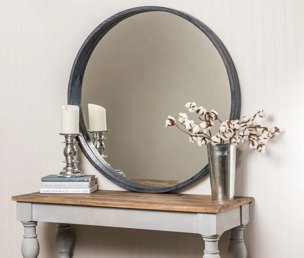 Finished in gray with white undertones, this beveled mirror's elegant simplicity allows it to work in any room of your home.