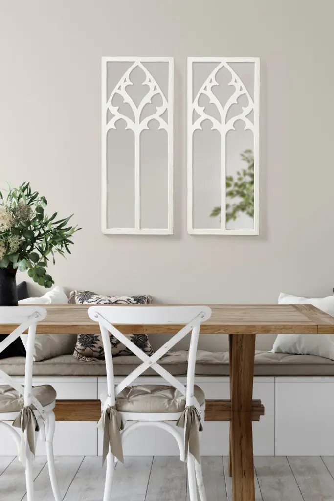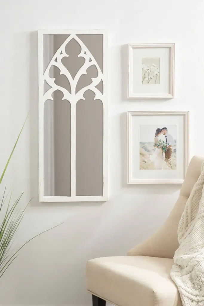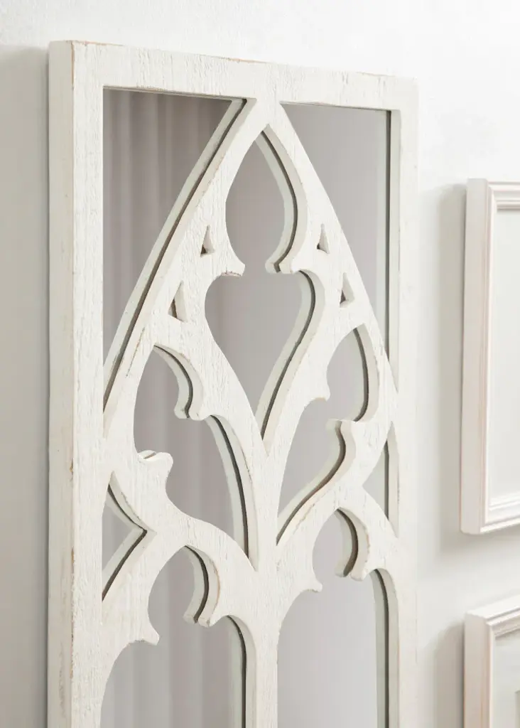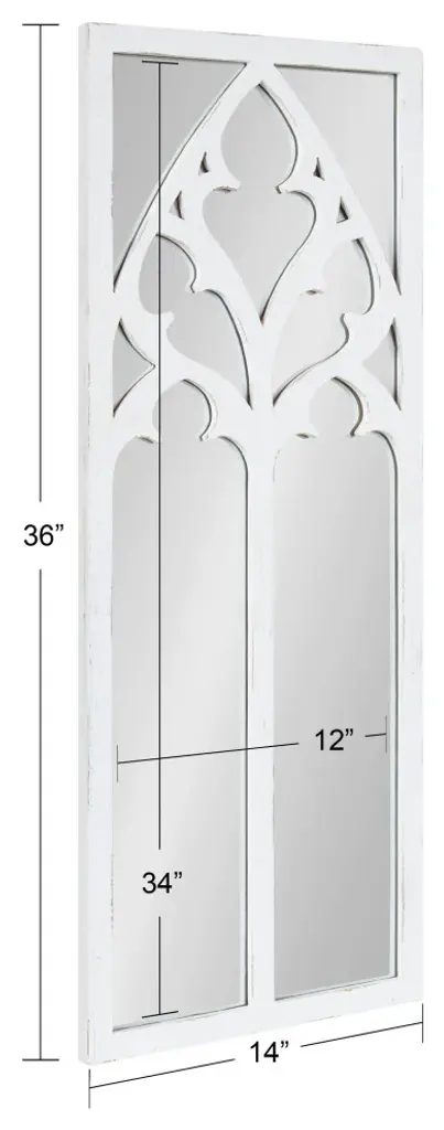 Take pride in your rustic farmhouse or traditional home with the Dutchess wall mirror. The Dutchess features a cathedral-like arched inlay inspired by charming, traditional farmhouse aesthetics. This bold cathedral overlay separates individual panes and gives it that vibrant windowpane look. Along with its inlay, the frame has a genuine wood construction, providing an added resiliency for years of use and display. As a decorative accent mirror, it''s fantastic for showcasing your antique style while also illuminating your space with its reflective glass. The Dutchess wall mirror looks great in any room scene, showcasing classic beauty amongst your farmhouse or traditional living room, bedroom, dining room, or entryway decor. Its overall display dimensions are 14 inches wide by 36 inches tall, making it an oversized accent that will draw the eye of any guest. Hang it on its own or multiples to create a beautiful wall display. Each Dutchess mirror hangs in seconds with the easy-to-use sawtooth hangers attached to the back of the wooden frame.• Traditional Look: Inspired by farmhouse aesthetics, the Dutchess wall mirror features a windowpane-like look, with an arched overlay with a lovely cathedral-inspired design for a decorative vintage vibe• Quality Materials: The sophisticated ornate frame has a robust wooden construction to create a resilient wall accent that will last for generations• Large Mirror: The overall display dimensions of this lovely arched mirror are 14 inches wide by 36 inches tall with a 1-inch depth to create a commanding presence on your farmhouse-inspired walls• Versatile: The Dutchess is the perfect accent for creating more light and dimension within your wall decor scheme, enhancing the brightness of your space without interrupting its decorative aesthetic• Easy to Hang: The Dutchess wall mirror hangs on your wall in seconds with the easy-to-use metal D-ring hangers attached to the back of the arched back
