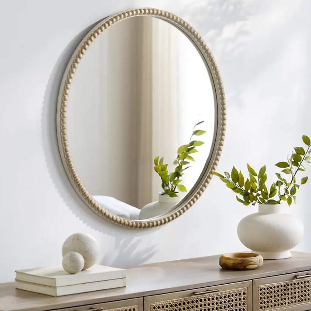 The Dwarka Round Mirror from Surya reimagines traditional style with a fresh perspective. Crafted from manufactured wood with an antiqued finish, this circular piece exudes timeless appeal while feeling decidedly current. Its intricately detailed frame and the classic round shape work beautifully above consoles, mantels, or vanities. This mirror enhances spaces with its subtle sophistication. Its modest elegance and versatile design make it an enduring accent piece that enhances the overall aesthetic of any room.