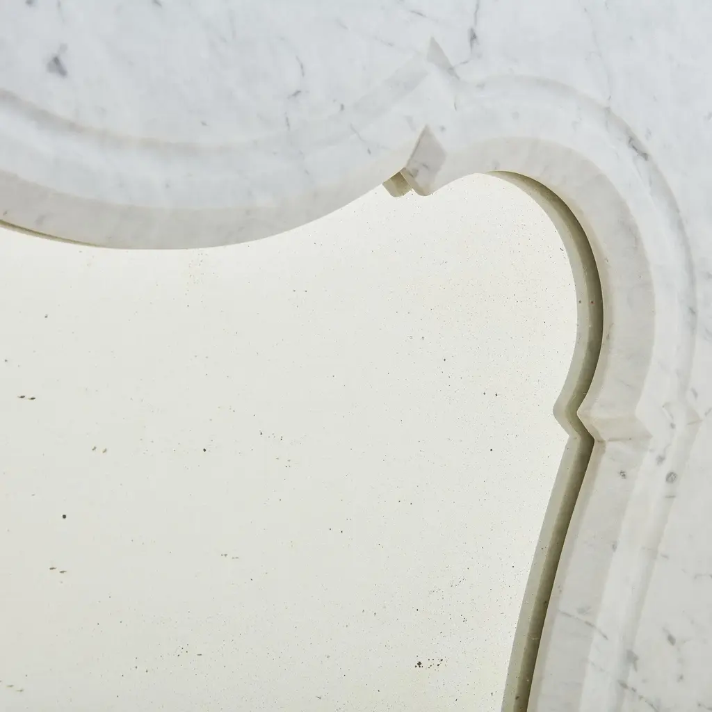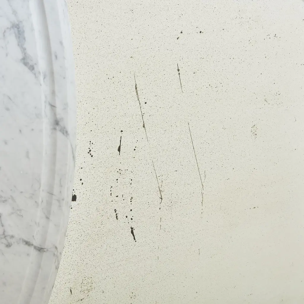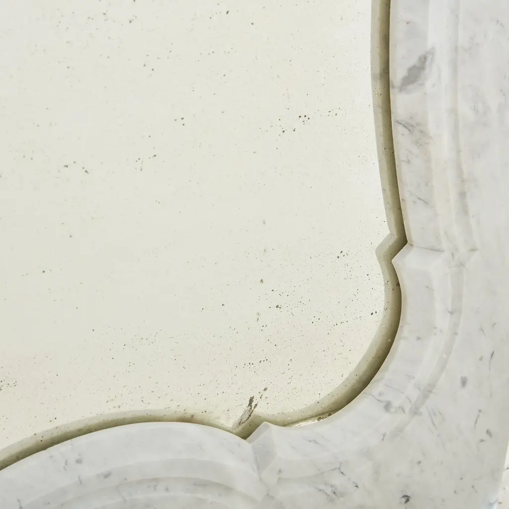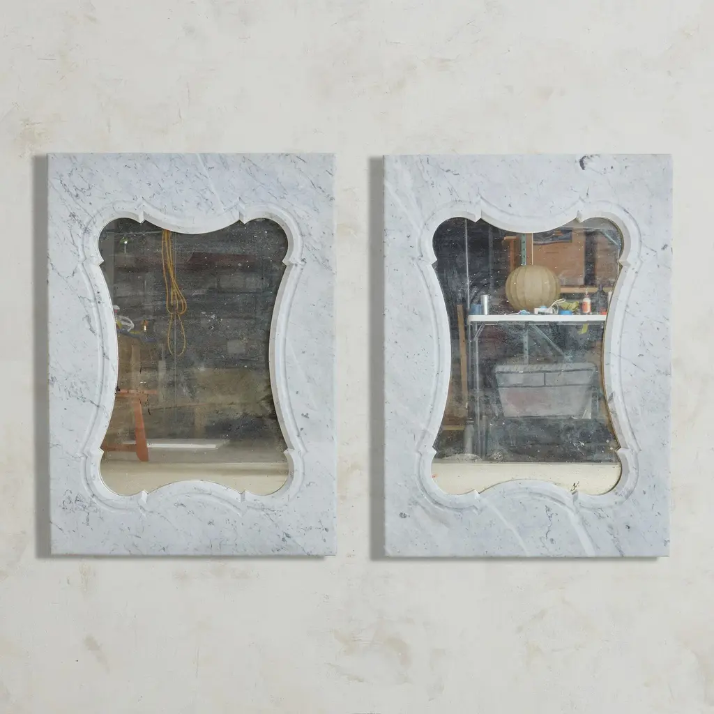 Sourced in the South of France, this Carrara marble mirror came from a Bistro in the region. It appears to be from the early part of the 1900’s. Originally it had a carved wooden frame surrounding the marble which appeared to be hand crafted; the wood frame was likely custom built to the specifics for the bistro. The marble was hand carved and shows gorgeous detail along the border; a true work of art. Ready to hang with a French cleat. Two are available, priced individually. DIMENSIONS: 39”H x 27.75”W x .75”D