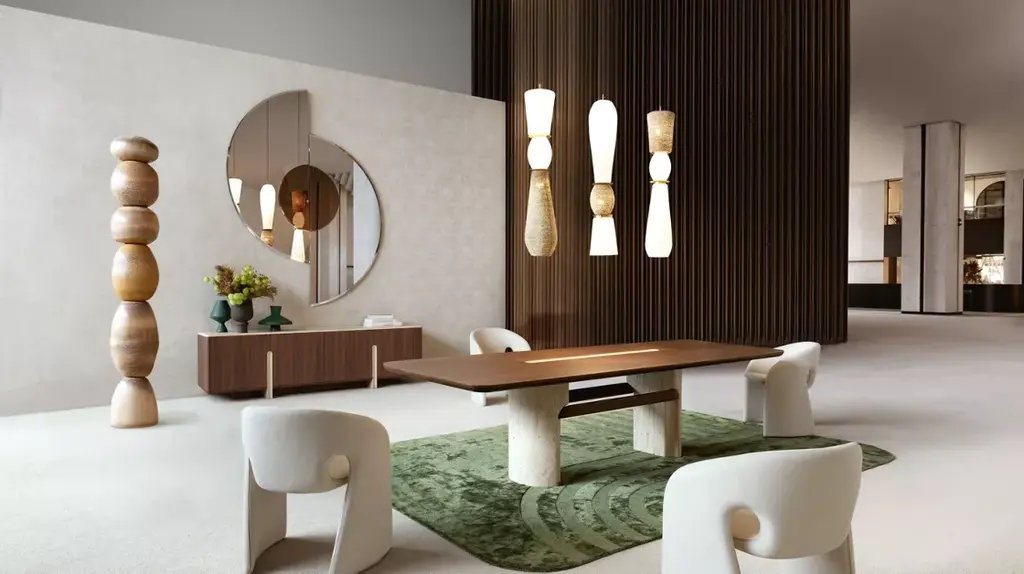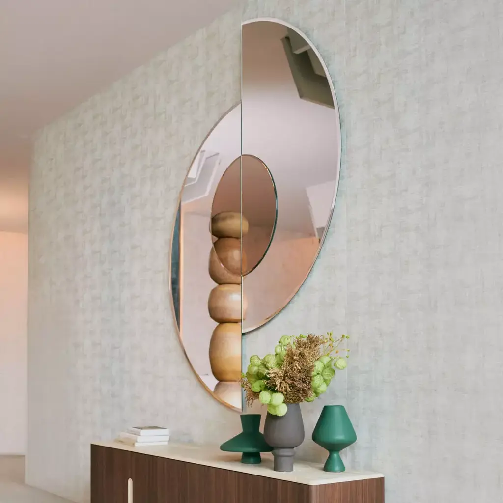 Eclipse is a mirror with generous dimensions and delicate finishes. It consists of a silvered half-oval mirror with a bevelled finish, onto which is delicately affixed a decorative half-circle in bronze mirror symbolizing the passage of one star in front of another. Different presentation combinations are possible: horizontal or vertical, single or double, aligned with the bronze mirror or offset.