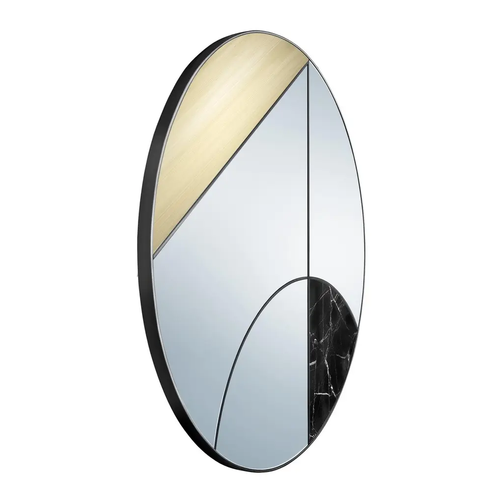 Eclipsis IThe fascinating performance of the moon casting its shadow onto Earth inspired this mirror by Atlasproject. The typical geometries of the design and the refined materials guarantee a seductive and brilliant result, as a tribute to our wonderful Satellite.Materials : Mirror / WoodFrame : Black powder painted IronInserts : Marquinia Marble / Brushed BrassThis item is entirely handmade in our factory using natural materials.Therefore each item is to be considered a uniques pieces: each small varation in color or trimming constitutes an extra value of the craftmade item.