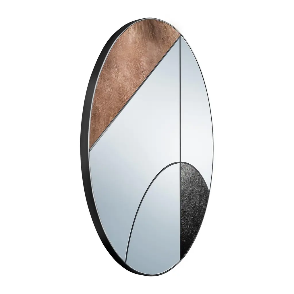 Eclipsis IIIThe fascinating performance of the moon casting its shadow onto Earth inspired this mirror by Atlasproject. The typical geometries of the design and the refined materials guarantee a seductive and brilliant result, as a tribute to our wonderful Satellite.Materials : Mirror / WoodFrame : black powder painted ironInserts : brushed copper / black leatherThis item is entirely handmade in our factory using natural materials.Therefore each item is to be considered a uniques pieces: each small varation in color or trimming constitutes an extra value of the craftmade item.
